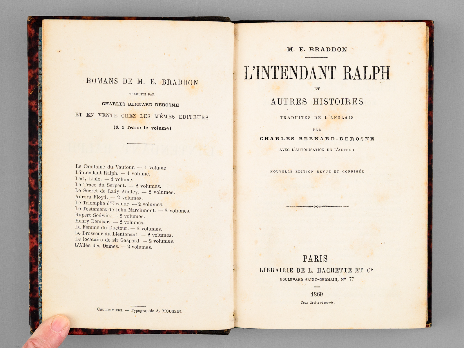 nouvelle édition revue et corrigée, 1 vol. in-12 rel. demi-chagrin brun, dos à 5 nerfs, Librairie de L. Hachette & cie, Paris, 1869, 250 pp. Commentaire : Bon état pour cette édition en français de 'Ralph the Bailiff and C.' (1862). L'auteur, Mary Elizabeth Braddon (1835-1915) était une femme de lettres britannique, devenue célèbre pour ses romans policiers. Edition d'époque, assez peu courante désormais.