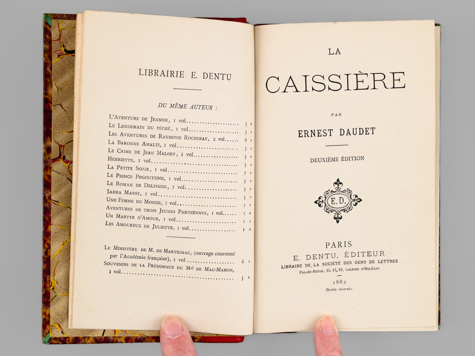 Deuxième édition, 1 vol. in-12 reliure de l'époque demi-chagrin rouge, dos à 5 nerfs dorés orné, E. Dentu, Paris, 1882, 2 ff., 386 pp. Commentaire : Bon état. Frère aîné d'Alphonse Daudet, Ernest Daudet (1837-1921) publia une trentaine de romans. Peu commun
