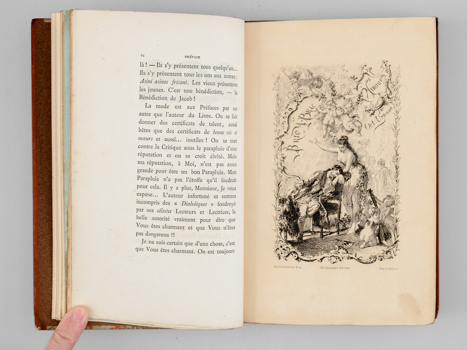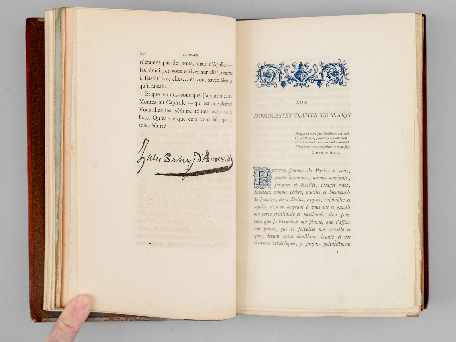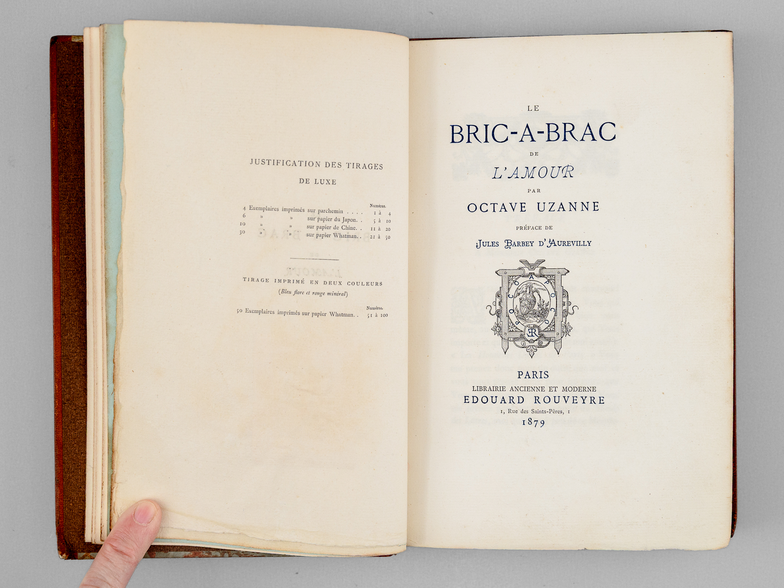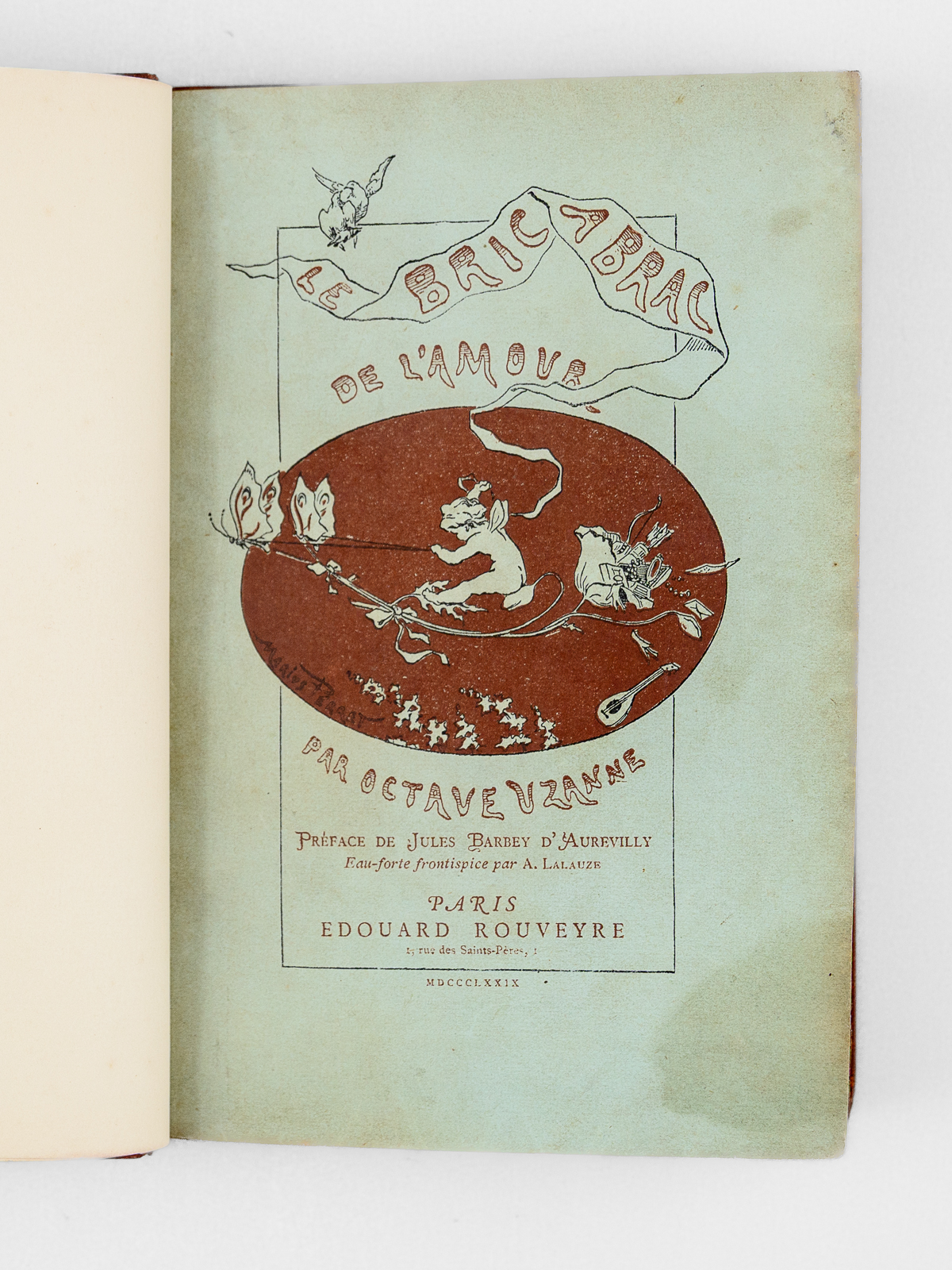 Préface de Jules Barbey d'Aurevilly, 1 vol. petit in-8 reliure demi-maroquin à bande brun, couvertures et dos conservés, Librairie ancienne et moderne Edouard Rouveyre, Paris, 1879, XIV-197 pp. (mal chiffré 177) et 2 ff. Commentaire : Etat très satisfaisant (reliure lég. frottée, ex-libris collée, recto du faux-titre). Vicaire, VII, 920.