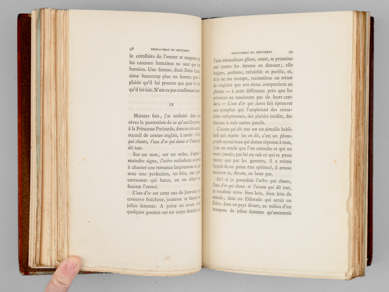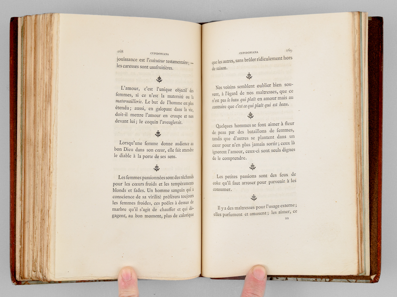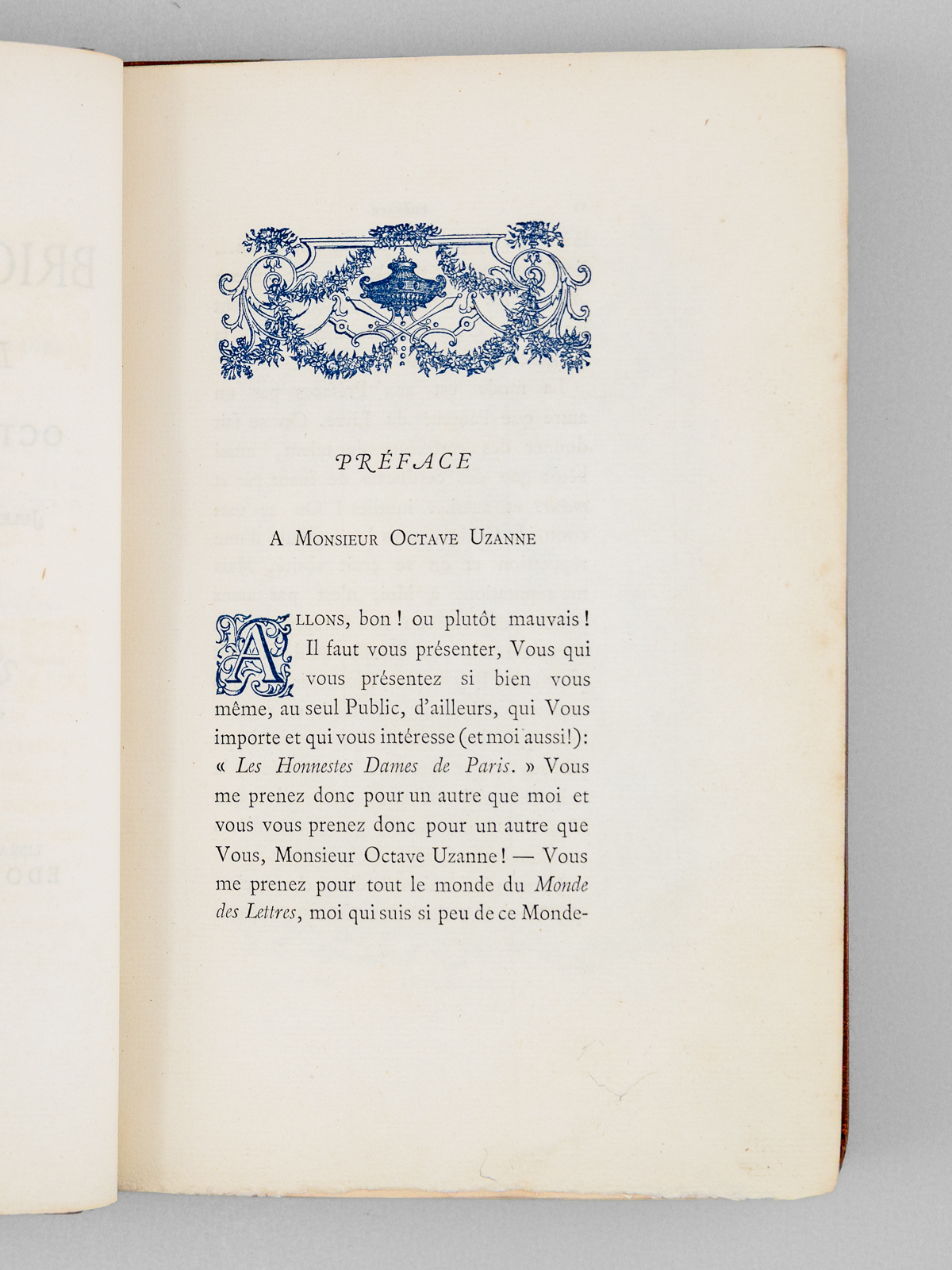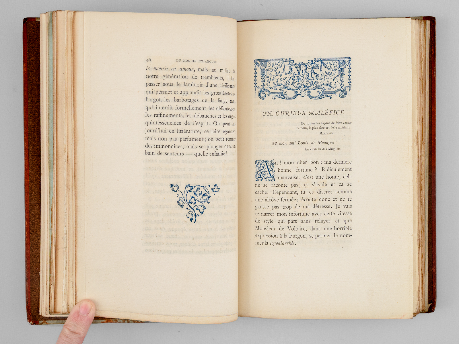 Préface de Jules Barbey d'Aurevilly, 1 vol. petit in-8 reliure demi-maroquin à bande brun, couvertures et dos conservés, Librairie ancienne et moderne Edouard Rouveyre, Paris, 1879, XIV-197 pp. (mal chiffré 177) et 2 ff. Commentaire : Etat très satisfaisant (reliure lég. frottée, ex-libris collée, recto du faux-titre). Vicaire, VII, 920.