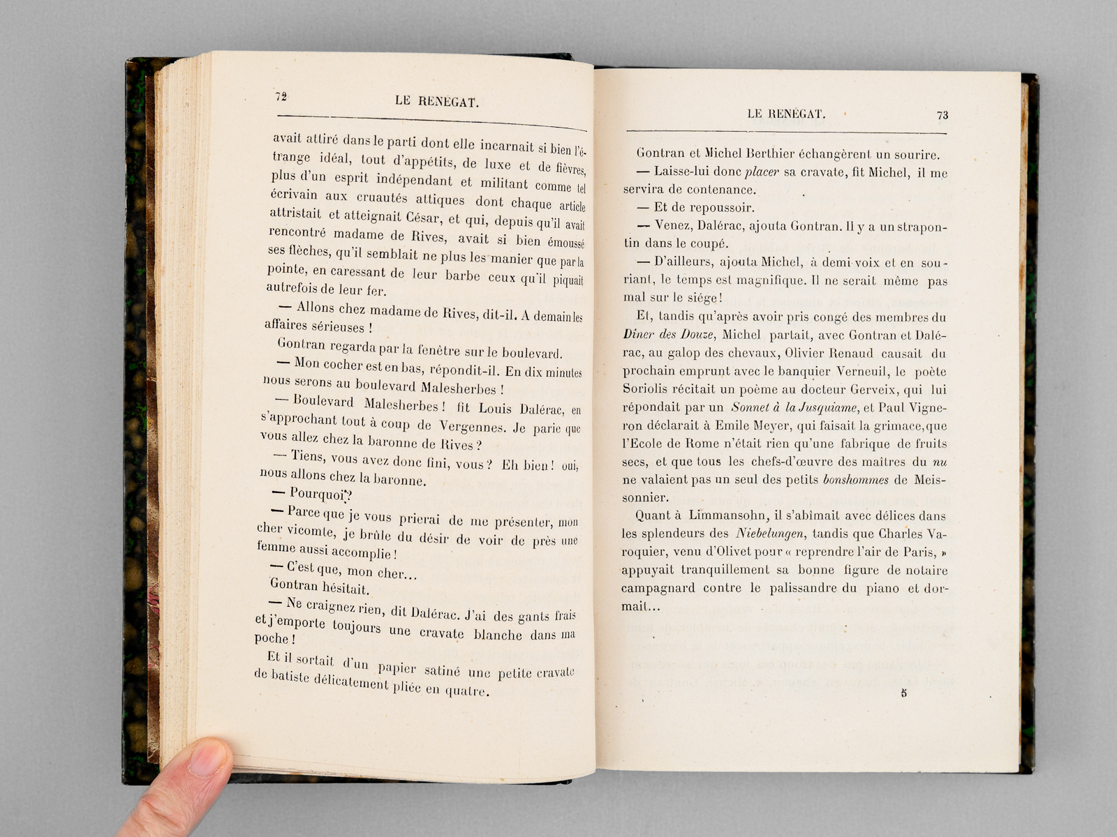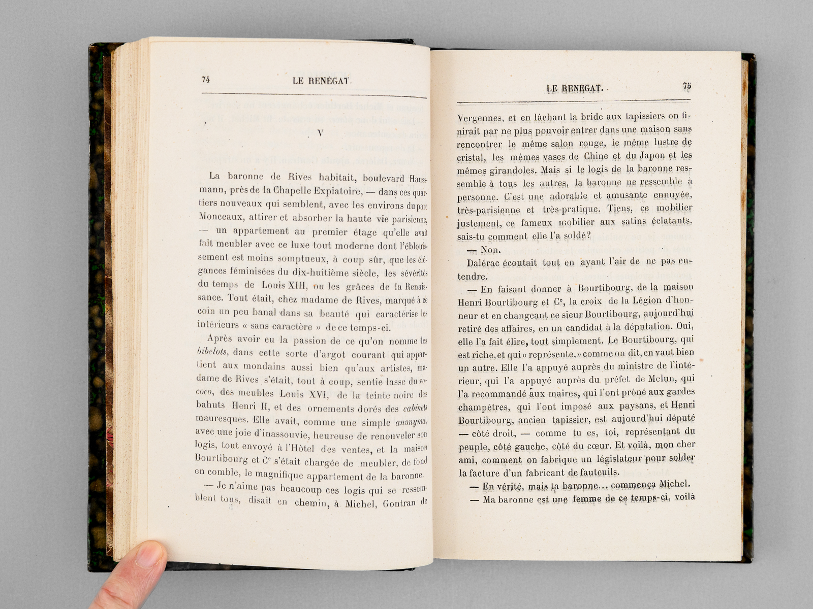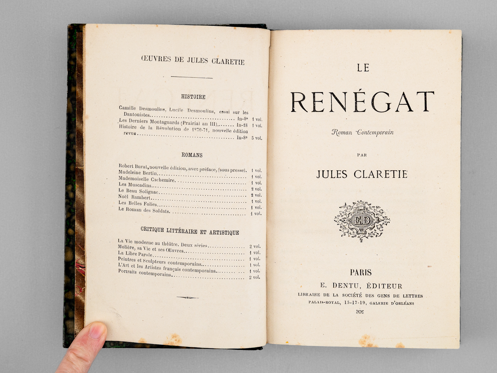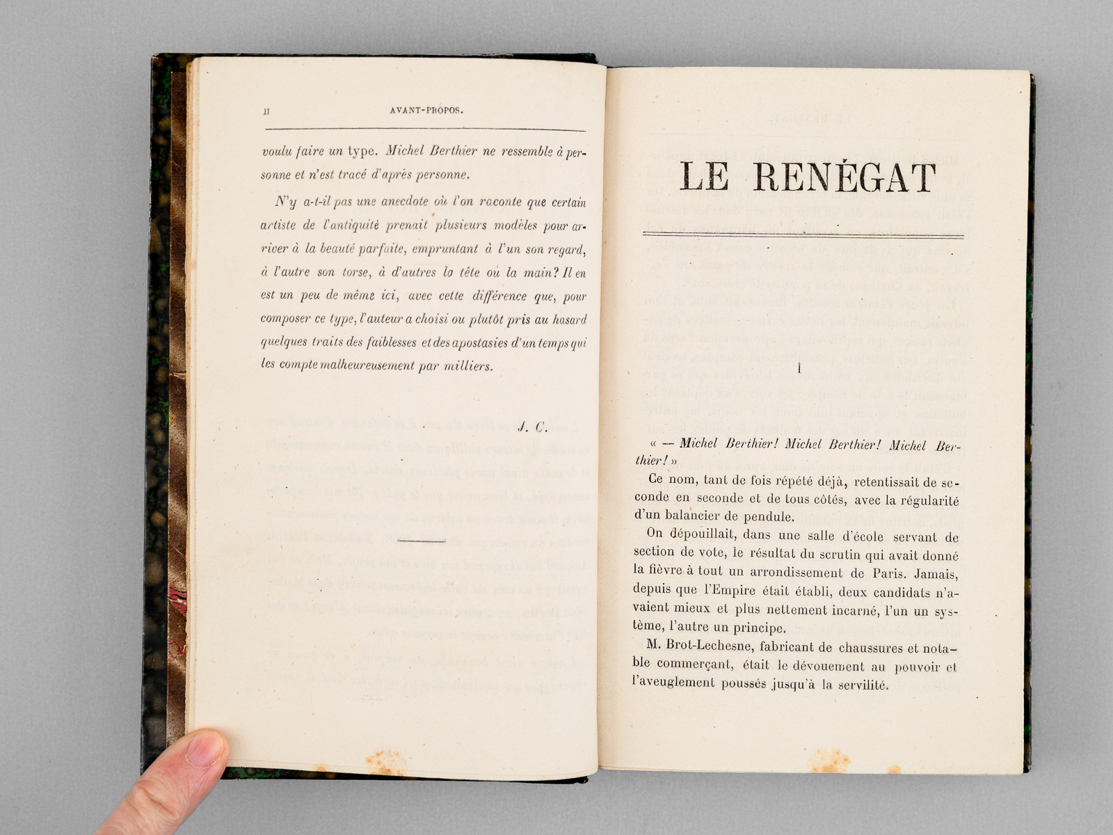 1 vol. in-12 reliure de l'époque demi-chagrin vert, dos à 5 nerfs dorés, E. Dentu, Paris, s.d. [1876 ], 438 pp. Commentaire : Bon état (qq. rouss.) pour l'édition originale de cette étude de moeurs politiques, décrivant l'ascension fulgurante et la chute morale de Michel Berthier, jeune avocat ambitieux élu député de Paris sous le Second Empire. Porté au pouvoir par le parti libéral et les classes populaires, il incarne l'espoir d'une opposition ferme face au régime impérial, mais trahit ses électeurs comme ses amours...