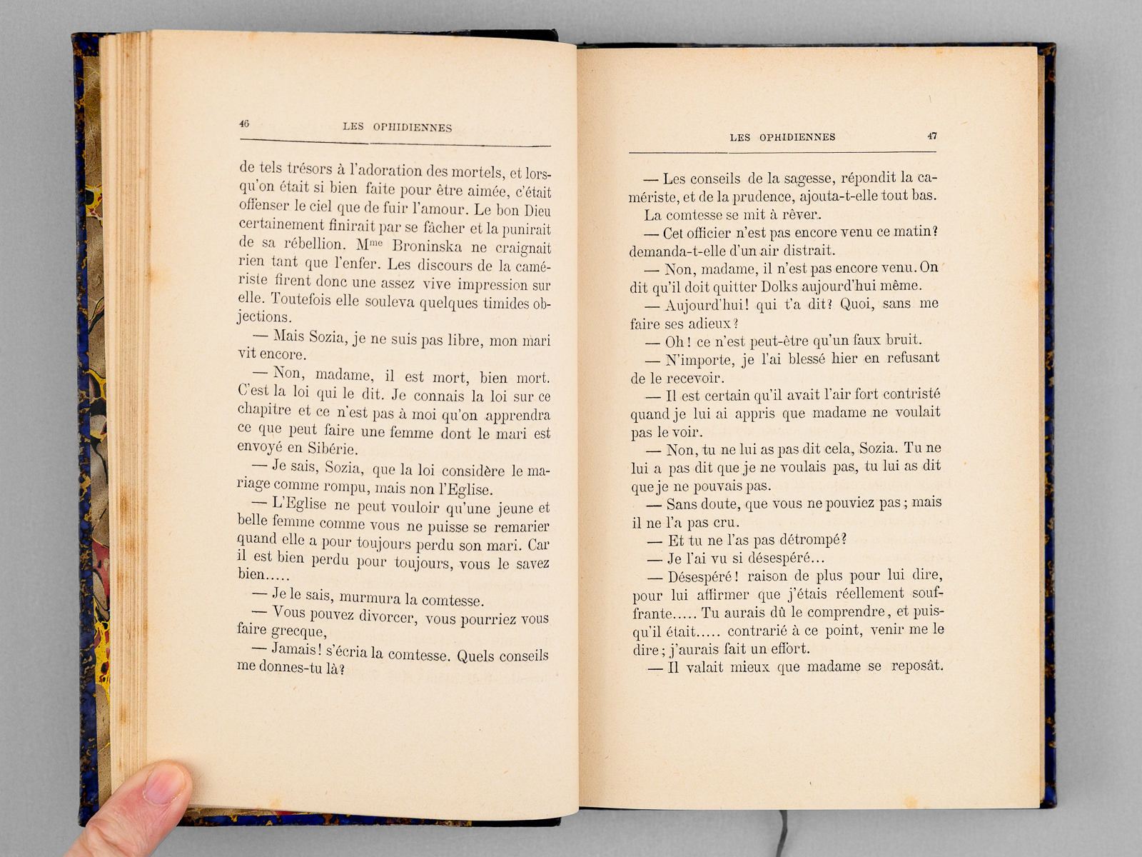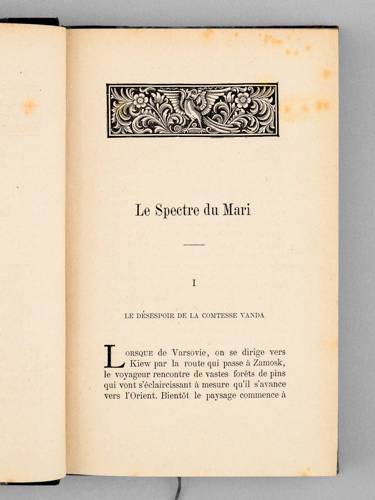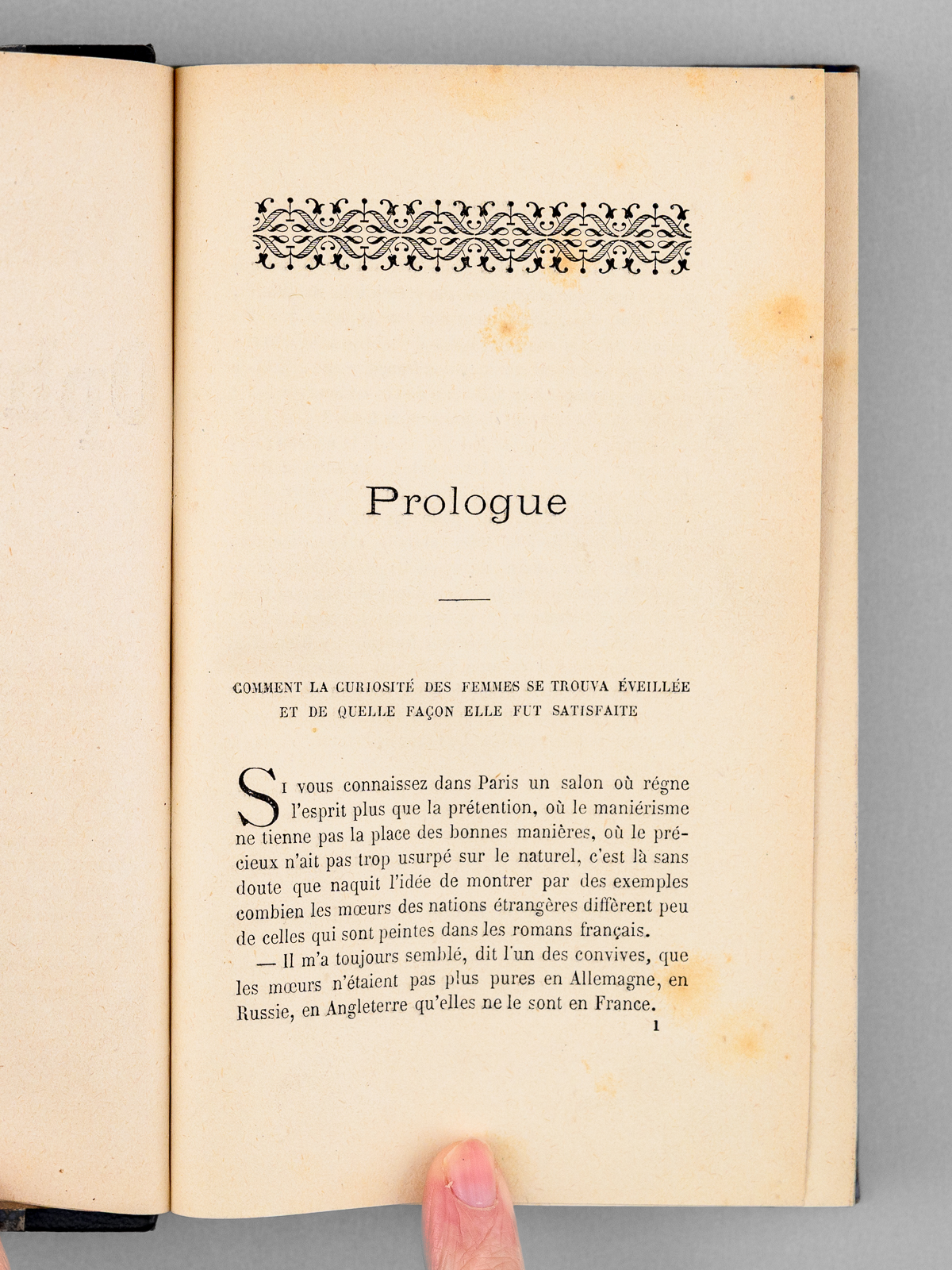 1 vol. in-12 reliure de l'époque demi-chagrin bleu, dos à 5 nerfs, Chez Henry Kistemaerckers, Bruxelles, s.d. [ 1884 ] 343 pp. Commentaire : Rare exemplaire de l'édition originale de ce recueil de nouvelles publié sous pseudonyme par le critique et homme politique Alphonse-Bernard de Calonne (1818-1902). Il fut un traducteur de Tourgueniev et un grand connaisseur de l'Europe et de la Russie, comme le lecteur s'en apercevra vite. Il nous livre ici plusieurs nouvelles 'croustilleuses', pour reprendre les termes d'un critique du temps, et qui ne sont pas sans rappeler par moment le style d'un Barbey d'Aurevilly ou d'un Huysmans. Bon état (rares rouss., infime frott. en mors, très bon état par ailleurs).