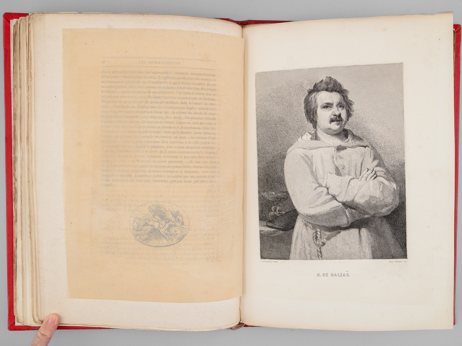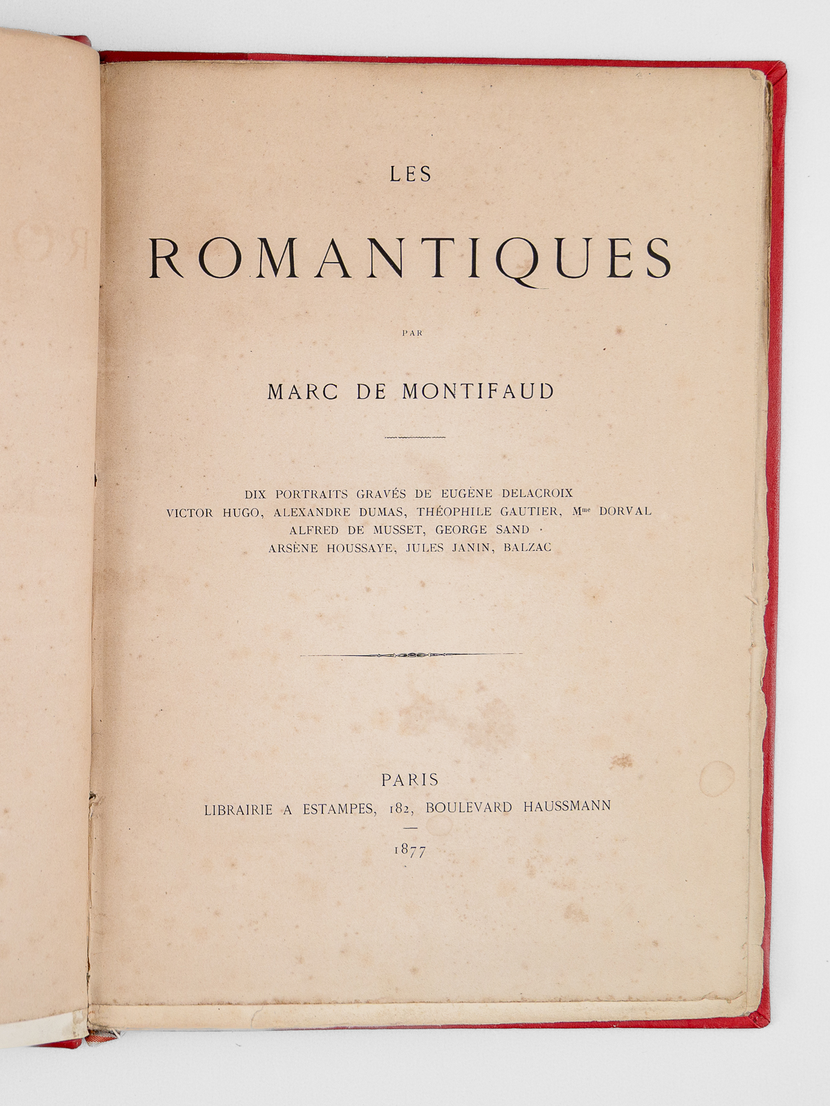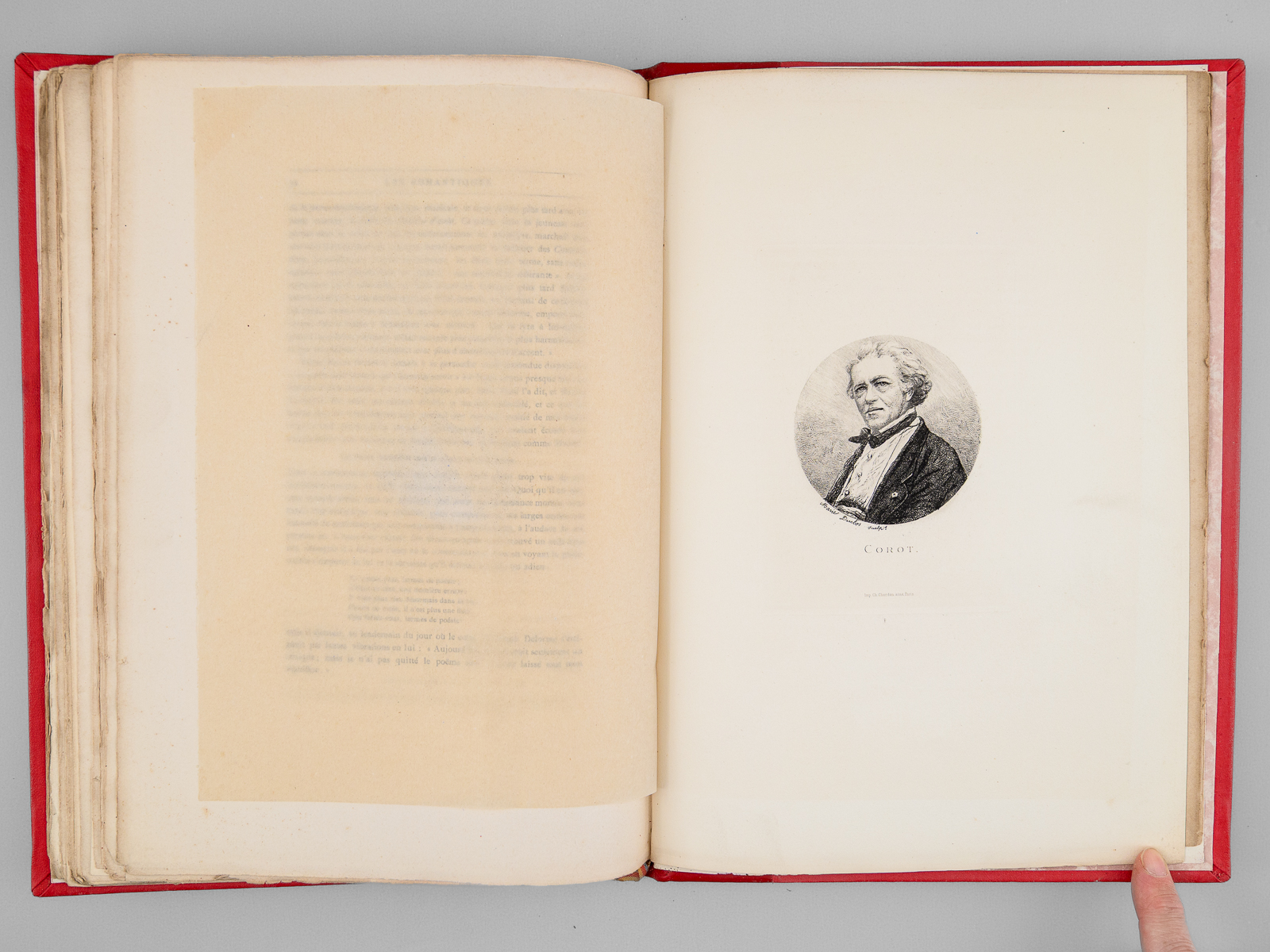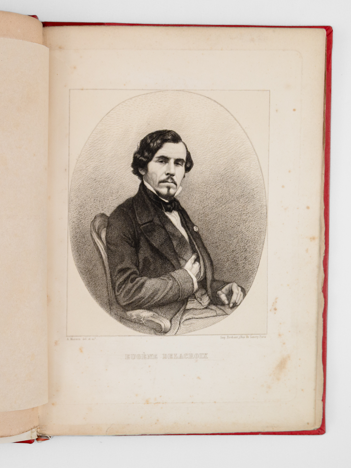 Dix portraits gravés de Eugène Delacroix, Victor Hugo, Alexandre Dumas, Théophile Gautier, Mme Dorval, Alfred de Musset, George Sand, Arsène Houssaye, Jules Janin, Balzac, 1 vol. grand in-4 (33 x 24 cm) reliure postérieure demi-basane rouge, Librairie à Estampes, Paris, 1877, 71 pp. avec 11 portraits hors texte (on trouve en sus celui de Corot)