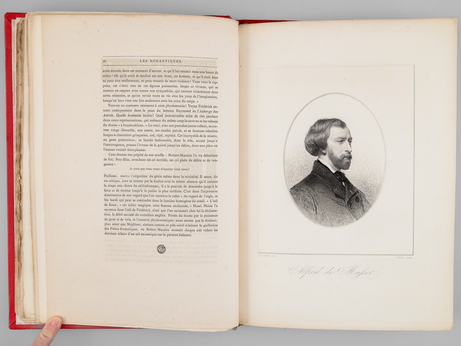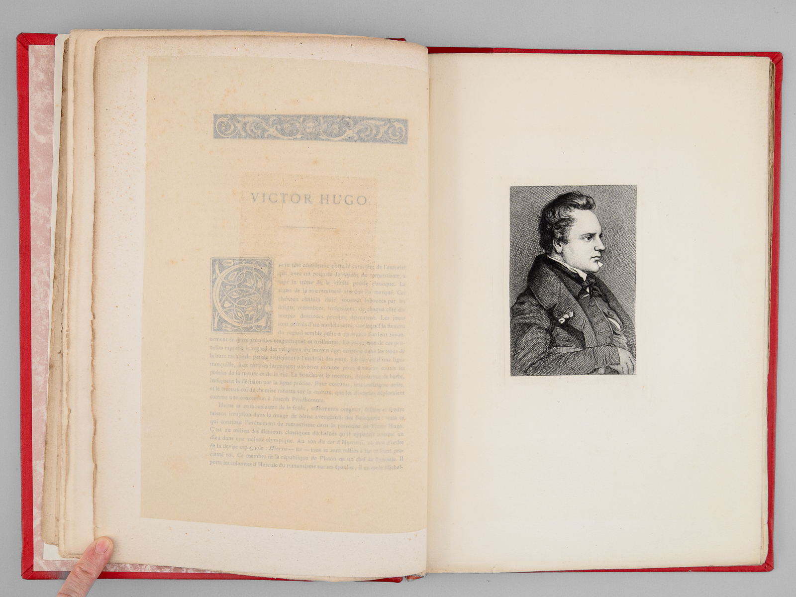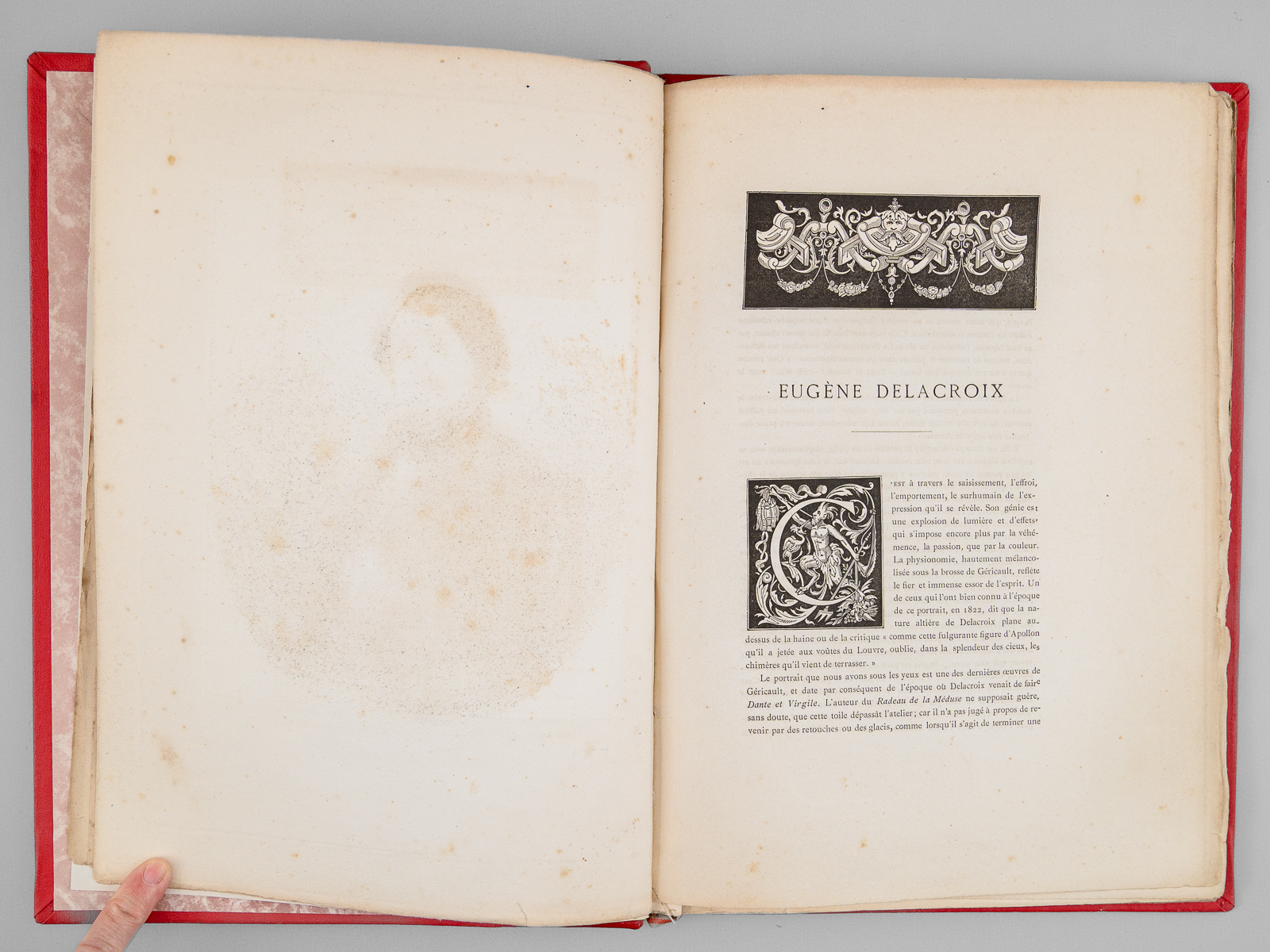 Dix portraits gravés de Eugène Delacroix, Victor Hugo, Alexandre Dumas, Théophile Gautier, Mme Dorval, Alfred de Musset, George Sand, Arsène Houssaye, Jules Janin, Balzac, 1 vol. grand in-4 (33 x 24 cm) reliure postérieure demi-basane rouge, Librairie à Estampes, Paris, 1877, 71 pp. avec 11 portraits hors texte (on trouve en sus celui de Corot)