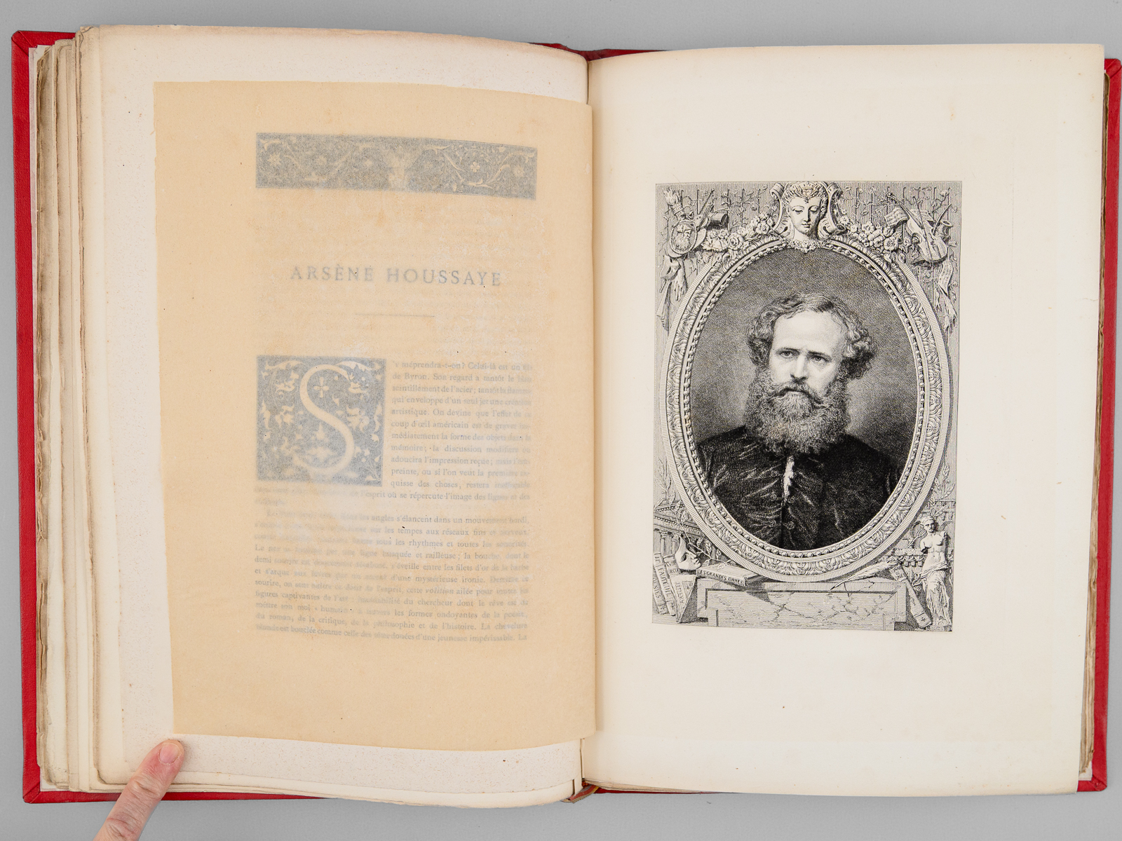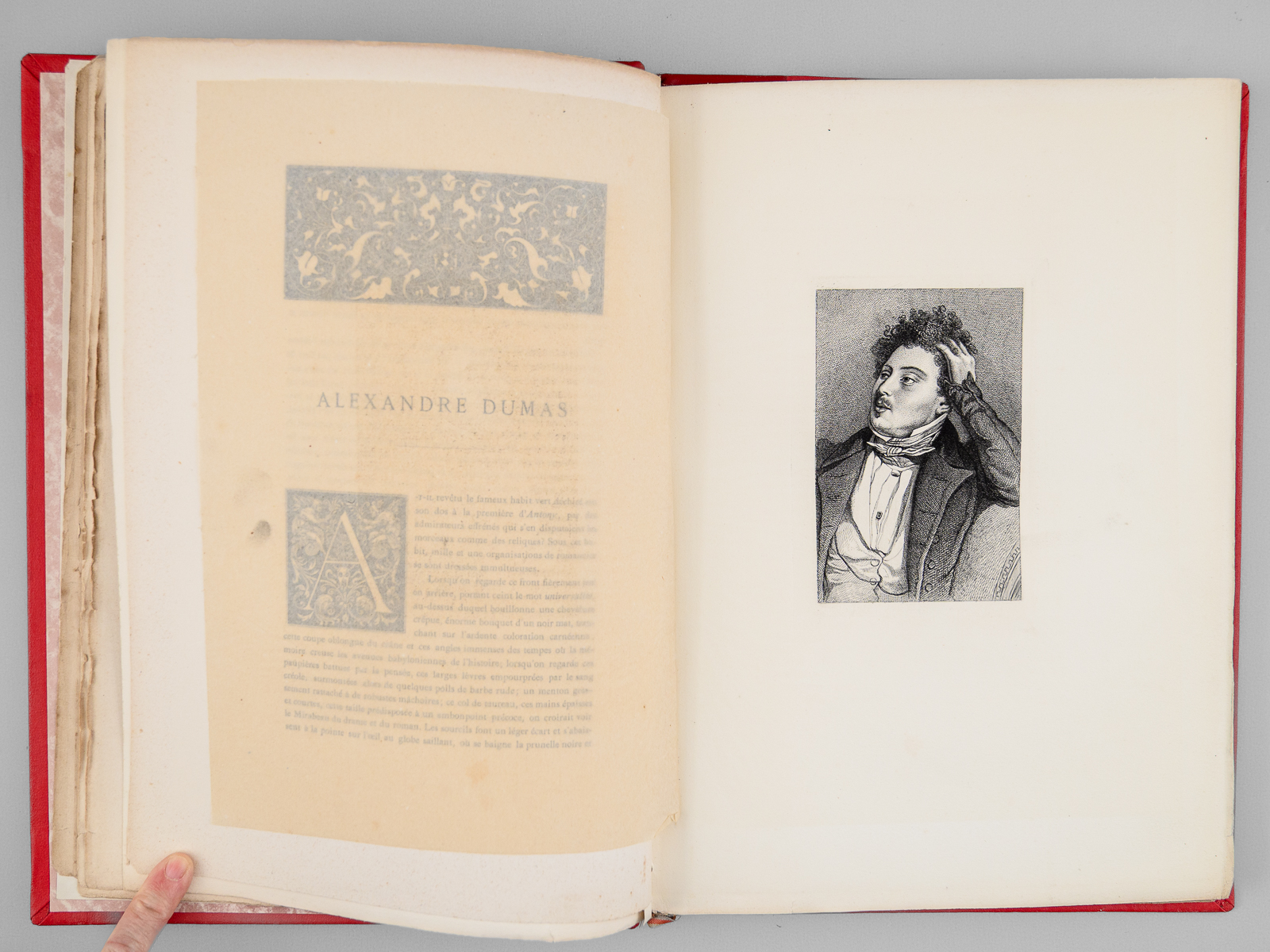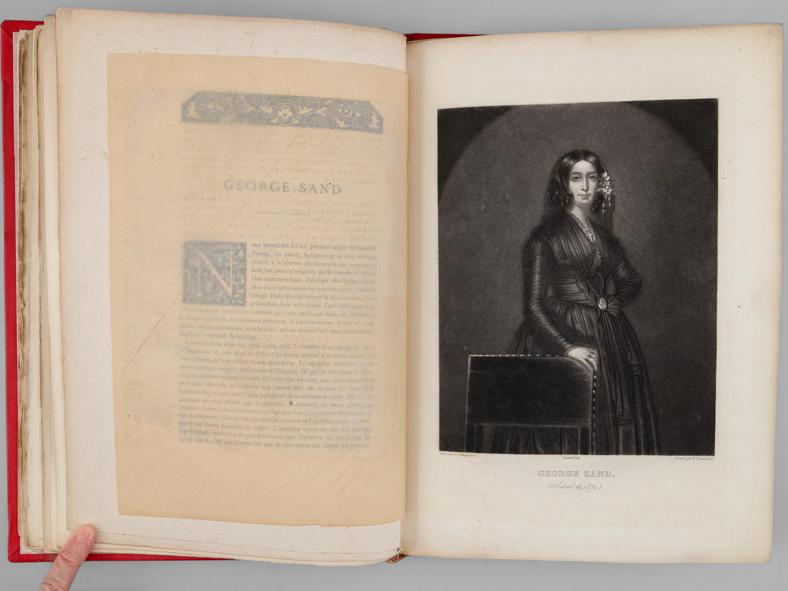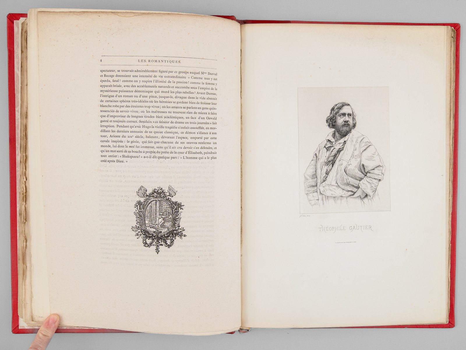 Dix portraits gravés de Eugène Delacroix, Victor Hugo, Alexandre Dumas, Théophile Gautier, Mme Dorval, Alfred de Musset, George Sand, Arsène Houssaye, Jules Janin, Balzac, 1 vol. grand in-4 (33 x 24 cm) reliure postérieure demi-basane rouge, Librairie à Estampes, Paris, 1877, 71 pp. avec 11 portraits hors texte (on trouve en sus celui de Corot)
