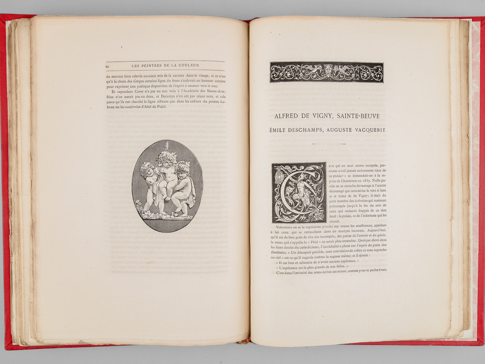 Commentaire : Rare exemplaire de l'édition originale en grand format, bien complet des 11 portraits, à savoir les 10 signalés ainsi que celui de Jean-Baptiste Camille Corot, non signalé. Vicaire confirme la présence des 11 portraits, tout en signalant qu'il n'a pu voir cette édition. Femme libre-penseur, Marie-Amélie de Chartroule (qui publia sous le pseudonyme de Marc de Montifaud) se travestissait régulièrement en homme. Collaborant à la revue L'Artiste, elle fondera la revue l'Art Moderne avec son mari, en 1875. Le présent ouvrage évoque également les figures de Frédéric Lemaitre, Gérard de Nerval, Théodire de Banville, Deveria, Boulanger, Decamps, Marilhat, Diaz, Théodore Rousseau, Jules Dupré, Alfred de Vigny, Emile Deschamps, Vacquerie et Sainte-Beuve. A ne pas confondre avec l'édition en petit format in-12 parue l'année suivante. Bon exemplaire. Vicaire, V, 1109