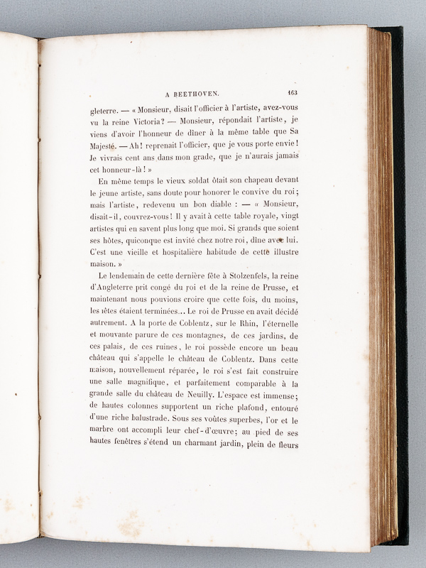 1 vol. grand in-8 cartonnage éditeur pleine percaline historiée, plaque signée de Damote, toutes tranches dorées, Morizot, Paris, 1858, XX-384 pp. et 2 ff. avec 14 planches hors texte sur acier (sur 15) Commentaire : Avec 14 planches sur 15 (manque la planche 'Musique des Bohémiens'). Beau cartonnage éditeur (incomplet d'une planche, très petit accroc sans mq. en coiffe sup., qq. rouss.) Vicaire, IV, 550 ; Carteret, III, 322