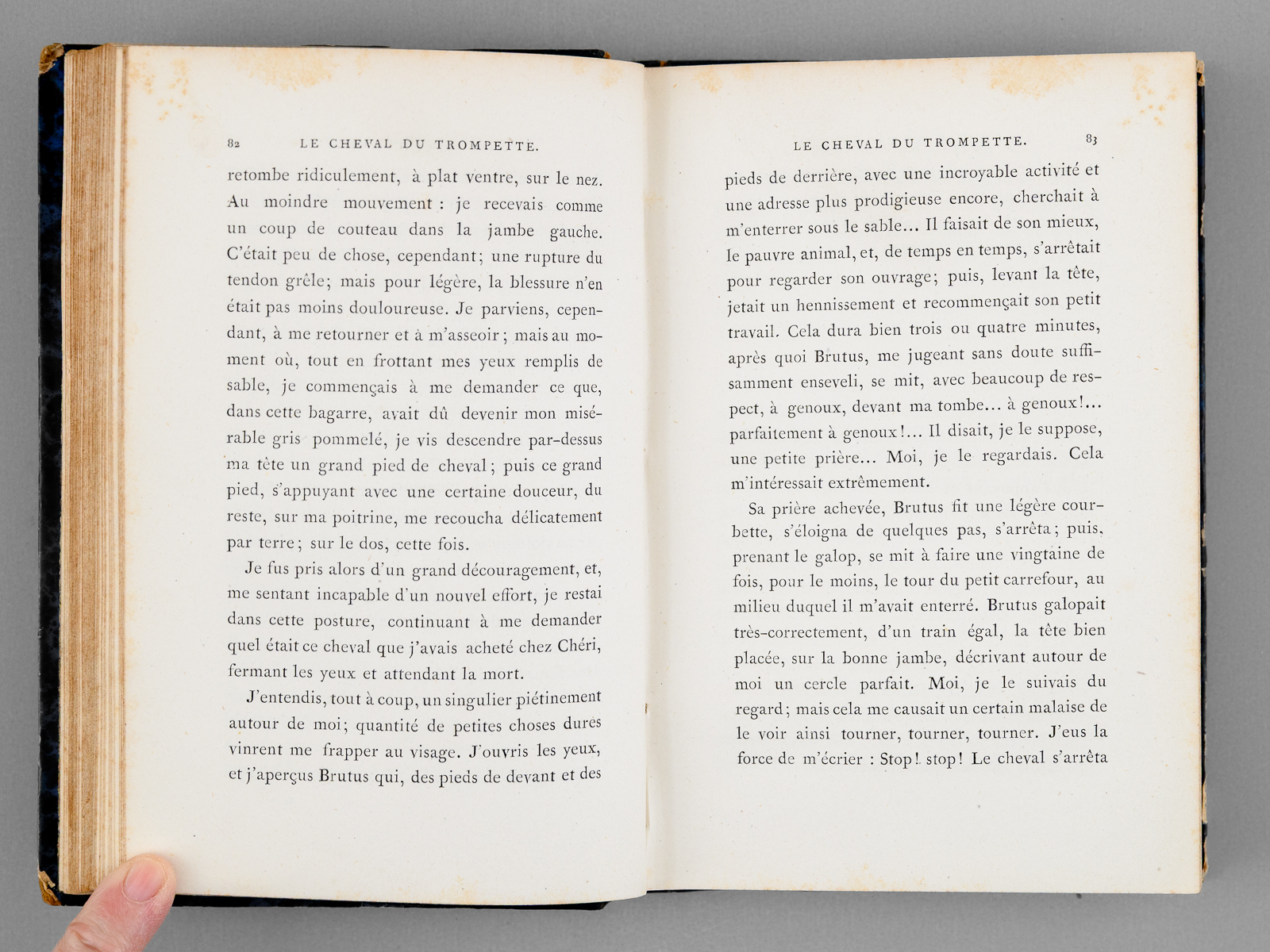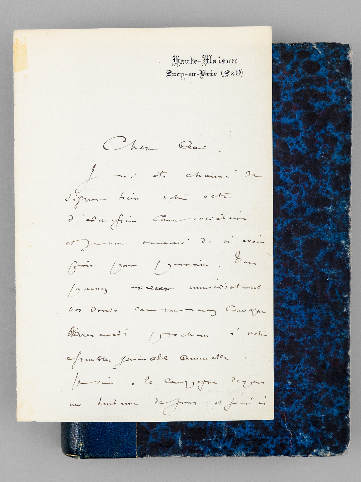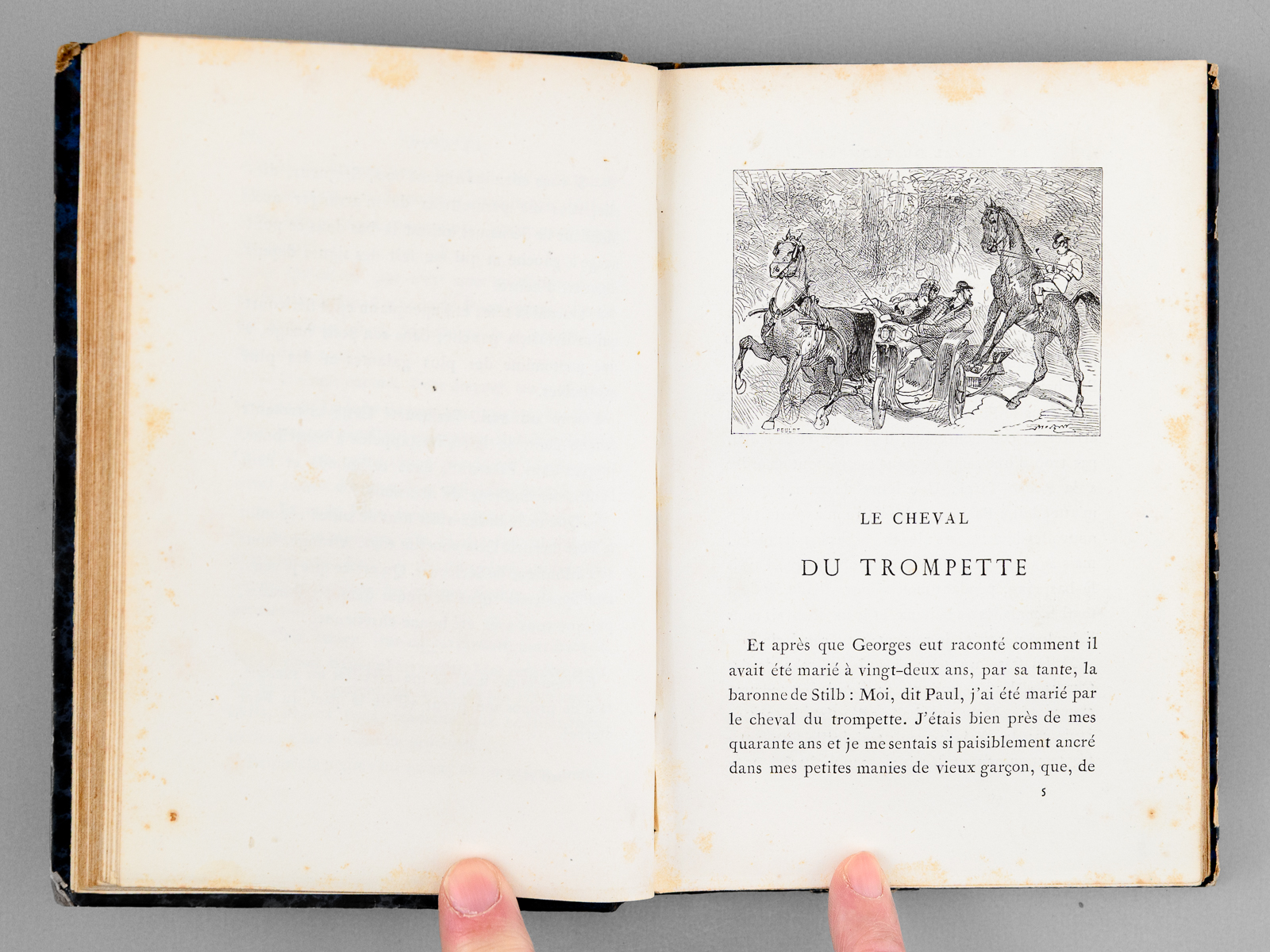 Douze vignettes par Edmond Morin, 1 vol. in-12 rel. demi-basane chagrinée bleue, dos à 4nerfs, Michel Lévy Frères, Paris, 1872, 275 pp. On joint un billet autographe recto-verso. Commentaire : Etat très satisfaisant (mors lég. frotté, plats frottés, bon état par ailleurs). Envoi ms. de l'auteur à l'écrivain et librettiste William Bertrand Busnach (1832-1907) : 'A mon ami William Busnach'. On joint un billet manuscrit non-daté (vers 1880), signe par Jules Clarétie (1840-1913) : 'Cher Ami, J'ai été charmé de signer hier votre acte d'admission comme sociétaire et je vous remercie de m'avoir choisi pour parrain. Vous pourrez exercer immédiatement vos droits car vous serez convoqué mercredi prochain à notre assemblée générale annuelle. Je suis à la campagne depuis une huitaine de jours et je n'ai pu, comme je l'aurais aimé, réentendu votre bel ouvrage. Mais je sais que les dernières représentations ont été excellentes et j'en suis si bien heureux de votre grand succès. Pour votre vieil ami et parrain bien affectionné. Jules Clarétie.' Jules Claretie, Ludovic Halévy et William Busnach étaient amis tous les trois. Les deux premiers entrèrent à l'Académie Française.