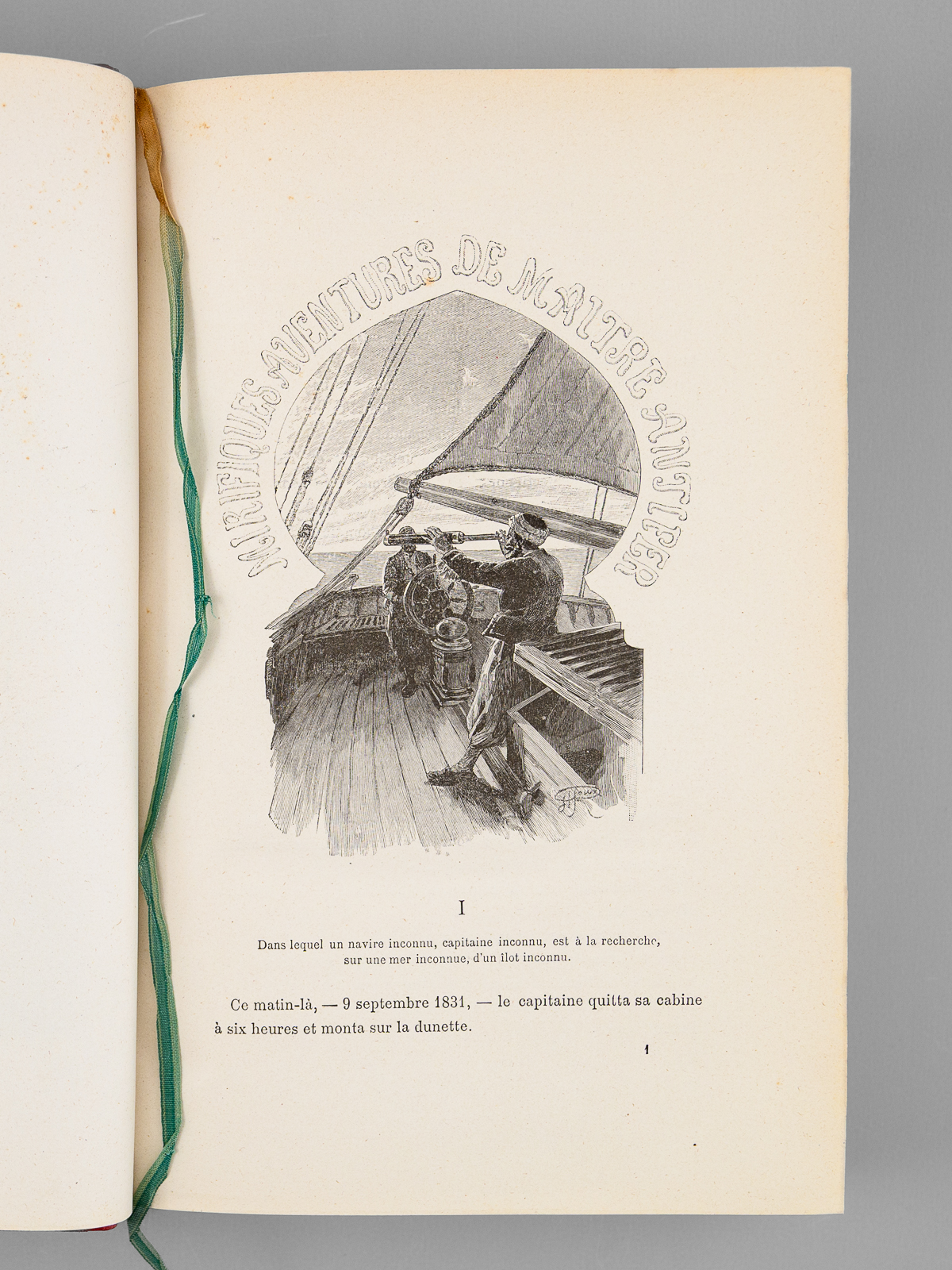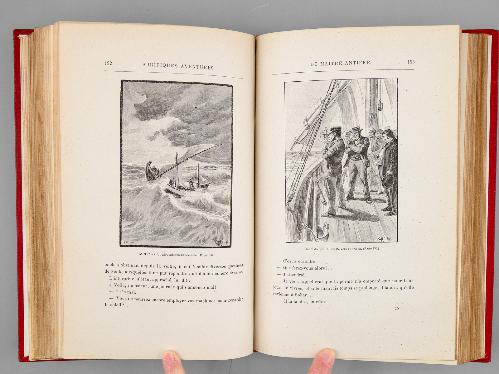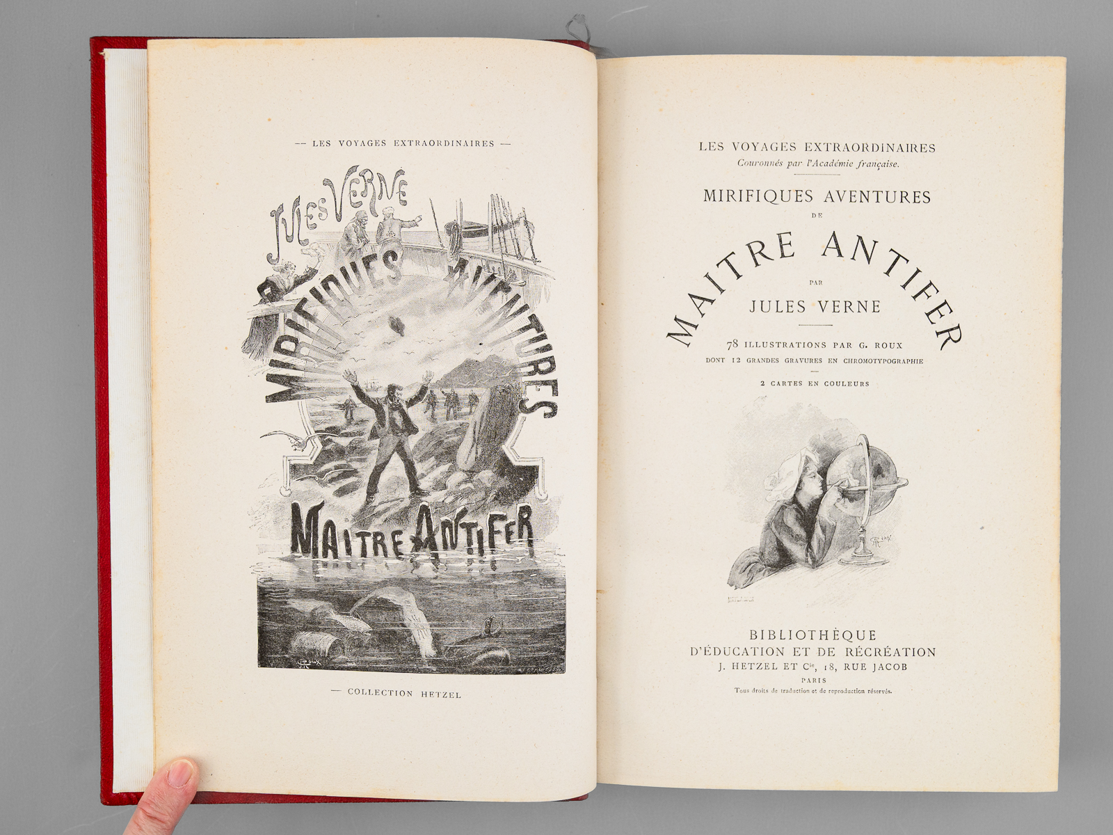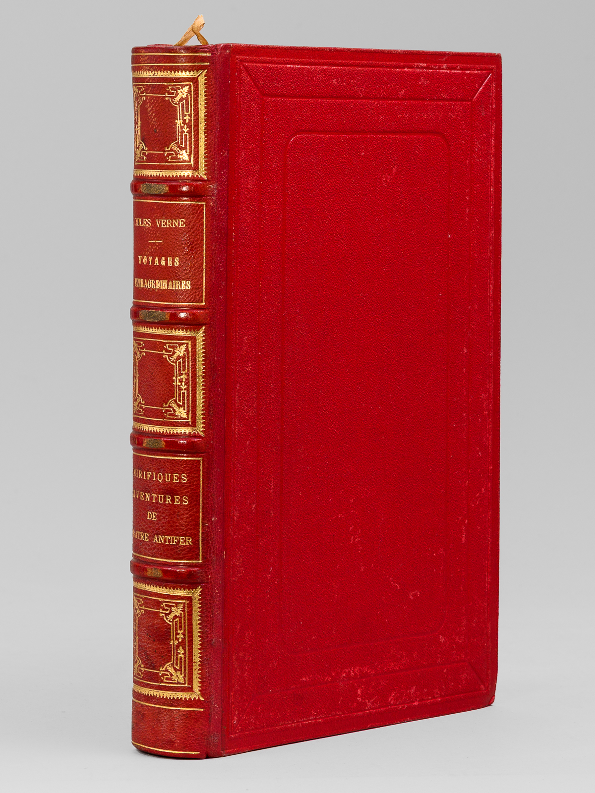 78 Illustrations par Georges Roux, 1 vol. in-8 reliure de l'époque demi-chagrin rouge dite « aux fers de lance » (ou « harpons » ou 'reliure à la lancette'), dos à 4 nerfs orné, toutes tranches dorées, reliure signée de Wendling, Collection Hetzel, Coll. Les Voyages Extraordinaires, Bibliothèque d'Education et de Récréation, J. Hetzel et Cie, Paris, s.d., 2 ff., 438 pp. Commentaire : Exemplaire en reliure du type 'aux fers de lance' signée Wendling, en état très satisfaisant (petit frott. sur les 4 nerfs, rares rouss., très bon état par ailleurs). D'après la remarquable Gazette n° 8 de la Librairie Monte Cristo, cette production 'Wendling' débutant sans doute vers 1900-1902 fut réalisée 'à destination d'un marché encore inconnu de nous' et serait en réalité légèrement différente de la version classique 'aux fers de lance' : les reliures Wendling font 27,5 cm de haut (contre 28,2 pour les Hetzel) et les caractères utilisés pour les fers sont différents (cf. : Librairie Monte Cristo, Gazette n°8, pp. 19-20)