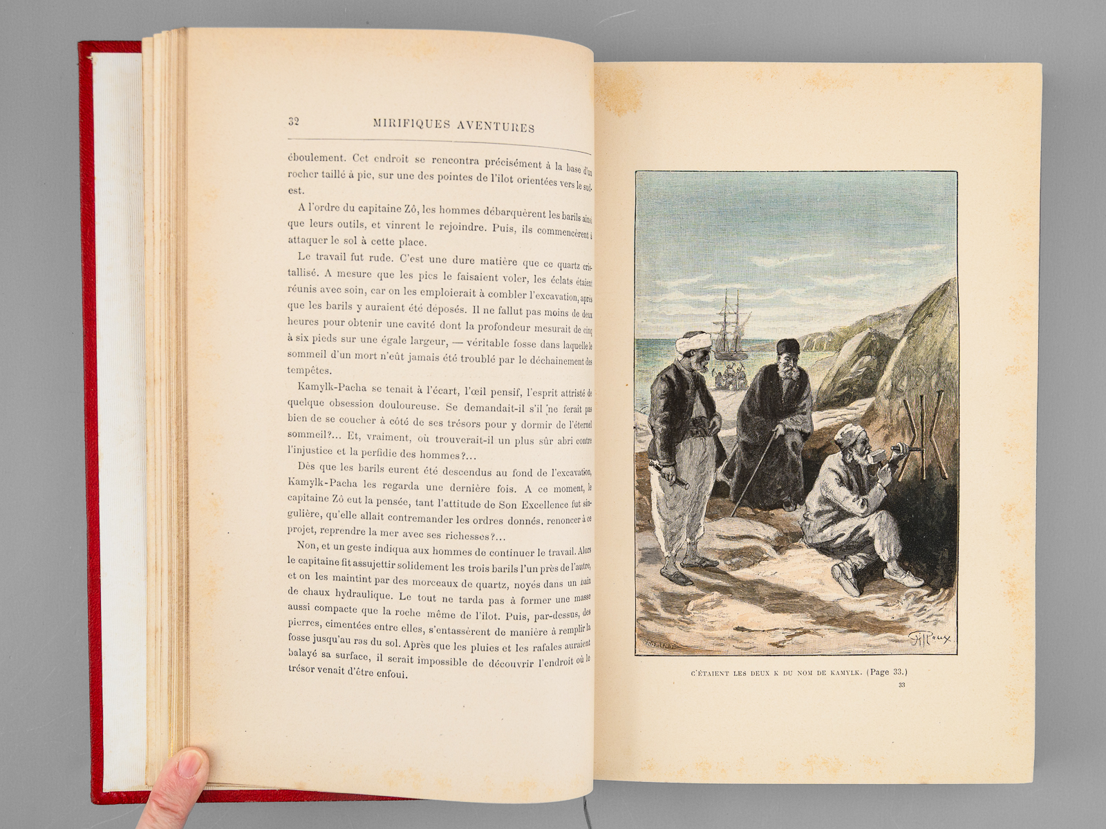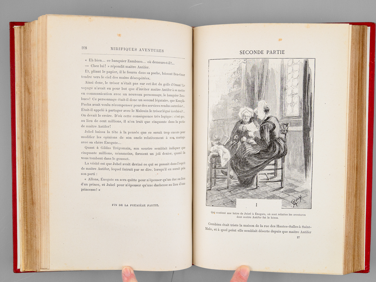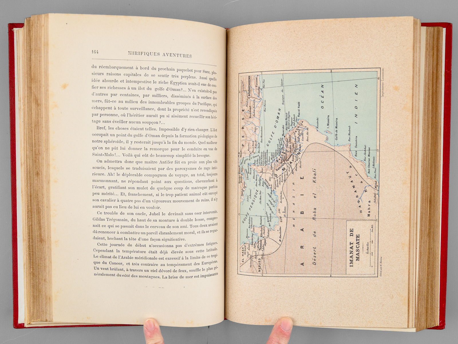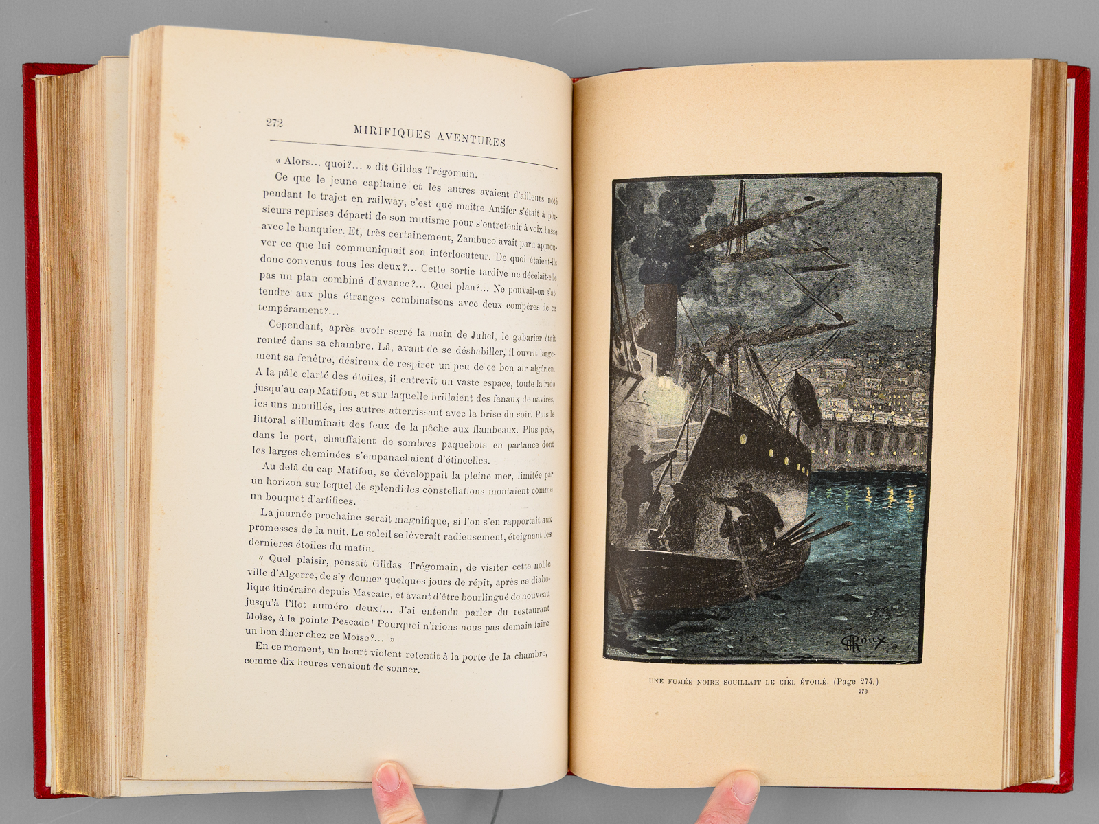 78 Illustrations par Georges Roux, 1 vol. in-8 reliure de l'époque demi-chagrin rouge dite « aux fers de lance » (ou « harpons » ou 'reliure à la lancette'), dos à 4 nerfs orné, toutes tranches dorées, reliure signée de Wendling, Collection Hetzel, Coll. Les Voyages Extraordinaires, Bibliothèque d'Education et de Récréation, J. Hetzel et Cie, Paris, s.d., 2 ff., 438 pp. Commentaire : Exemplaire en reliure du type 'aux fers de lance' signée Wendling, en état très satisfaisant (petit frott. sur les 4 nerfs, rares rouss., très bon état par ailleurs). D'après la remarquable Gazette n° 8 de la Librairie Monte Cristo, cette production 'Wendling' débutant sans doute vers 1900-1902 fut réalisée 'à destination d'un marché encore inconnu de nous' et serait en réalité légèrement différente de la version classique 'aux fers de lance' : les reliures Wendling font 27,5 cm de haut (contre 28,2 pour les Hetzel) et les caractères utilisés pour les fers sont différents (cf. : Librairie Monte Cristo, Gazette n°8, pp. 19-20)