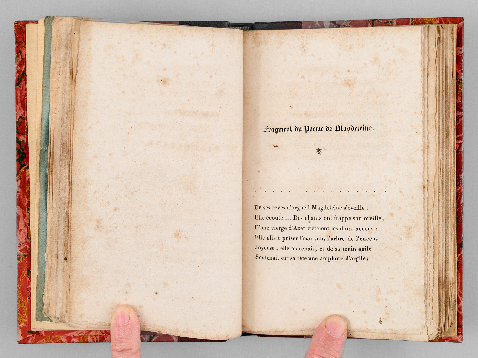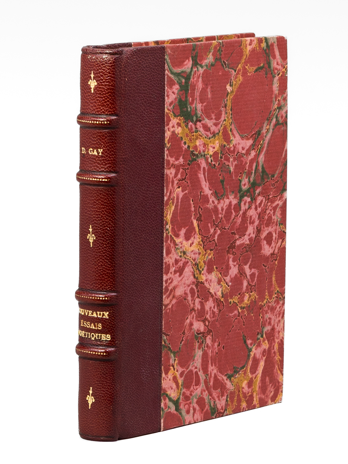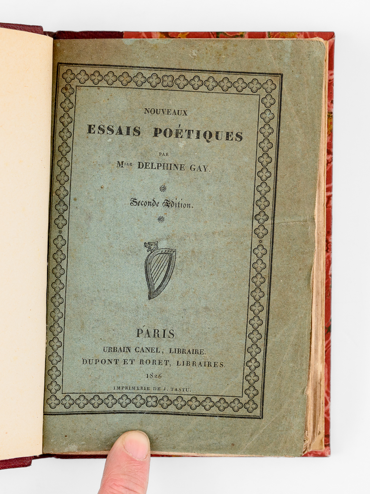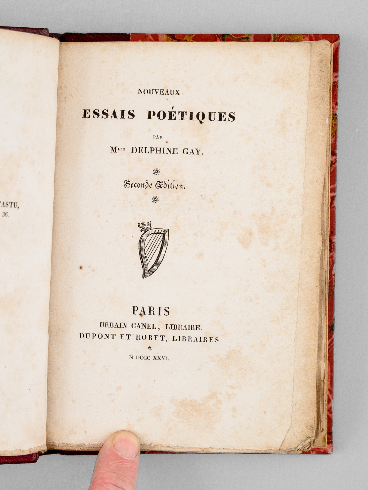 Seconde Édition, 1 vol. petit in-12 reliure postérieure demi-chagrin rouge, dos à 4 nerfs orné, couverture conservée, Urbain Canel, Libraire, Dupont et Roret, Libraires, Paris, 1826, 191 pp. et 1 f. n. ch. Commentaire : Dans son Salon de l'hôtel Marbeuf, Mme de Girardin accueillera les plus grands écrivains de son temps : Gautier, Hugo, Balzac, Musset, Lamartine, Dumas ou George Sand... Goethe vantera ces 'Nouveaux essais poétiques', qui seront présentés au Roi en audience particulière et lui vaudra une belle pension, à l'instar de l'aide déjà obtenue par Marceline Desbordes-Valmore. Bon état (rouss.) Vicaire, III, 989 (pour l'édition originale).