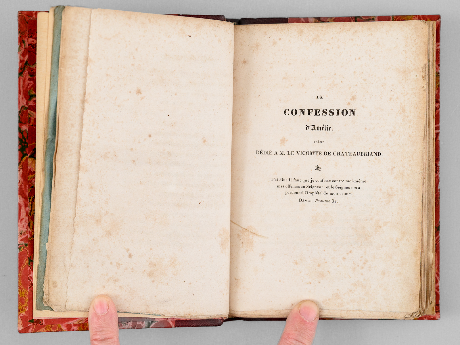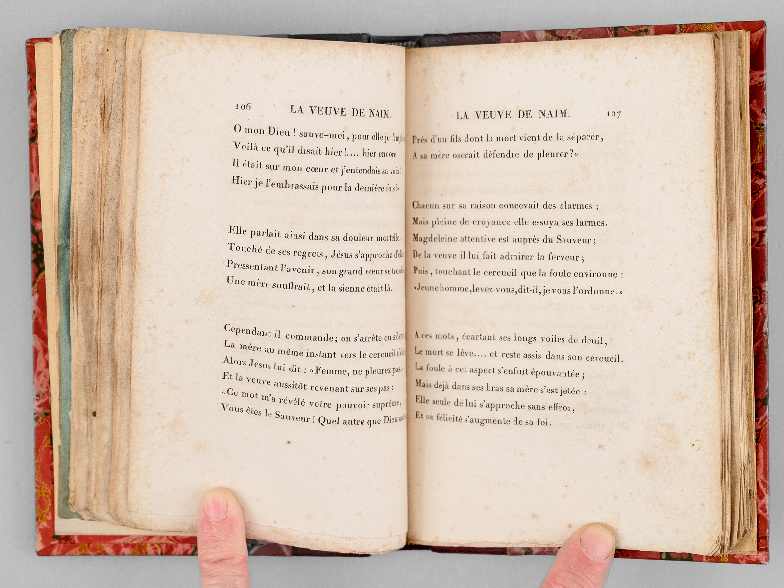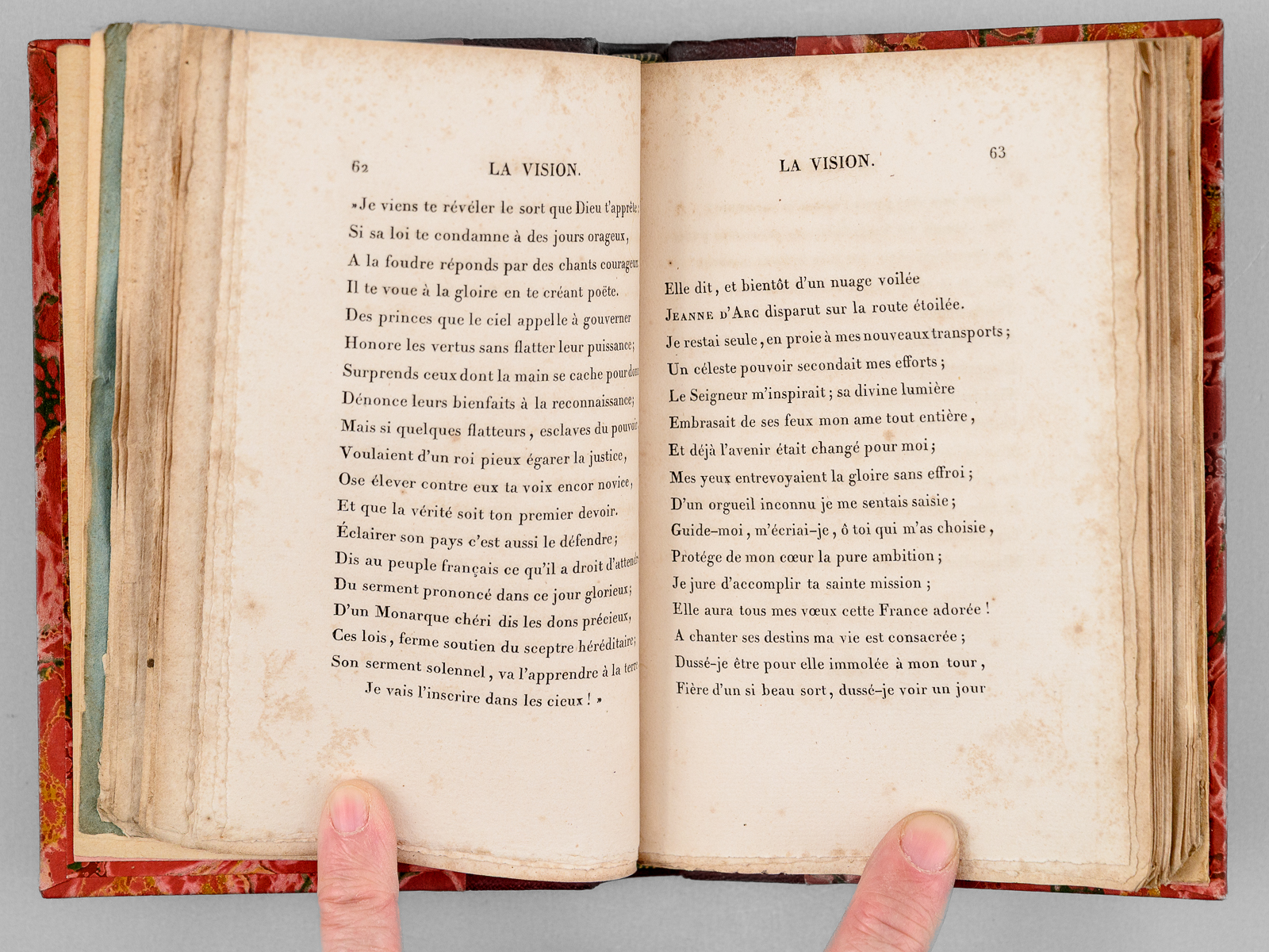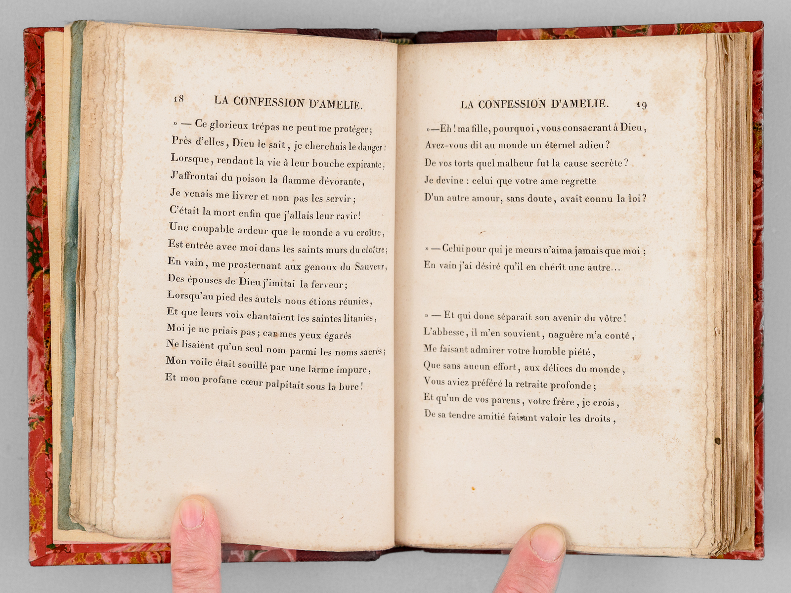 Seconde Édition, 1 vol. petit in-12 reliure postérieure demi-chagrin rouge, dos à 4 nerfs orné, couverture conservée, Urbain Canel, Libraire, Dupont et Roret, Libraires, Paris, 1826, 191 pp. et 1 f. n. ch. Commentaire : Dans son Salon de l'hôtel Marbeuf, Mme de Girardin accueillera les plus grands écrivains de son temps : Gautier, Hugo, Balzac, Musset, Lamartine, Dumas ou George Sand... Goethe vantera ces 'Nouveaux essais poétiques', qui seront présentés au Roi en audience particulière et lui vaudra une belle pension, à l'instar de l'aide déjà obtenue par Marceline Desbordes-Valmore. Bon état (rouss.) Vicaire, III, 989 (pour l'édition originale).