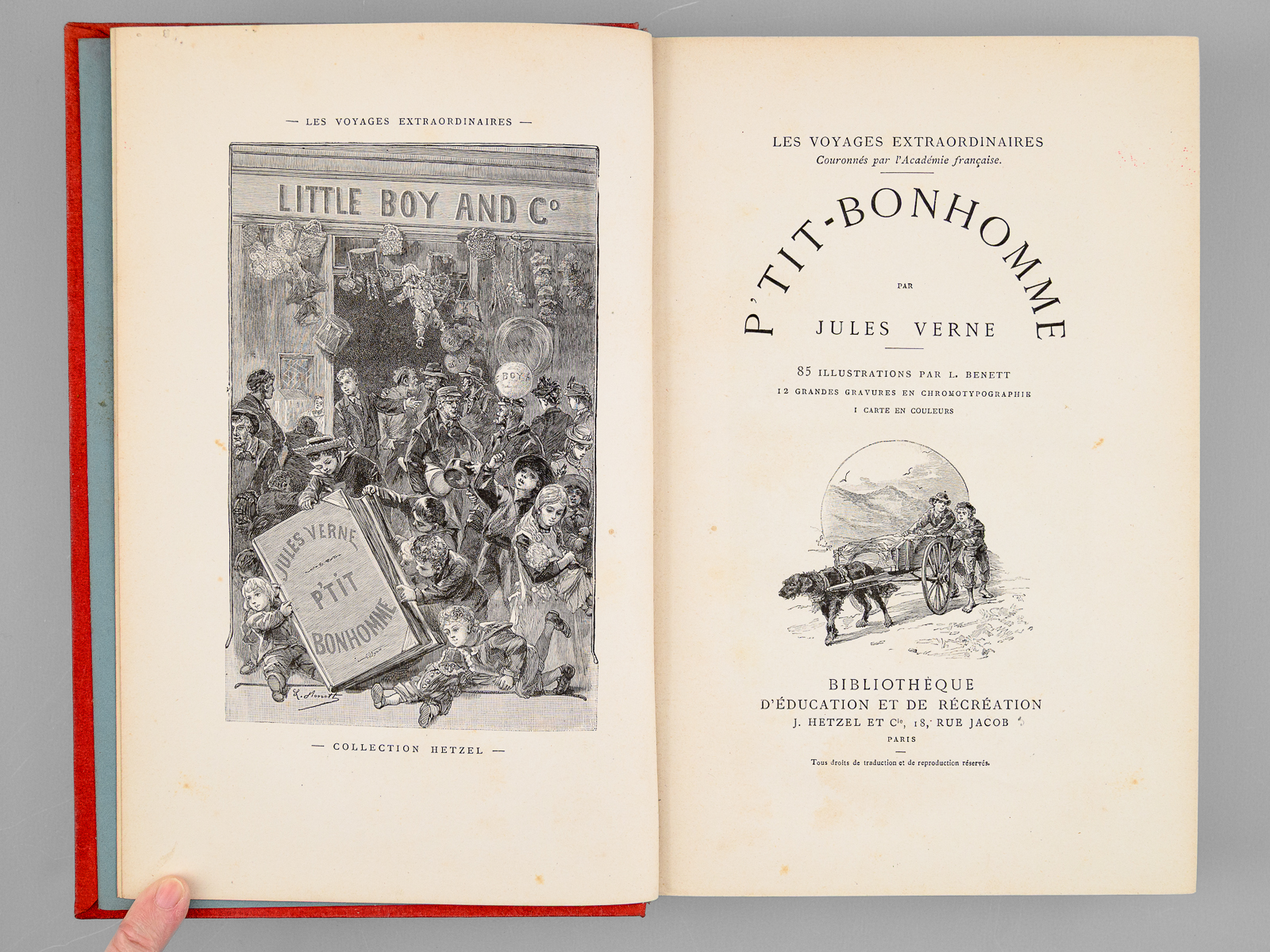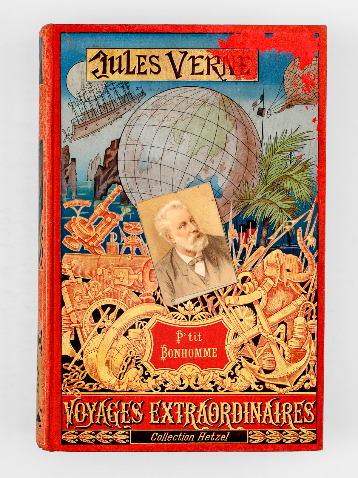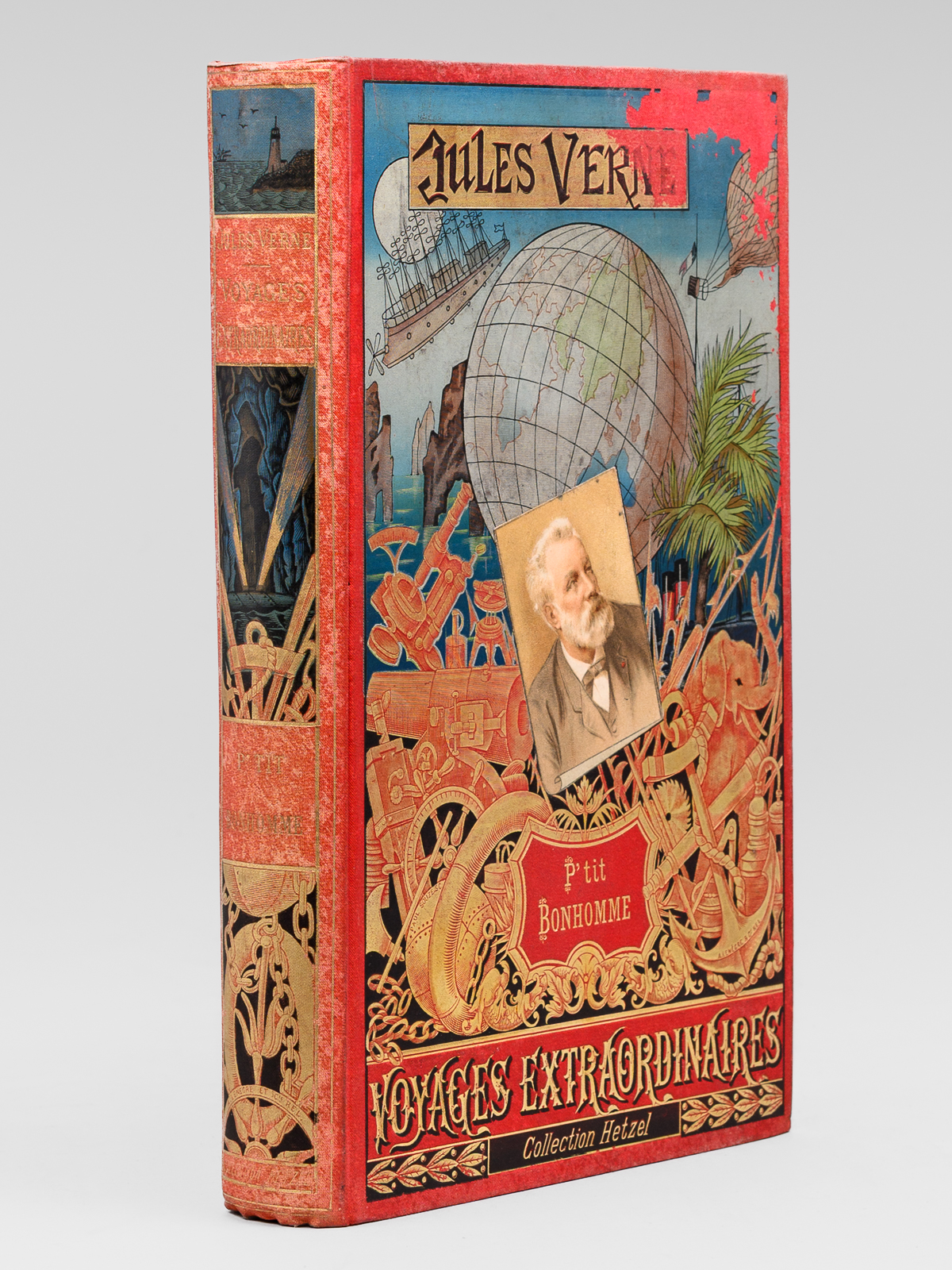 85 illustrations par L. Benett, 12 grandes gravures en chromotypographie, 1 carte en couleurs, 1 vol. in-8 cartonnage polychrome au portrait collé, dos au phare, JH au second plat, toutes tranches dorées, coll. Les voyages extraordinaires, Bibliothèque d'éducation et de récréation J. Hetzel et Cie, s.d. [ 1893 ], 2 ff., 458 pp. + catalogue GU Commentaire : Etat satisfaisant (cartonnage frotté avec forte usure en angle sup. au premier plat, dos et second plats frottés, bon état par ailleurs)
