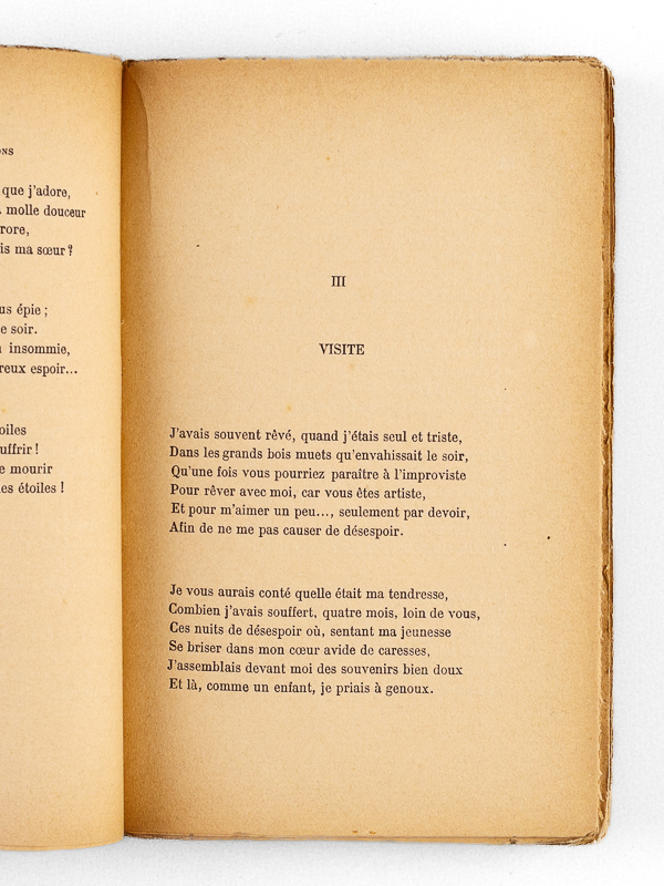 Précédés d'une Lettre-dédicace de l'Auteur à M. Sully Prudhomme, et de la Réponse-Préface de M. Sully Prudhomme, 1 vol. in-12 br., Librairie Léon Vanier, A. Messein Succ., Paris, 1905, 223 pp. Commentaire : Envoi de Jean Canora 'à Fernand Gregh, Souvenirs de luttes communes, Hommage affectueux'. Exemplaire bien restauré dont le dos a été refait et les deux plats d'origine rapportés.