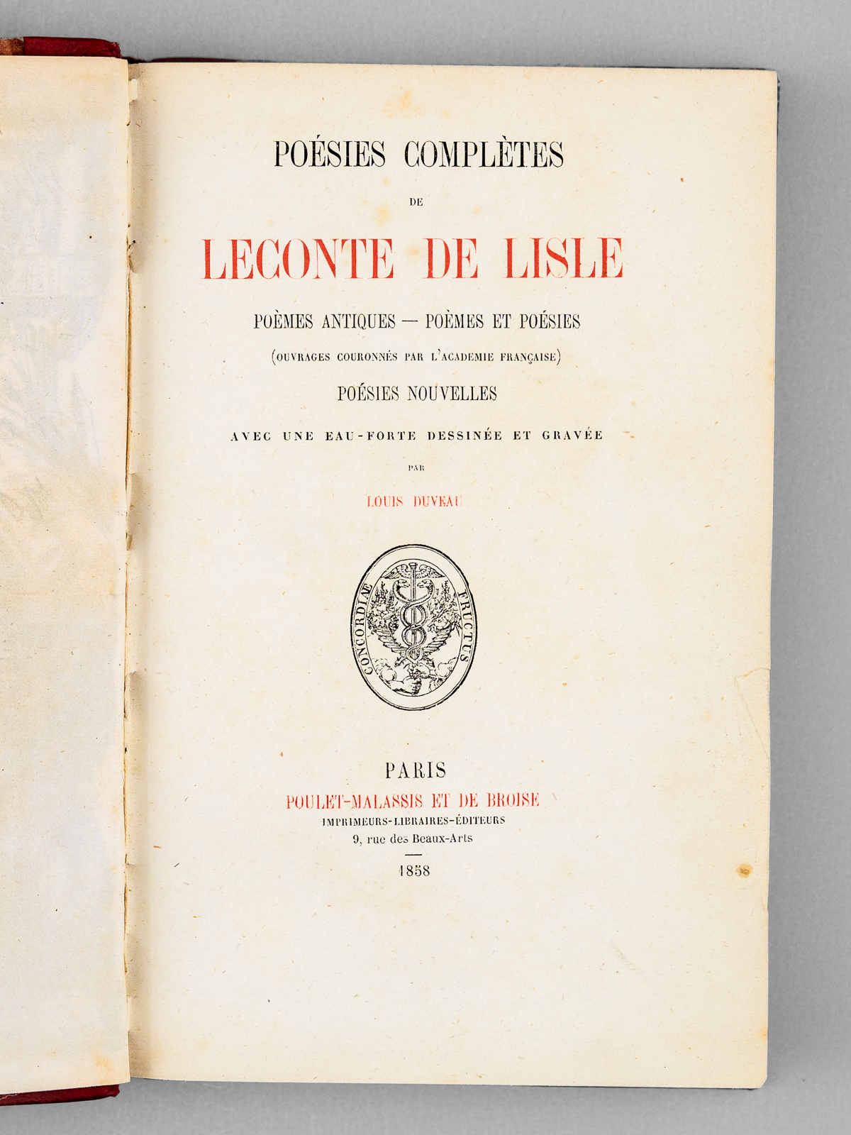 avec une eau-forte dessinée et gravée par Louis Duveau, 1 vol. in-12 rel. demi-chagrin rouge, dos ornée à 5 nerfs, Poulet-Malassis et de Broise, 1858, 333 pp. Commentaire : Etat très satifaisant (couv. frottée sur bords, bon état par ailleurs).