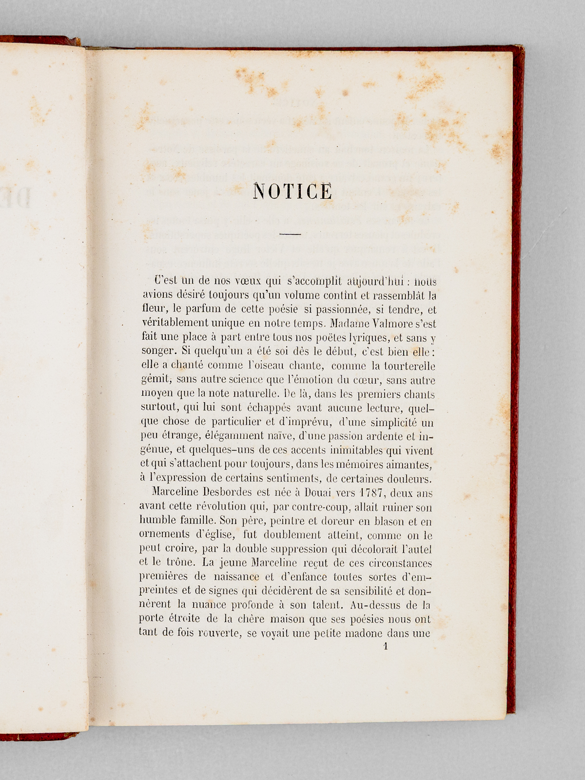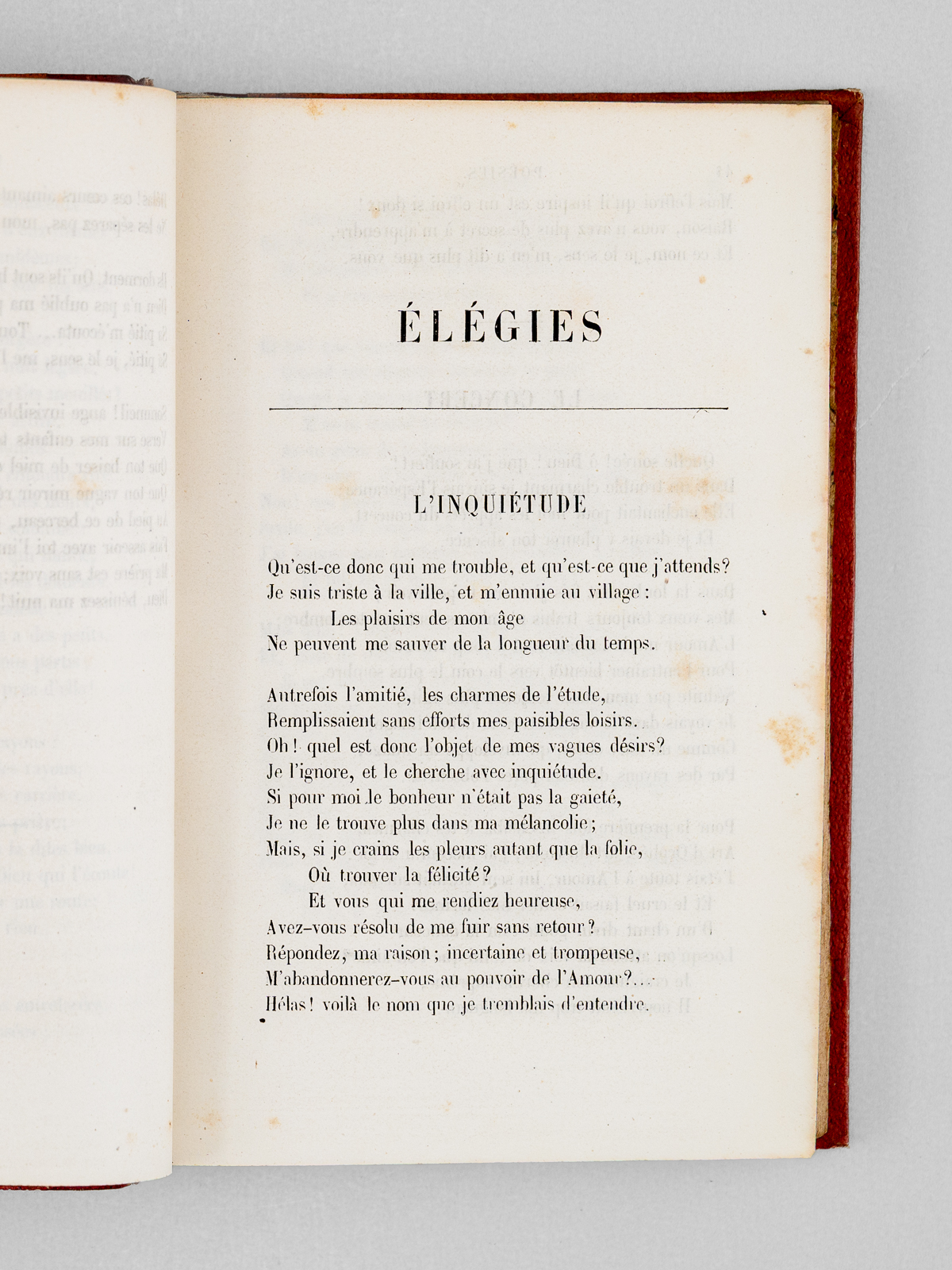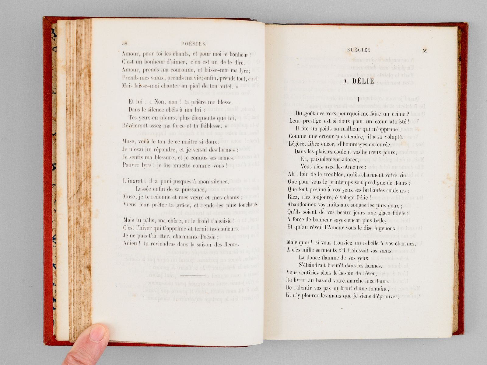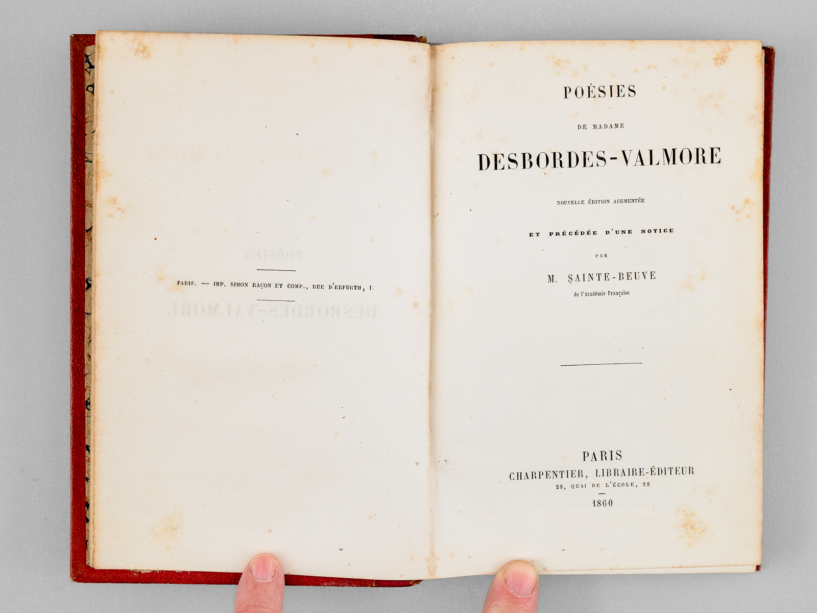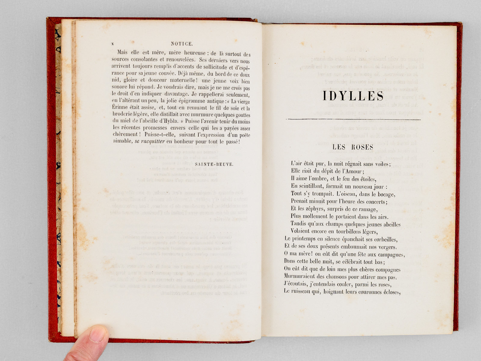 Nouvelle édition augmentée, Précédée d'une notice par M. Sainte-Beuve de l'Académie Française, 1 vol. in-12 reliure demi-basane rouge, Charpentier, Libraire-Éditeur, Paris, 1860, 2 ff., 320 pp. Commentaire : Bon état (reliure lég. frottée avec super-libris 'M. Bouyer' au premier plat).