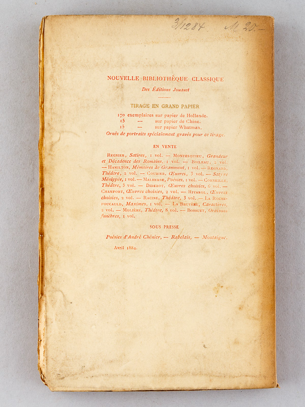 Traduit par Abel Bergaigne et Paul Lehugeur, un des 100 exemplaires sur papier de hollande numérotés de 21 à 120 (n° 57), 1 vol. in-8 (format 22,3 x 14,3 cm), Nouvelle Bibliothèque Classique, Jouaust, Librairie des Bibliophiles, Paris, 1884, XI-195 pp. Commentaire : Bon exemplaire du tirage en grand papier (à ne pas confondre avec les tirages au format in-12). Les oeuvres en sanscrit du poète indien antique Kalidasa, très inspirées de la mythologie et de la métaphysique hindoues, lui ont valu une immense renommée .