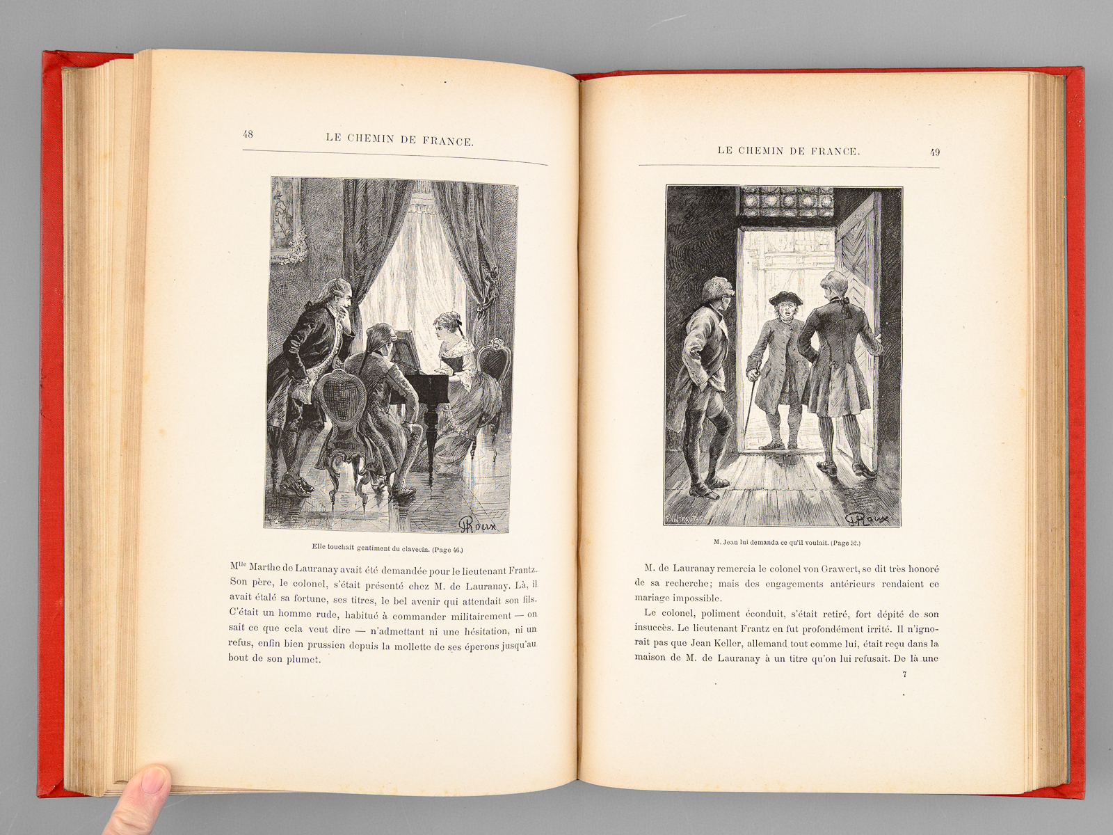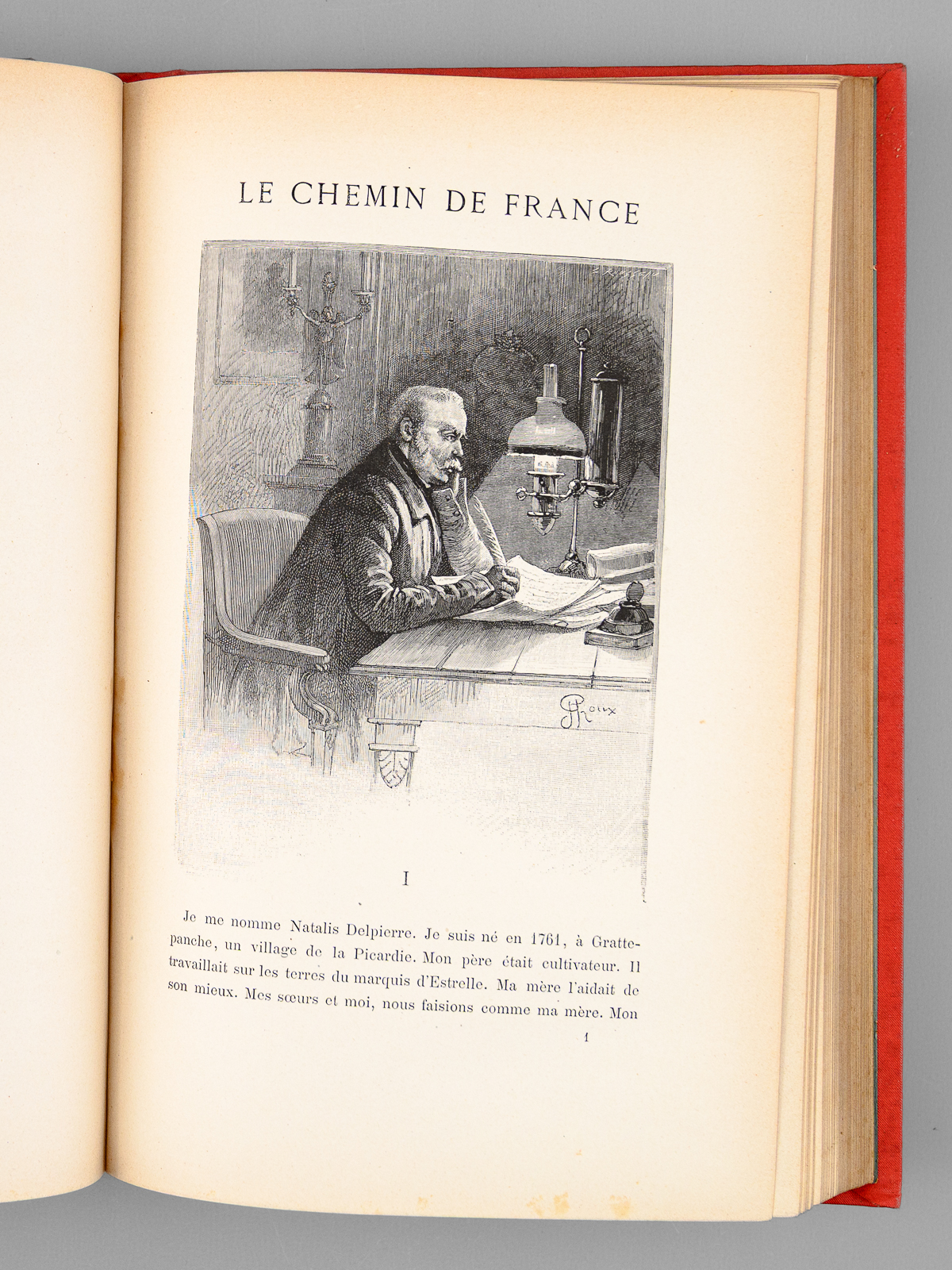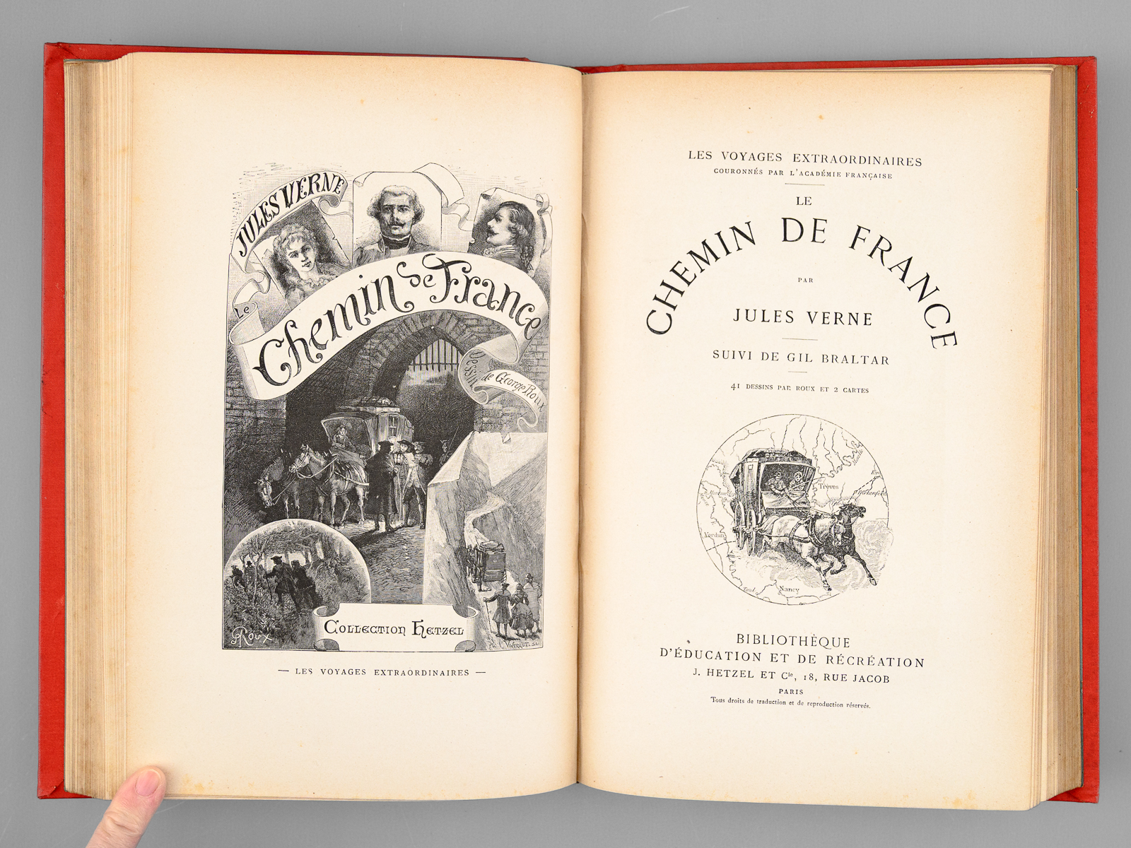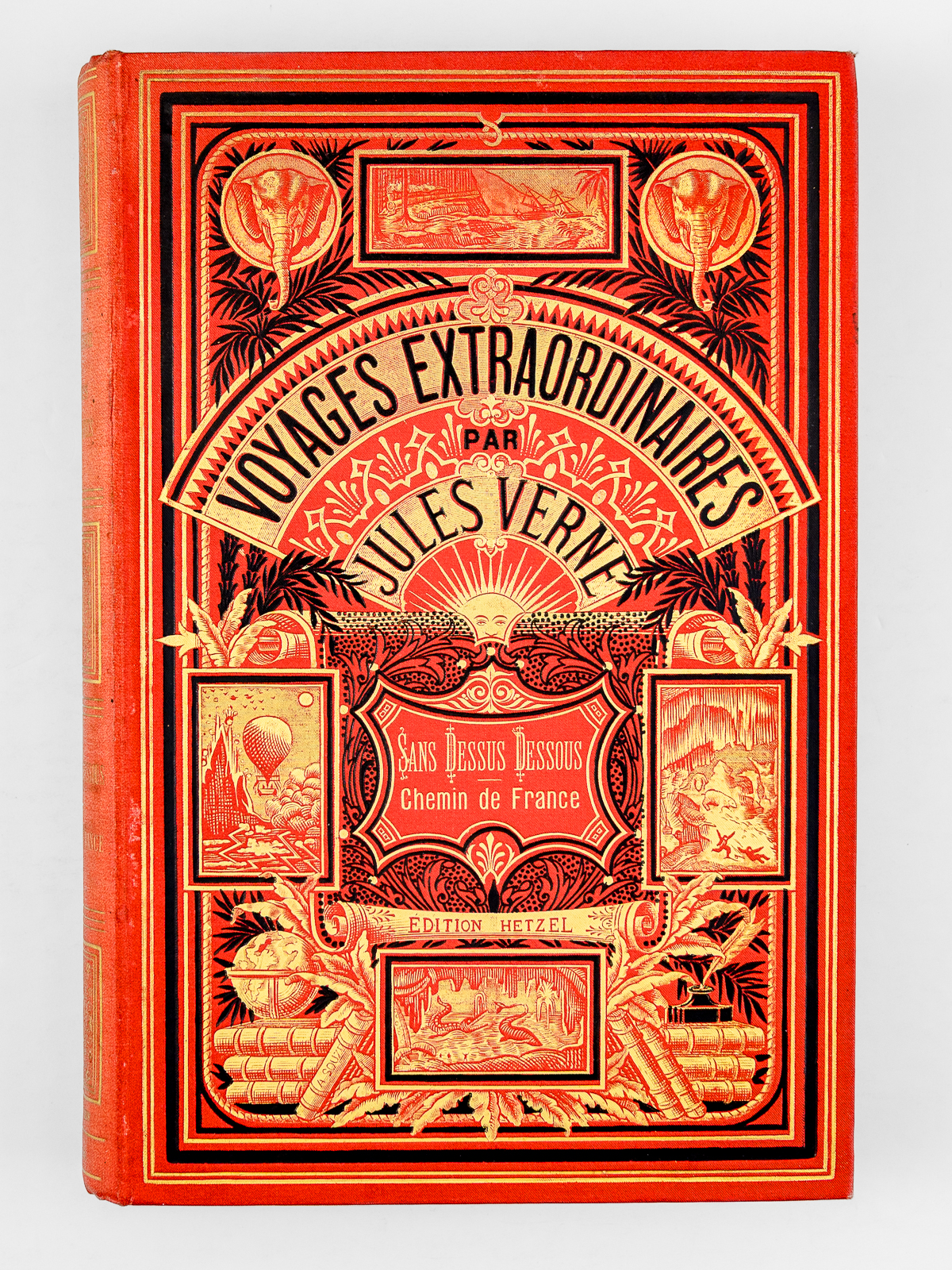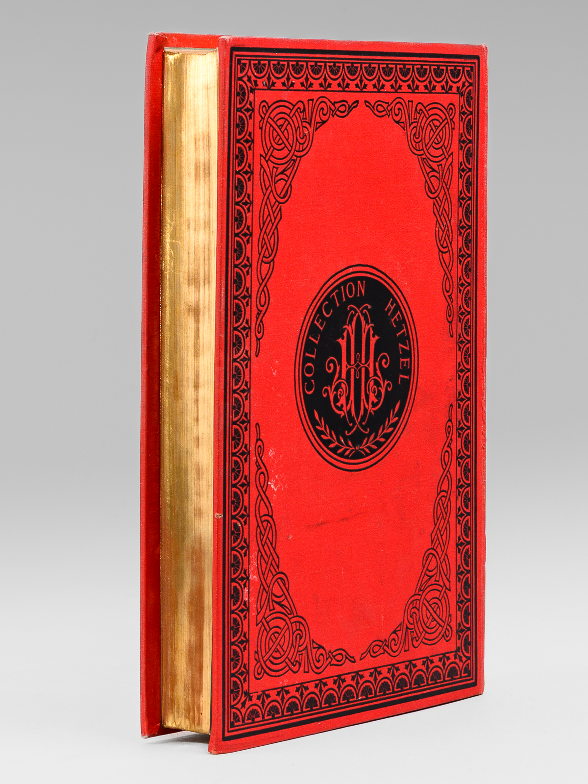 1 vol. grand in-8 cartonnage éditeur pleine percaline rouge aux deux éléphants, titre dans le cartouche, toutes tranches dorées, cartonnage signé A. Lenègre et Cie du 3ème type ((mention Hetzel sous le cartouche, médaillon circulaire à motifs noirs au plat inférieur), Bibliothèque d'Education et de Récréation, J. Hetzel et Cie, Paris, s.d. [1889 ], 4 ff., 204 pp., 2 ff., 220 pp. et 4 ff. (catalogue EX) Commentaire : Bon exemplaire à la gouttière 'lingot' (dos très lég. passé, très petit frott. au second plat, très bon état par ailleurs). Jauzac, 251