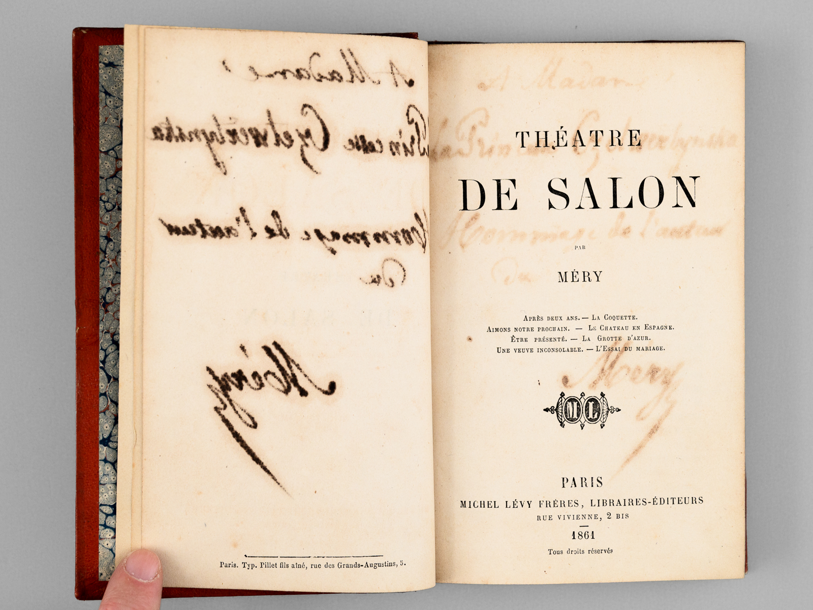 1 vol. in-12 reliure demi-basane rouge, Michel Lévy Frères, Paris, 1861, 339 pp. et 1 f. Commentaire : L'exemplaire est dédicacé par Méry 'à Madame la Princesse Czetwertynska, Hommage de l'Auteur du Théâtre du Salon'.