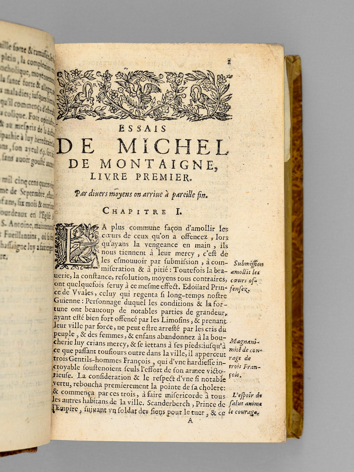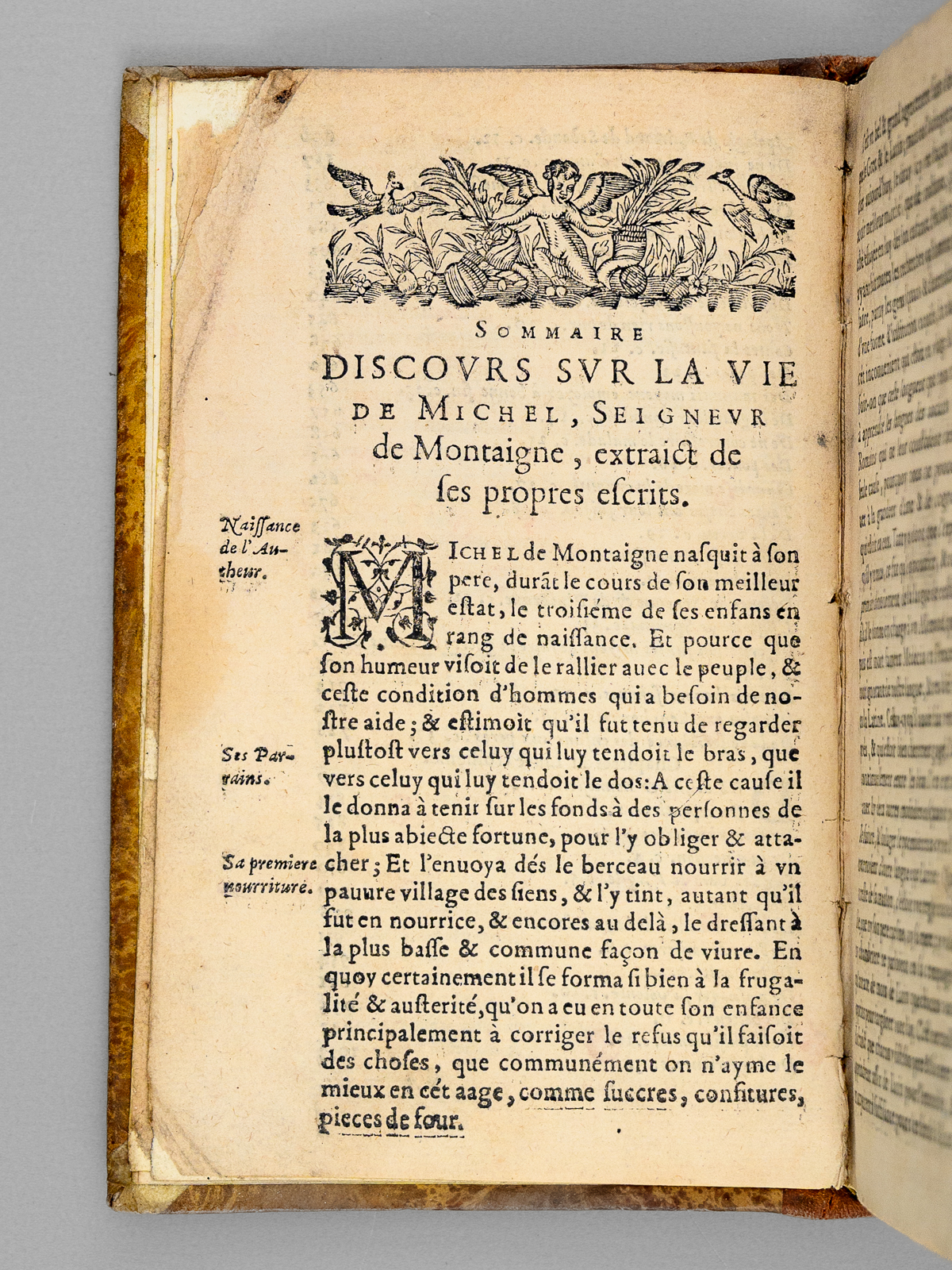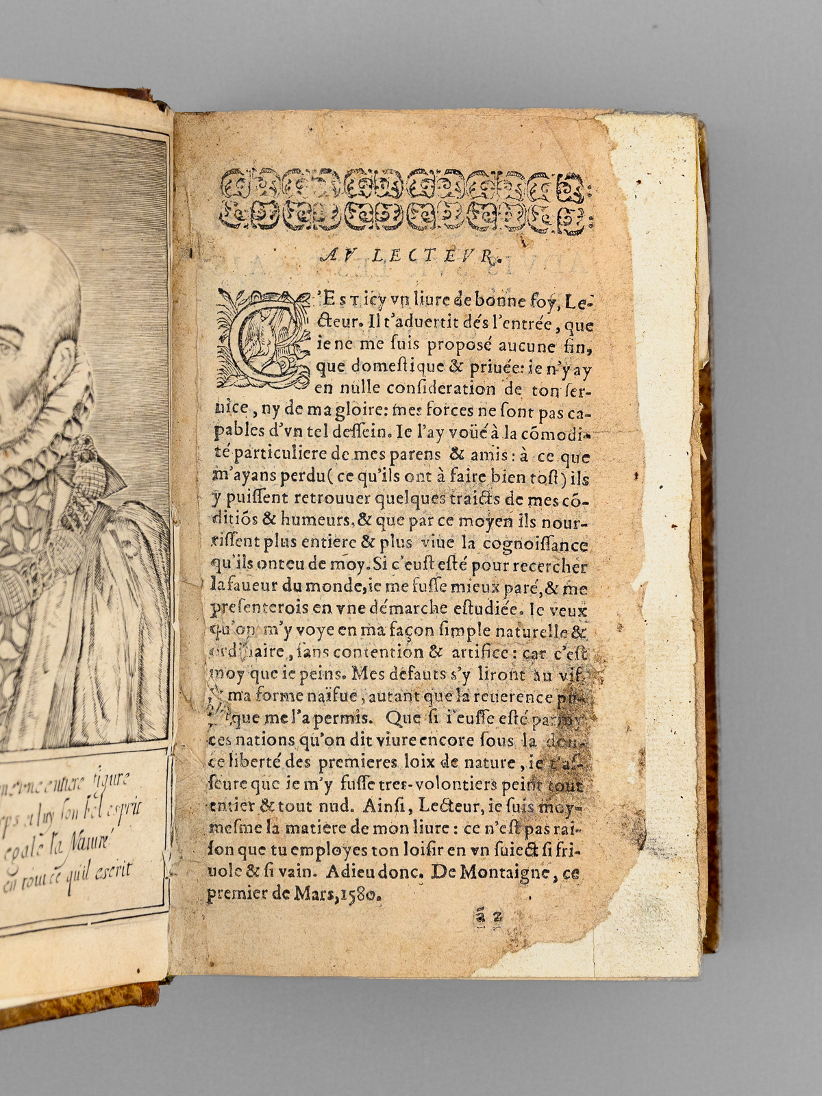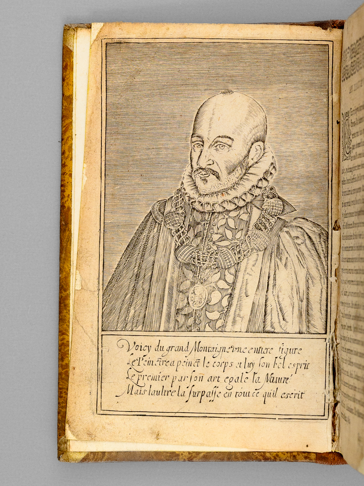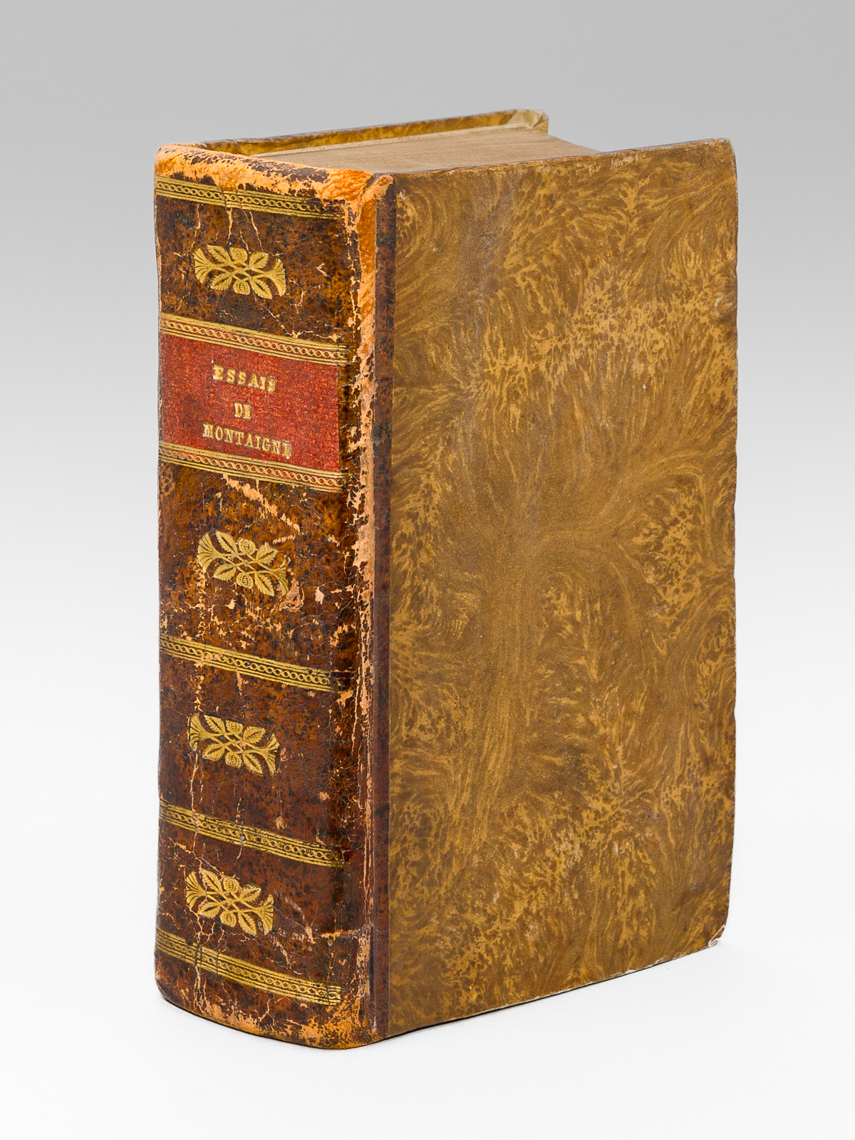 1 vol. petit in-8 reliure début XIXe demi-basane marron, dos lisse orné, s.l.n.d. [ sans les premiers feuillets dont la page de titre ], 7 ff., 1129 pp. et 16 ff. n. ch. Commentaire : Prix en l'état pour cet exemplaire d'une édition de la première moitié du XVIIe siècle, qui n'a pu être identifiée avec plus de précision en l'absence des premiers feuillets dont le feuillet de titre. Il s'agit d'une des nombreuses éditions en 1129 pages (avec les sauts de pagination habituels), notre exemplaire comptant 16 feuillets de table des matières. L'exemplaire s'ouvre sur le portrait de Montaigne suivi de l'avis au lecteur, ces deux feuillets ayant été partiellement restaurés. Prix en l'état.
