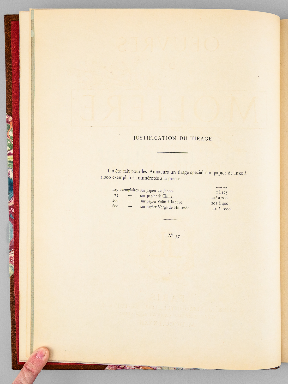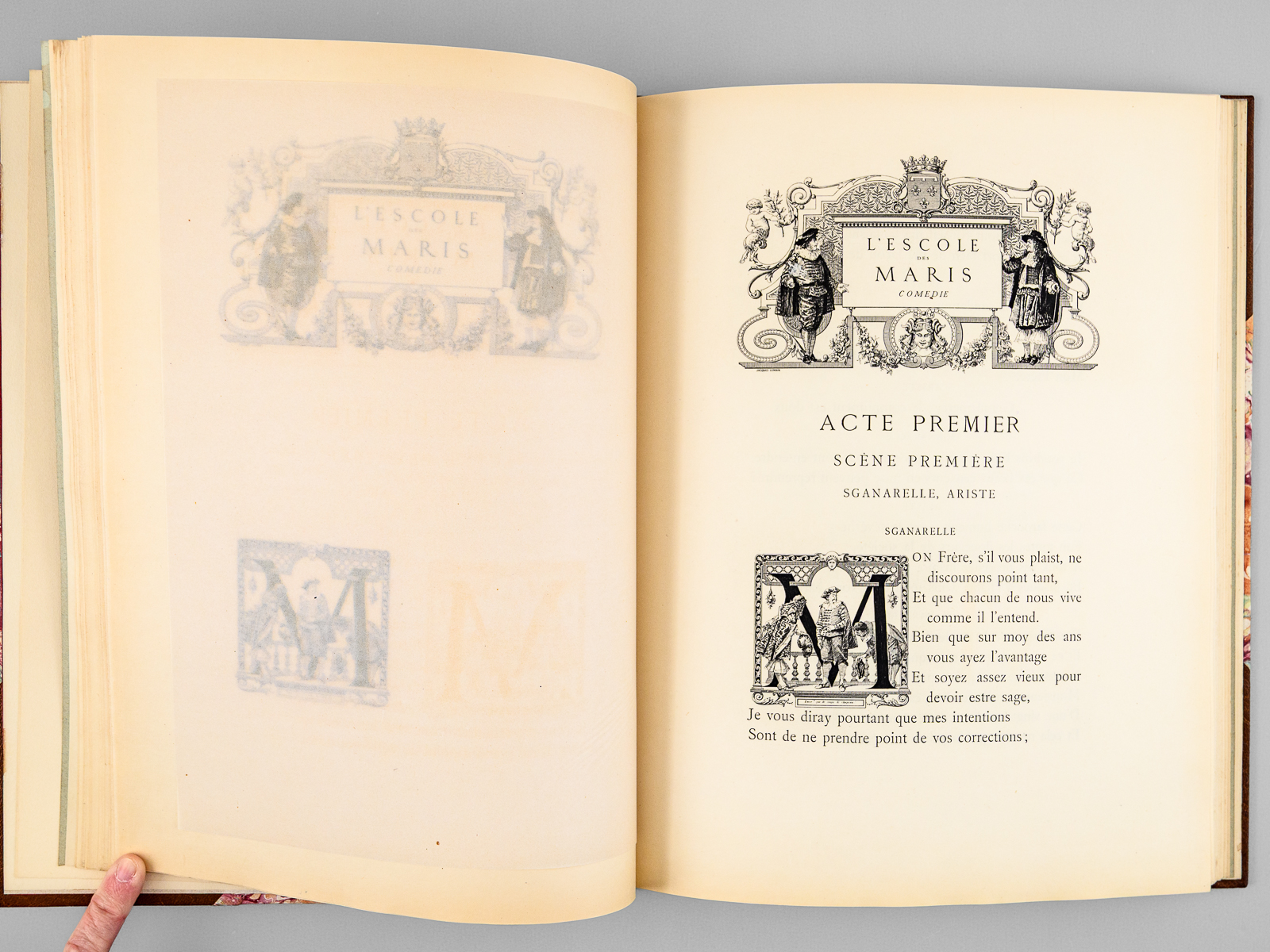 Commentaire : Rare exemplaire du tirage de tête sur papier du japon du tome premier cette très belle édition, commencée en 1882 chez Lemonnyer et terminée en 1896 chez Emile Testard. Le tirage sur japon contient une deuxième suite de toutes les gravures du texte et hors texte, tirées à part en bistre, et une troisième suite en sanguine de la grande composition hors texte. L'intrigue de cette comédie de Molière repose sur le contraste entre deux frères, dont l'un a pour principe la sévérité dans l'éducation et l'autre l'indulgence. On y trouve cette réplique : 'Et que les noirs chagrins des maris ou des pères, Ont toujours du galant avancé les affaires'. Bon état (dos lég. frotté, très bon état par ailleurs). Vicaire, V, 940 (correspond au tome VII selon Vicaire mais les livraisons ne portent pas de tomaison)