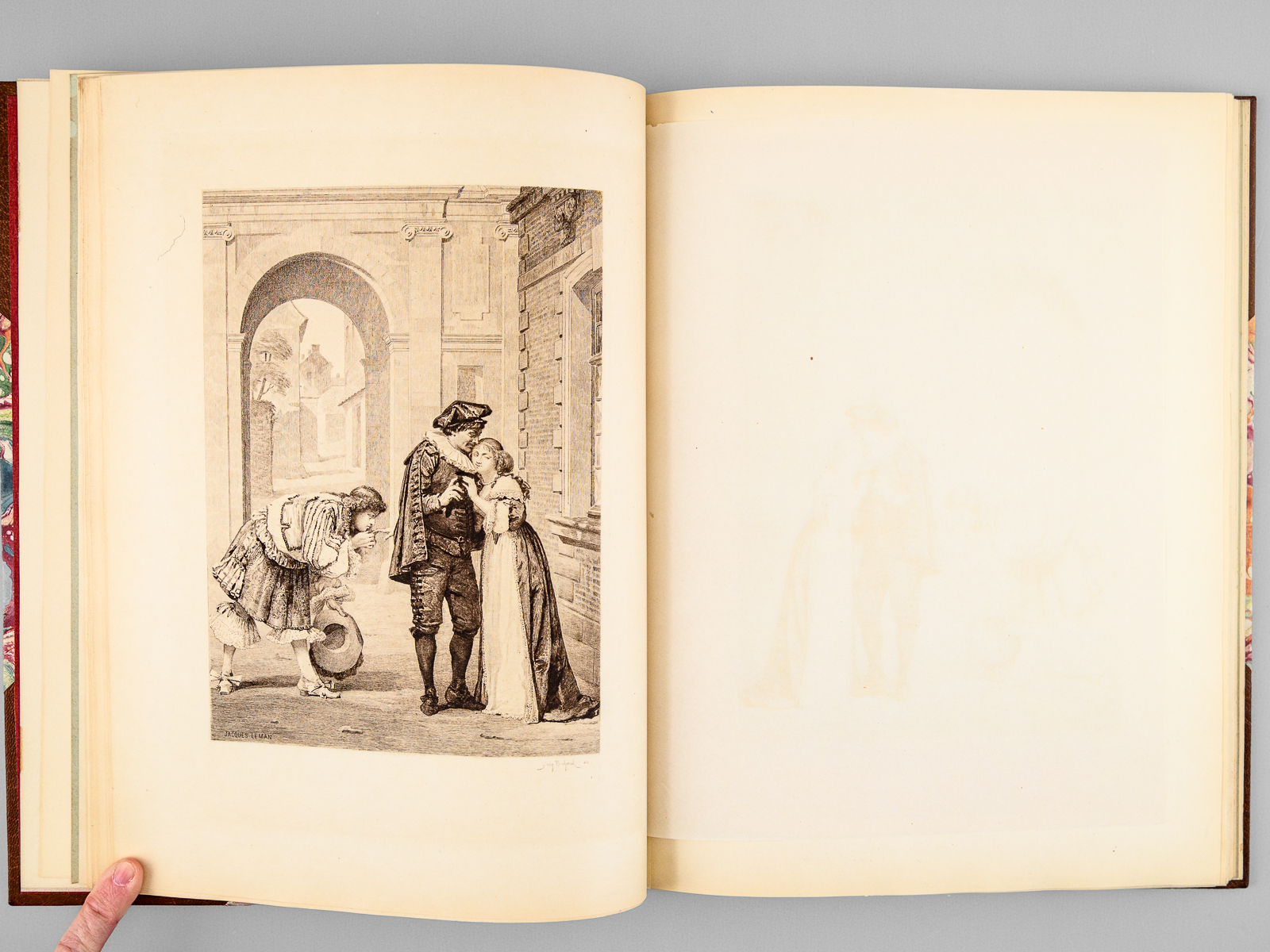 Un des 125 exemplaires sur papier du Japon, numérotés de 1 à 125 (n° 37), Illustrations par Jacques Léman, notices par Anatole de Montaiglon, 1 vol. grand in-4 (32,5 x 24,5 cm) reliure de l'époque demi-maroquin à coins brun, dos lisse orné, couvertures conservées, tête dorée, Chez J. Lemonnyer, Paris, 1882, 2 ff., 90 pp. et 1 f. n. ch. avec 1 planche hors texte, gravée par Géry-Bichard, avec une deuxième suite de toutes les gravures du texte et hors texte, tirées à part en bistre, et une troisième suite en sanguine de la grande composition hors texte