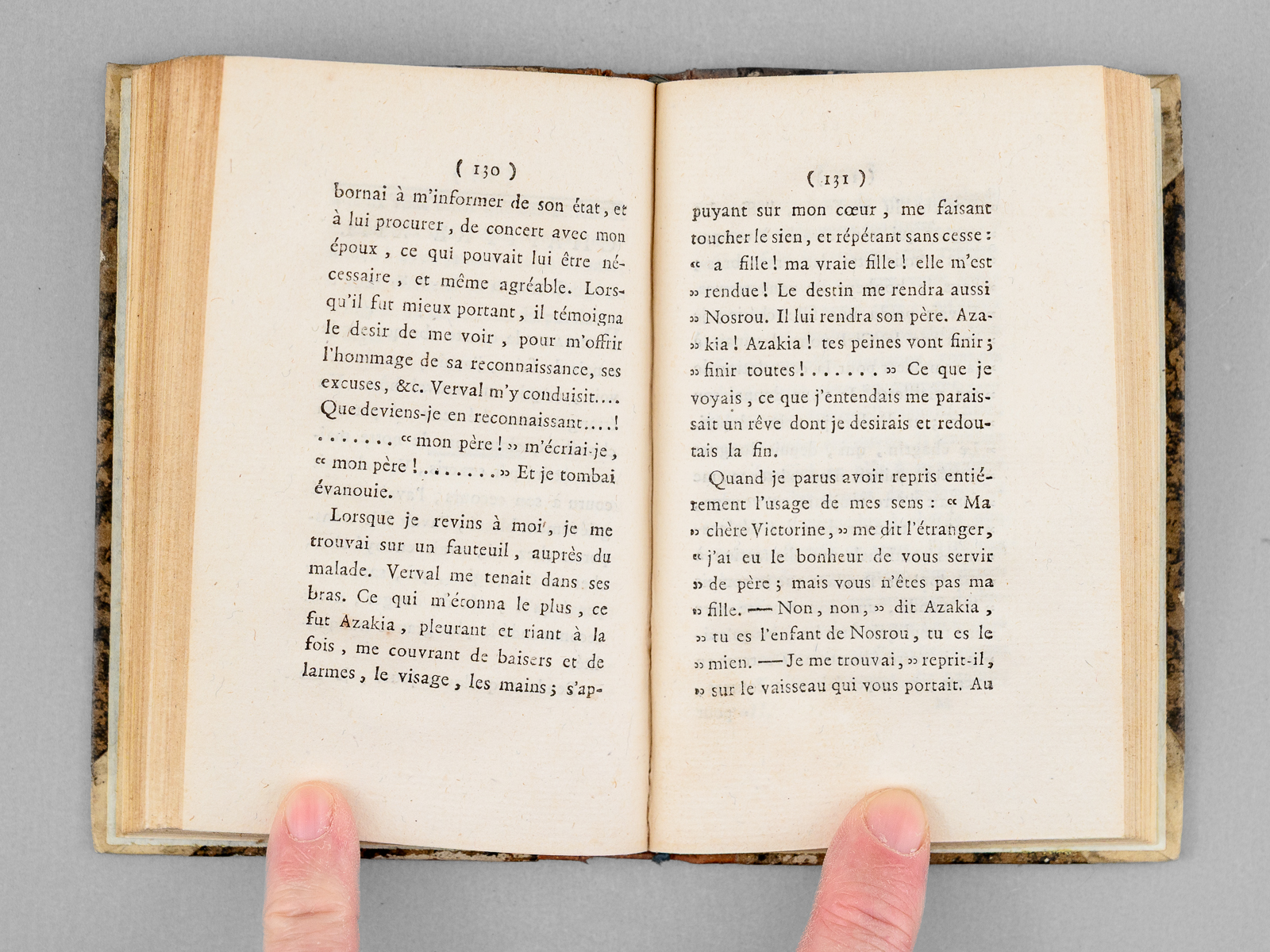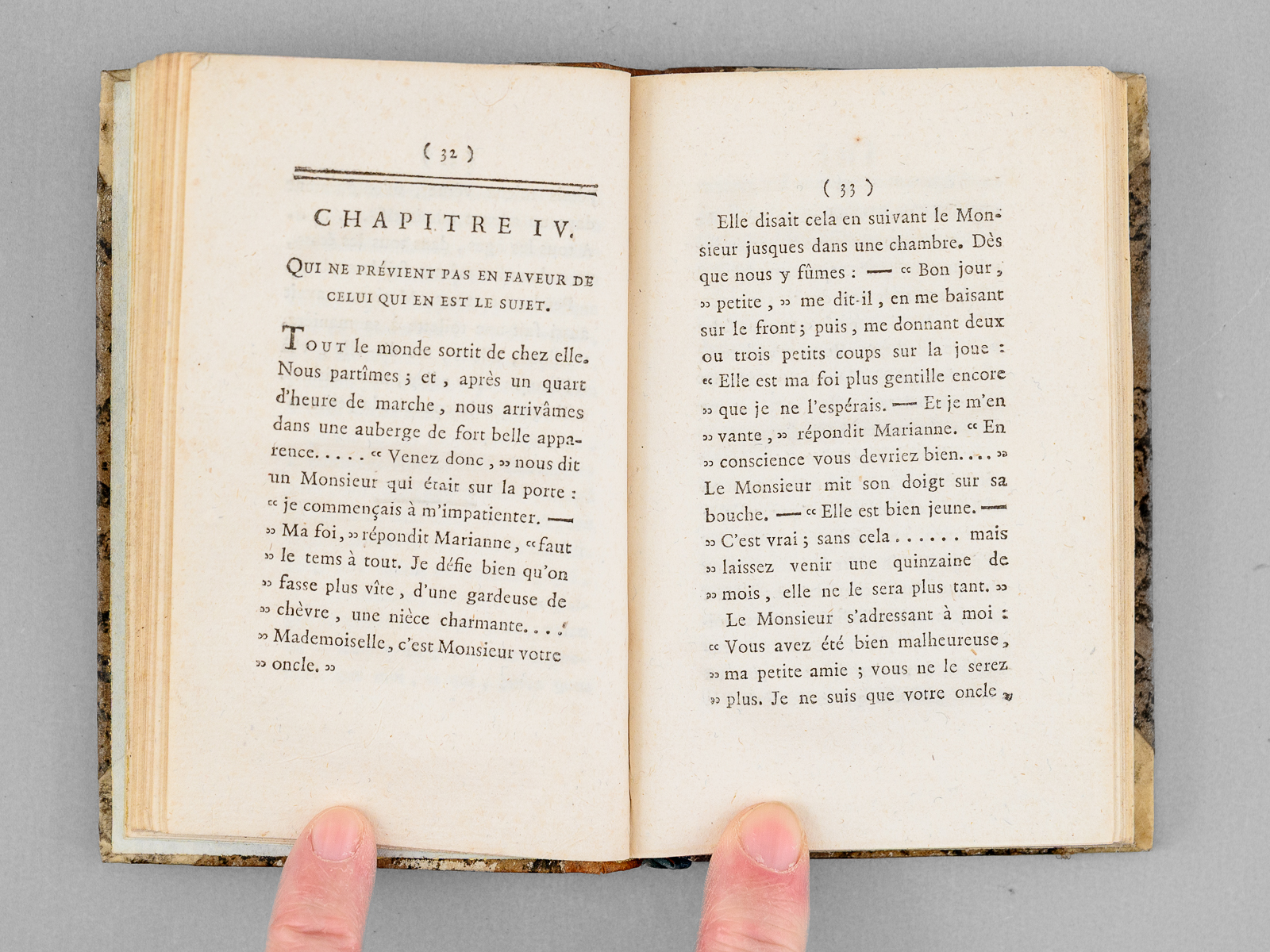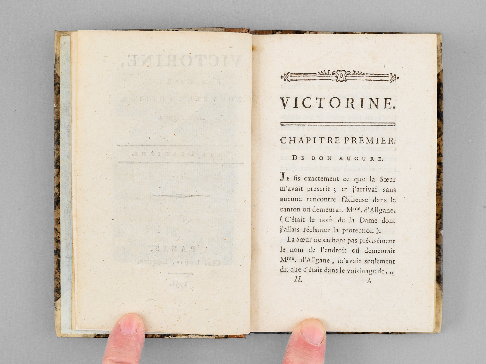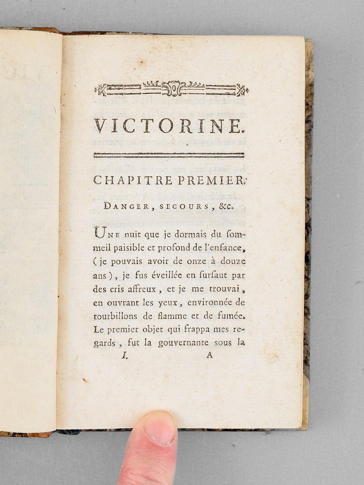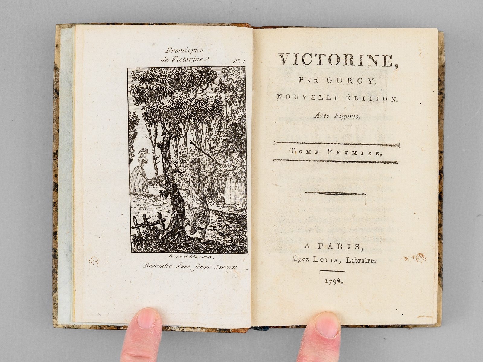 Nouvelle édition avec Figures, 2 vol. in-24 reliure de l'époque demi-veau marbré à petits coins de vélin, Chez Louis, Libraire, Paris, 1794, 2 ff., 223 pp. ; 2 ff., 211 pp. avec 2 frontispices Commentaire : Fils d'un valet de chambre du comte de Maillebois, Jean-Claude Gorgy (1753-1795) en devint le secrétaire. Il se rendit célèbre par son charmant roman 'Blançay' dans lequel il mit beaucoup de sa propre histoire, et 'Victorine' sera du même goût. Comme à son habitude, c'est l'auteur lui-même qui a dessiné les deux frontispices. Bon état (dos lég. frotté) pour cette édition rare. Quérard, III, 410 (pour la première édition de 1789) ; Larousse, GDU, VIII, 1377