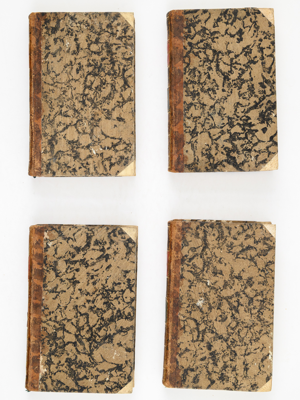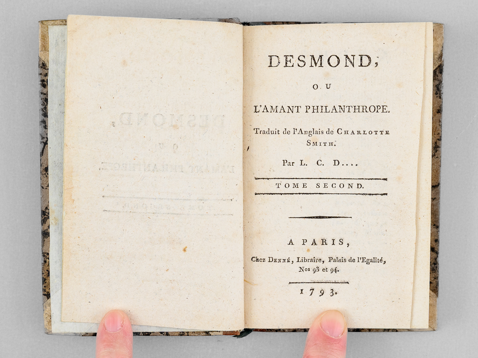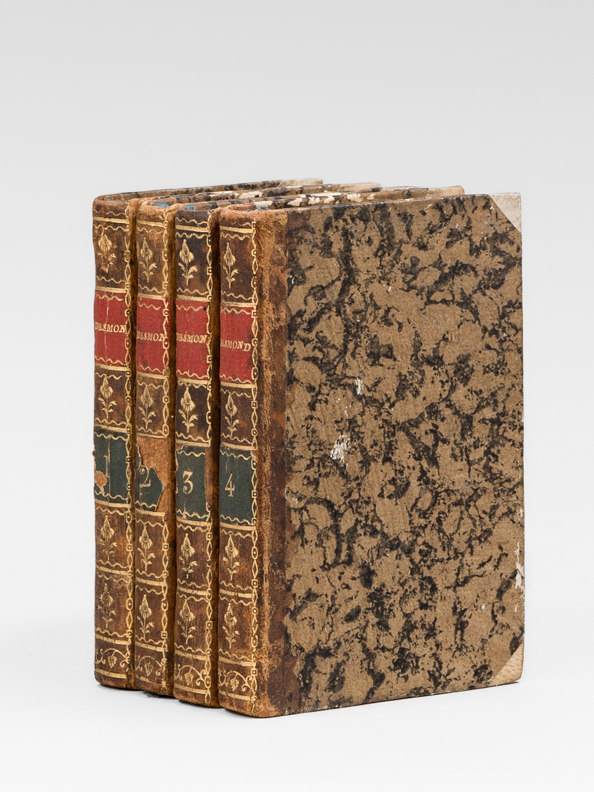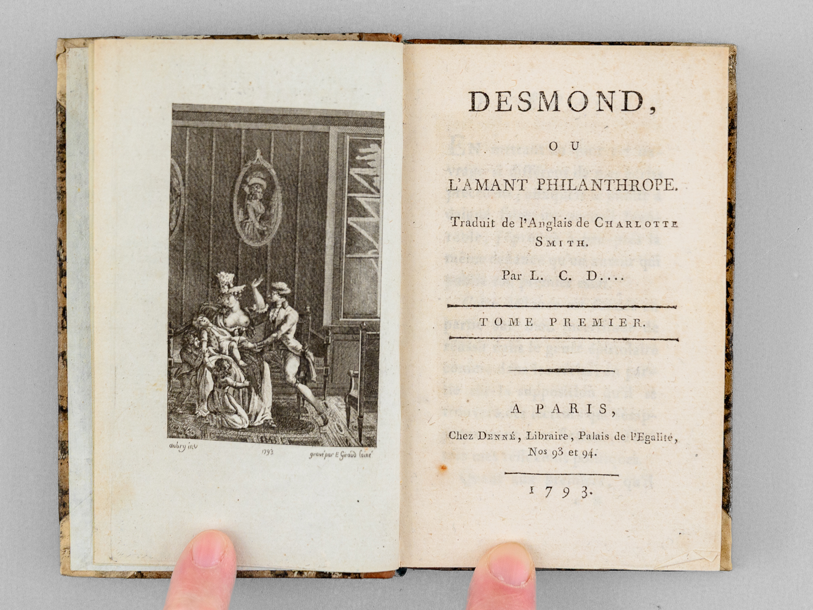 Traduit de l'Anglois de Charlotte Smith par L. C. D.... , 4 vol. in-24 reliure de l'époque demi-veau marbré à petits coins de vélin, Chez Denné, Libraire, Palais de l'Égalité, Nos 93 et 94, Paris, 1793, XII-256 pp. avec frontispice ; 2 ff., 246 pp. ; 2 ff., 264 pp. ; 2 ff., 300 pp.