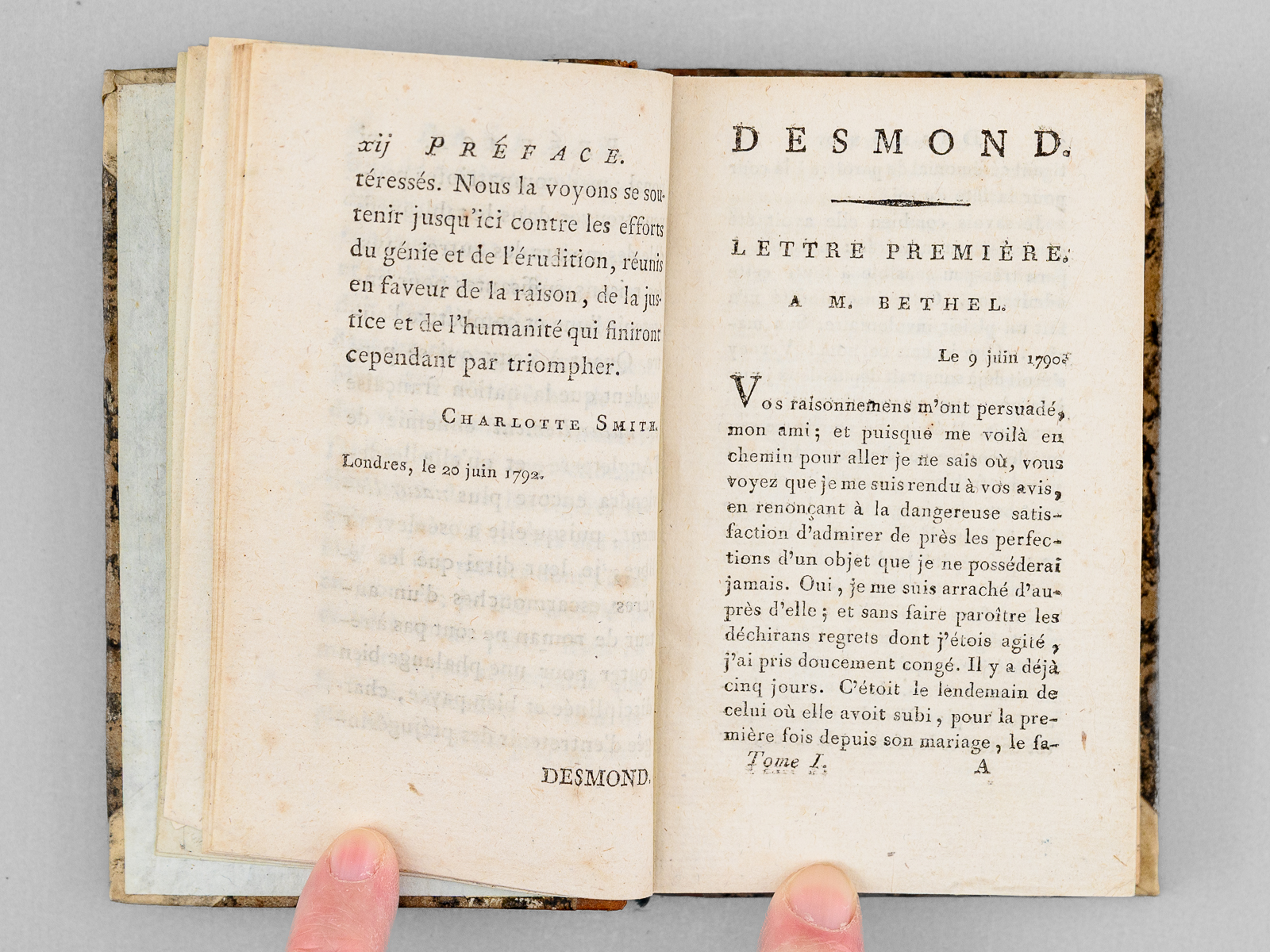 Commentaire : Très rare exemplaire de l'édition originale de la traduction française parue en 1793, et bien complète des 4 tomes. L'édition originale anglaise avait paru l'année précédente, en 1792. Lionel Desmond, jeune Anglais favorable à la Révolution FRançaise, aime passionnément Geraldine Verney, prisonnière d'un mariage avec un mari débauché qui finit par tenter de la « vendre » à un duc français. Desmond la protège secrètement, la sauvant de la misère puis d'une attaque de bandits alors qu'elle rejoint son époux mourant en France. Sur son lit de mort, Mr. Verney se repent et bénit leur union. Le roman s'achève par le mariage des deux amants, symbolisant la victoire de la liberté individuelle et politique sur la tyrannie. La romancière et poétesse anglaise Charlotte Turner, dite Charlotte Smith (1749-1806) est l'auteur de plusieurs romans gothiques, et son oeuvre est très marquée par les problèmes sociaux et politiques de son temps, et notamment par la Révolution Française. Elle influencera Jane Austen et Charles Dickens. Bon état (petits manques en pièces de tomaison, bon exemplaire par ailleurs).