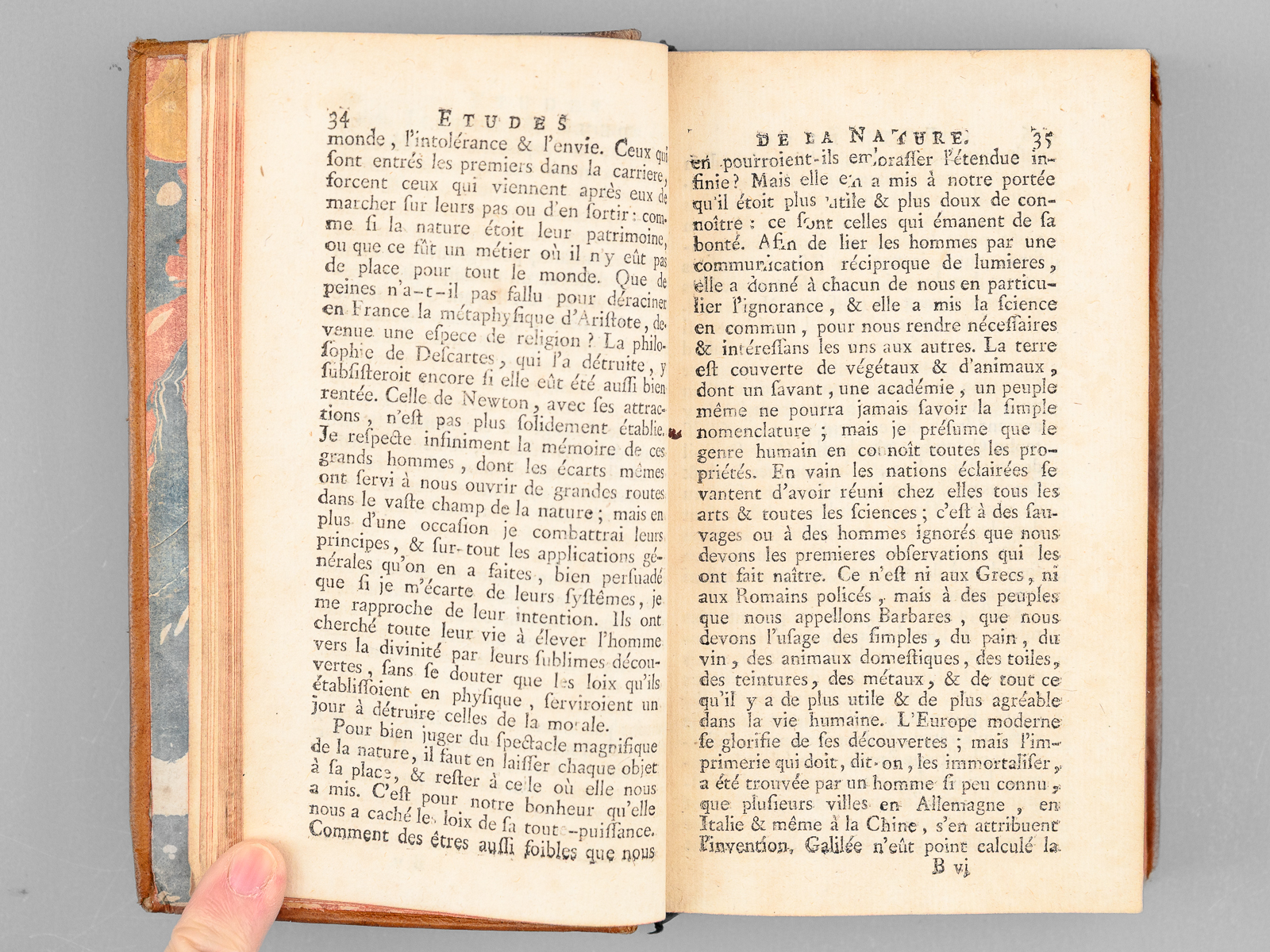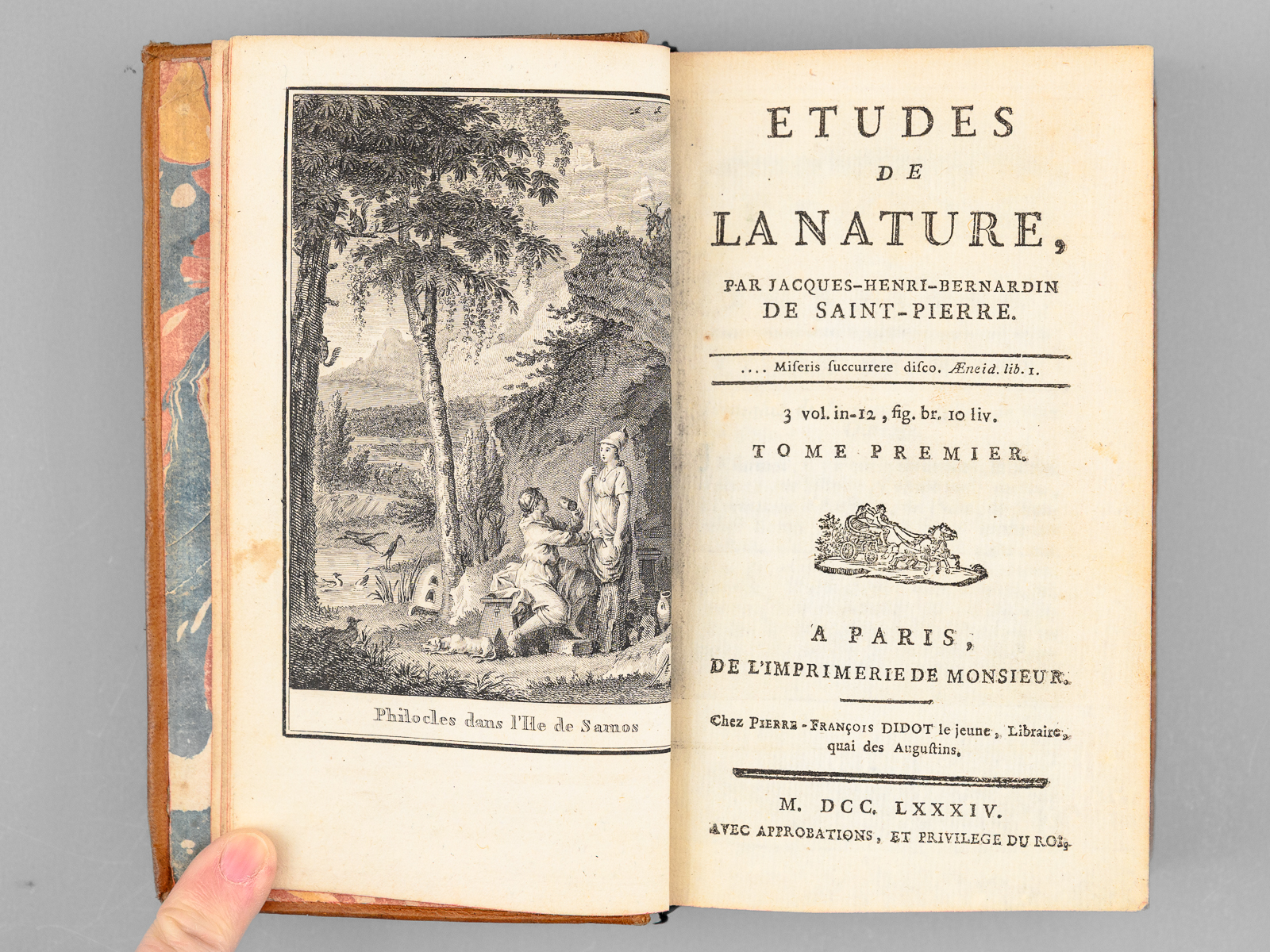 3 vol. in-12 reliure de l'époque pleine basane marbrée, De l'Imprimerie de Monsieur, Chez Pierre-François Didot le jeune, Paris, 1784, 2 ff., 473 pp. avec frontispice et une planche dépliante ; 2 ff., 538 pp. avec trois planches dépliantes ; 2 ff., 452 pp. Commentaire : Charmant exemplaire de cette jolie contrefaçon parue à la date de l'édition originale. Deux autres volumes viendront ensuite se rajouter au trois premiers, avec le roman de 'Paul et Virginie' et les 'Voeux d'un Solitaire'. Bon état (petits mq. de cuir sur un mors, coins lég. frottés). Tchemerzine, X, 147 et 148