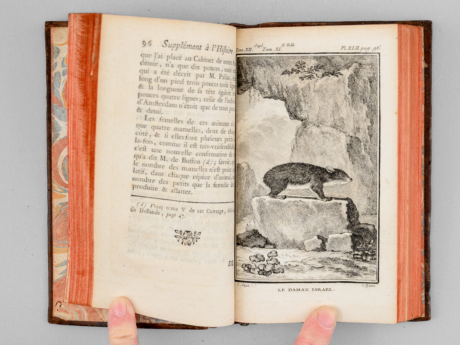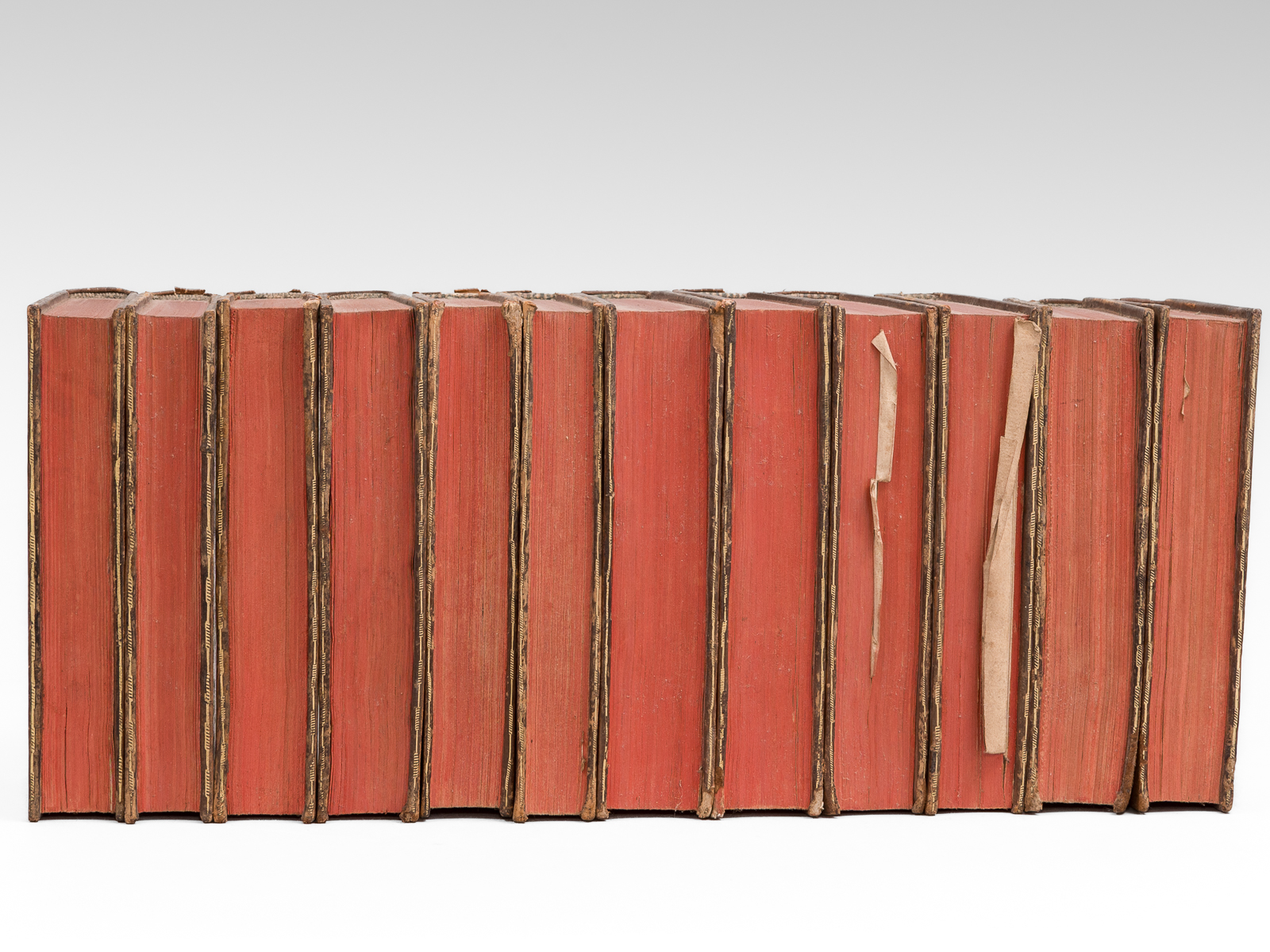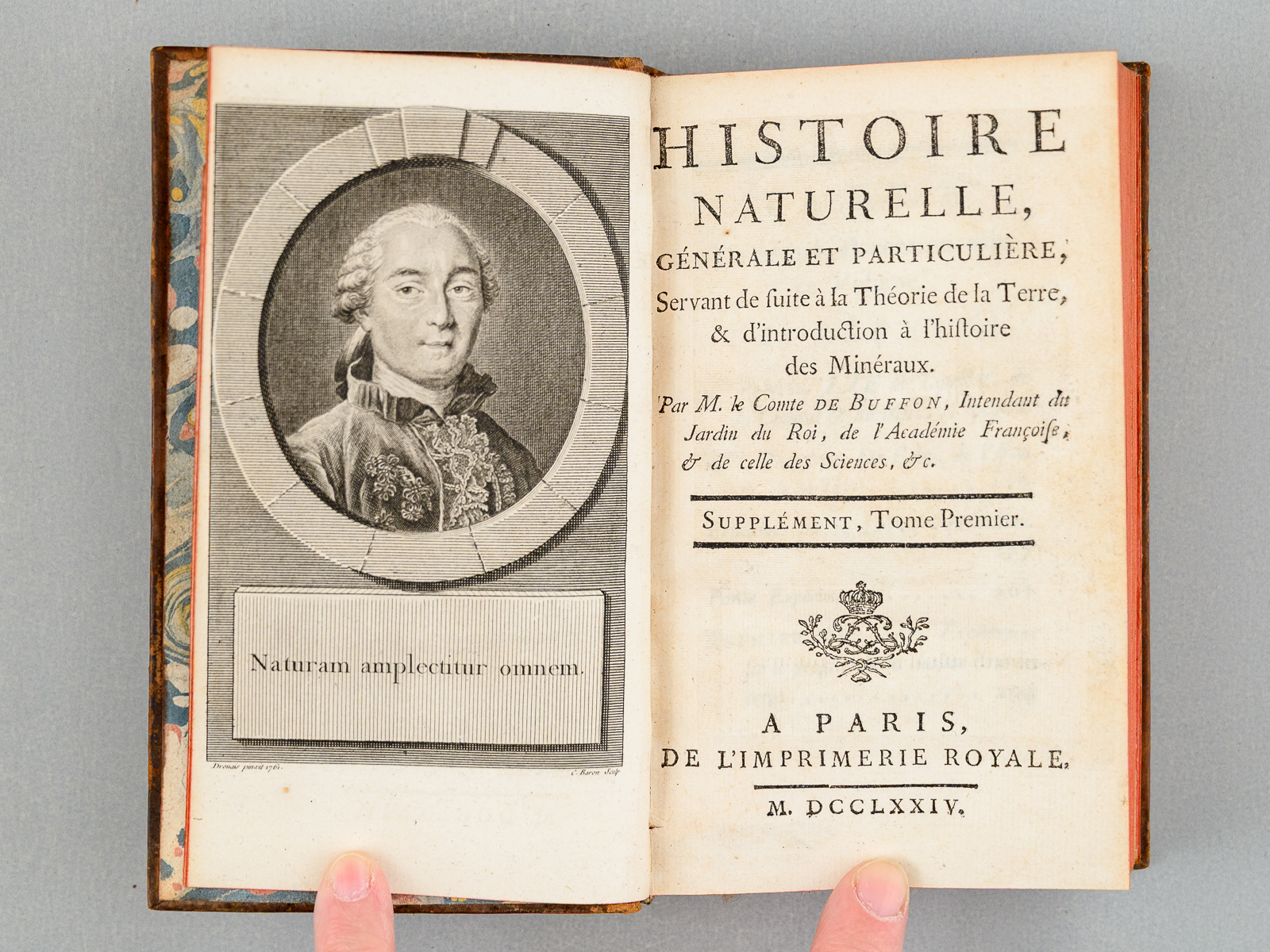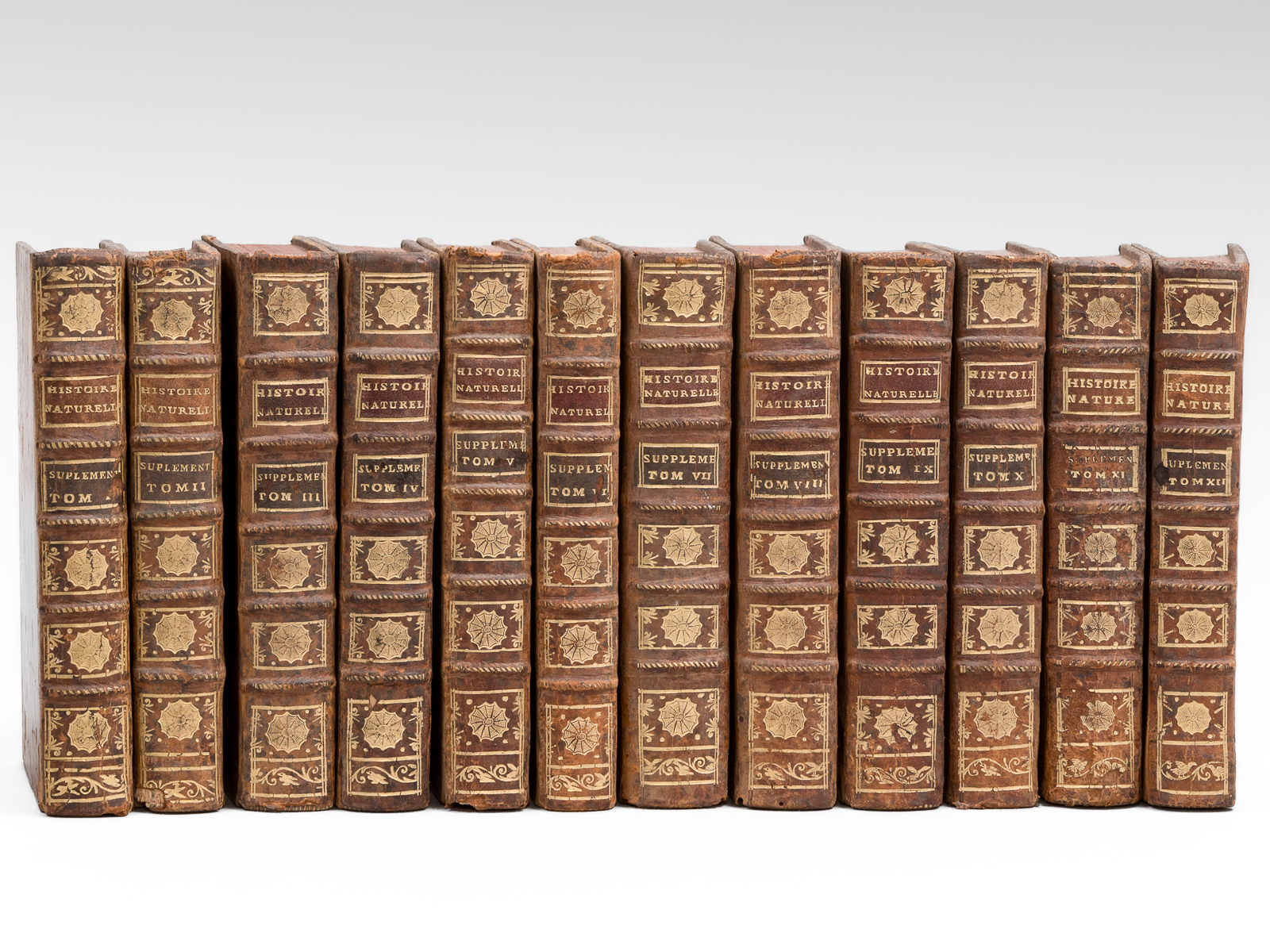 12 vol. in-12 reliure de l'époque plein veau marbré, dos à 5 nerfs orné doré (à la 'toile d'araignée'), Imprimerie Royale, 1774-1782, Tome I : 3 ff., 422 pp. avec portrait en frontispice ; Tome II : 3 ff., 340-xliv pp. et 1 f. n. ch. avec 16 planches hors texte (dont une dépliante) ; Tome III : 3 ff., 434 pp. ; Tome IV : 3 ff., 370-liij pp. ; Tome V : 5 ff., 334 pp. avec 35 planches hors texte ; Tome VI : 4 ff., 330-xxxviij pp. avec 32 planches hors texte ; Tome VII : 4 ff., 573 pp. ; Tome VIII : 4 ff., 416-xxxiv pp. avec 6 planches hors texte ; Tome IX : 1 f., vj-504 pp.avec une carte dépliante (Chaîne des Montagnes de Langres) ; Tome X : 1 f., v-372-xliij pp., avec 6 planches hors texte et une grande carte dépliante (Carte des régions polaires) ; Tome XI : 2 ff., 412 pp. avec 29 planches hors texte ; Tome XII : 3 ff., 290-xxxix pp., avec 20 planches hors texte
