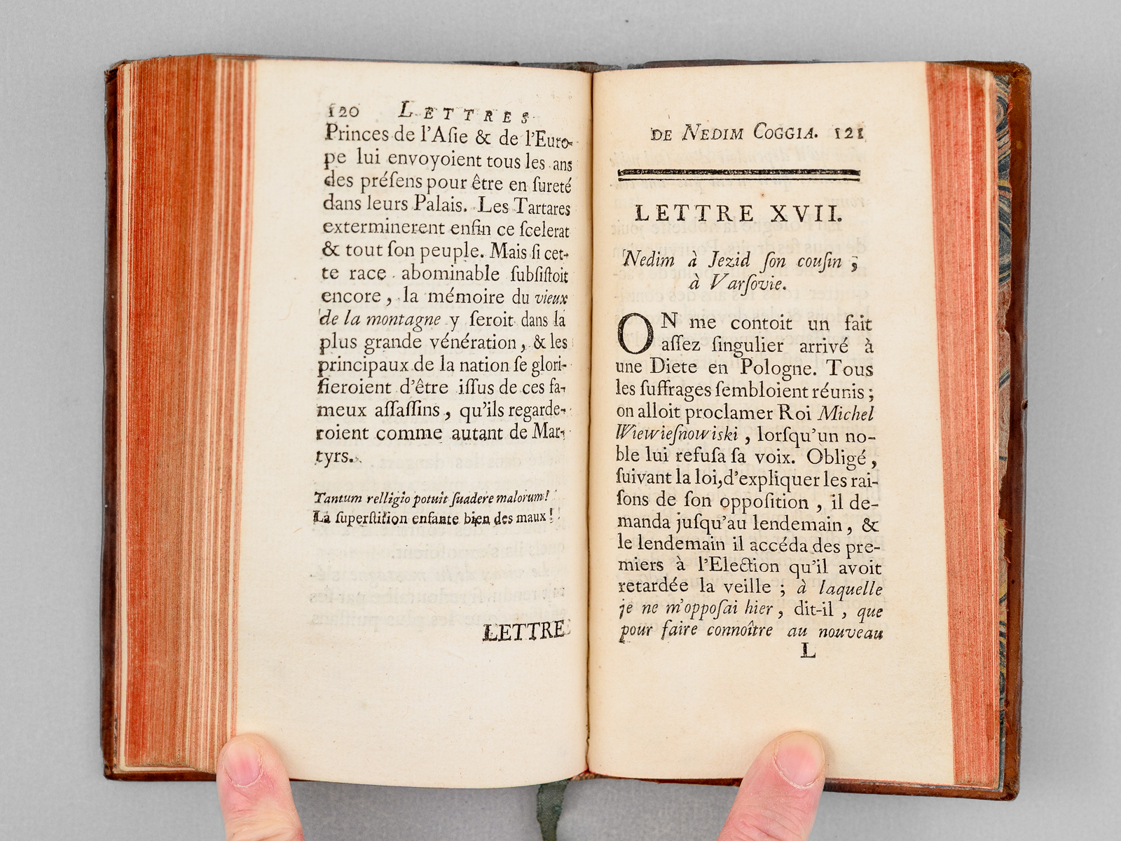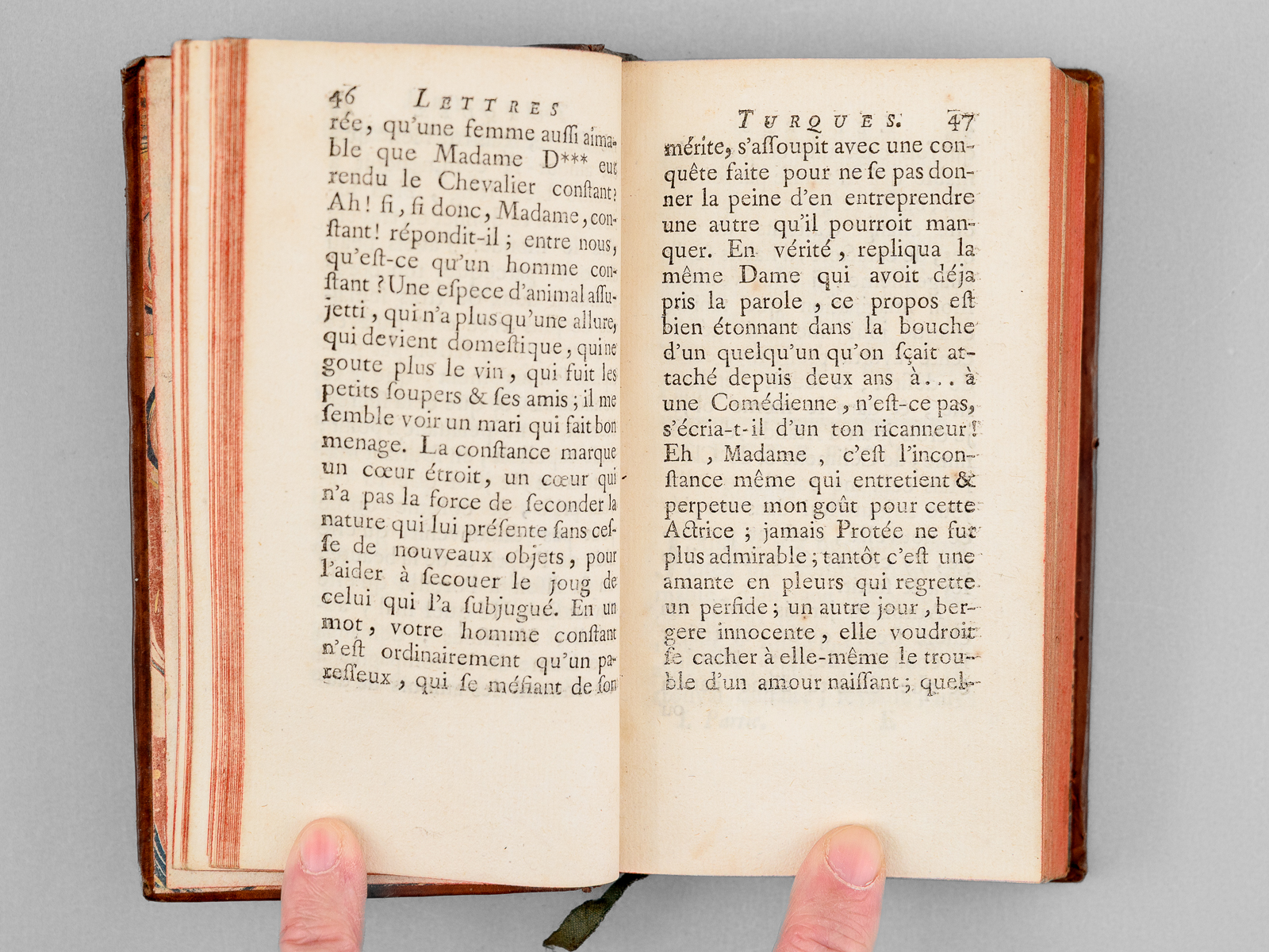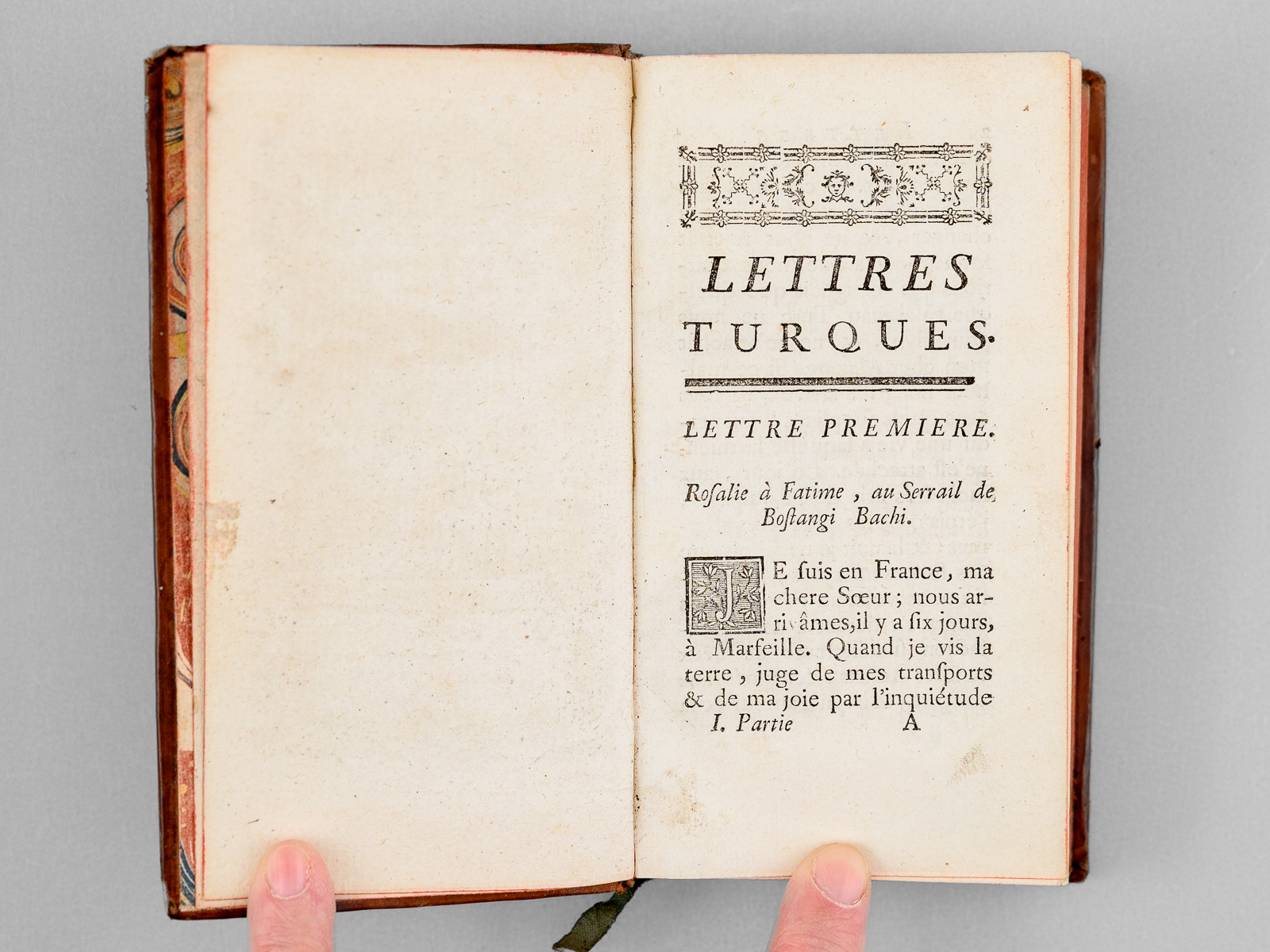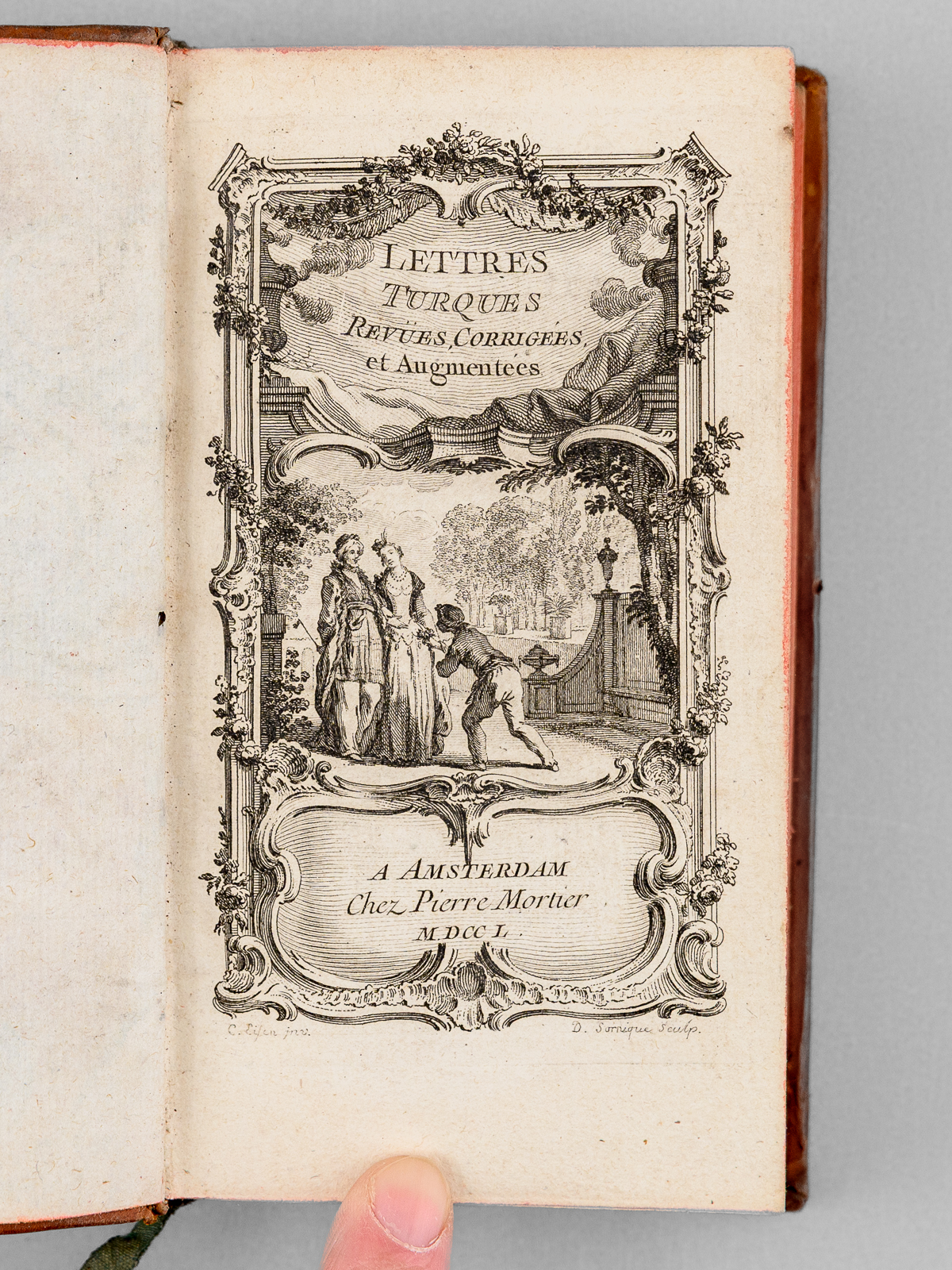 1 vol. in-12 reliure de l'époque plein veau marbré, dos à 5 nerfs orné, Chez Pierre Mortier, Amsterdam, 1750, 1 f. (titre gravé), 178 pp., 1 f. (titre gravé), 228 pp. Commentaire : A la fin des 'Lettres de Nedim Coggia' on trouve la Comédie 'Les Veuves' dont l'action se situe à 'Constantinople'. Bon état (petit travail de vers au dos en queue, très petite mouill. marginale, bon exemplaire par ailleurs).