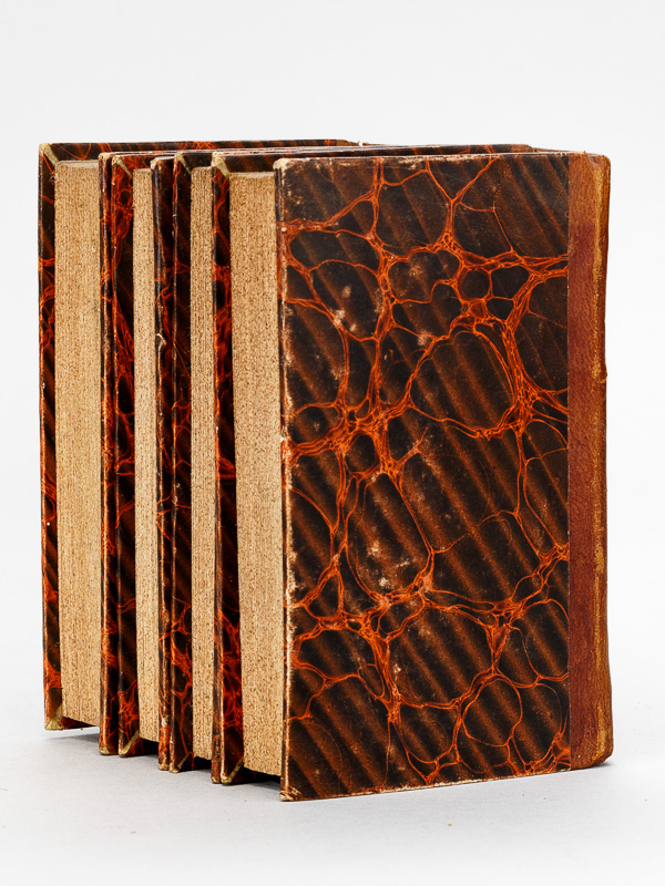 5 tomes en 4 vol. petit in-12 reliure de l'poquedemi-basane havane, dos lisse orné en long, Ménard et Desenne, Fils, Paris, 1820, 2 ff, frontispice, xxiv-401-3 pp. avec 2 planches hors texte ; 2 ff., 295 pp. avec frontispice ; 2 ff., 327 pp. avec frontispice ; 2 ff., 327 pp. avec frontispice et 227 pp. avec frontispice Commentaire : Charmant petit exemplaire complet des 5 tomes en état très satisfaisant (petit travail de vers en début du premier tome, qq. petits frott. et minimes accrocs, très bon état par ailleurs). Néricault Destouche connut notamment un beau succès avec son amusante et charmante comédie 'Le Philosophe marié ou le Mari honteux de l'Etre'.