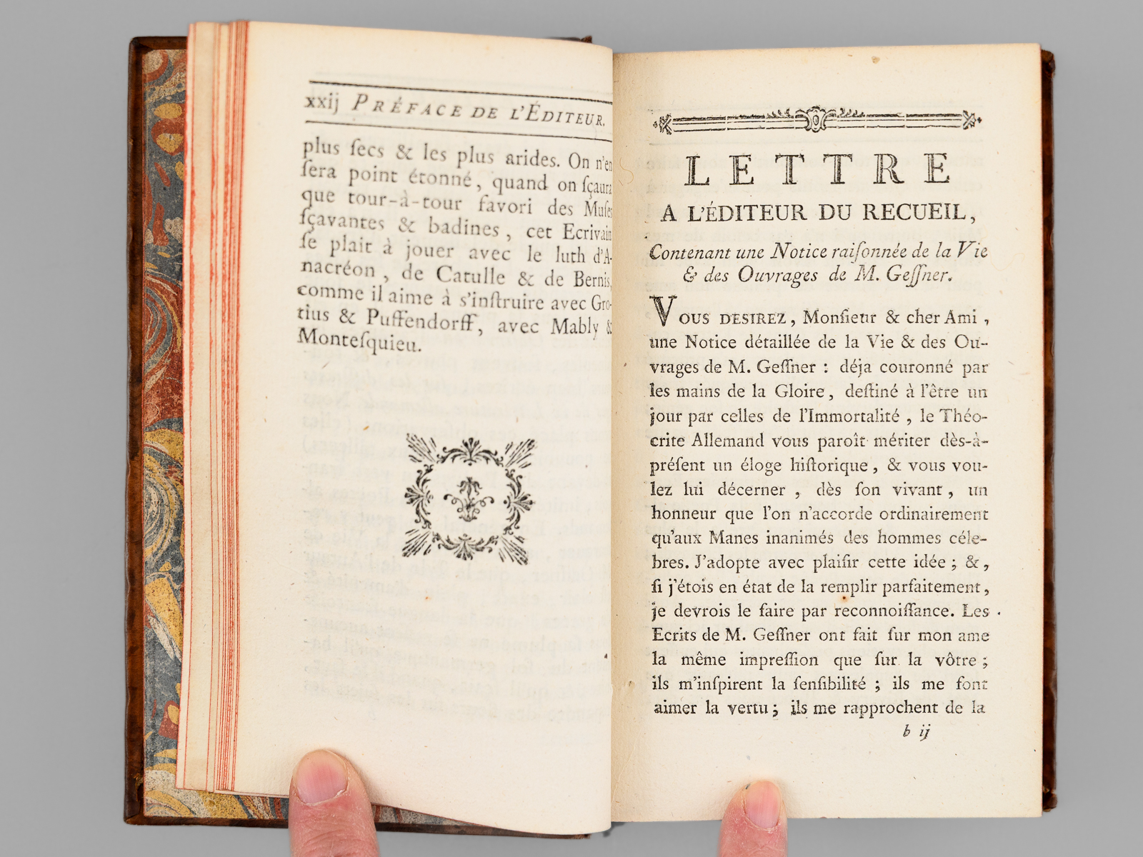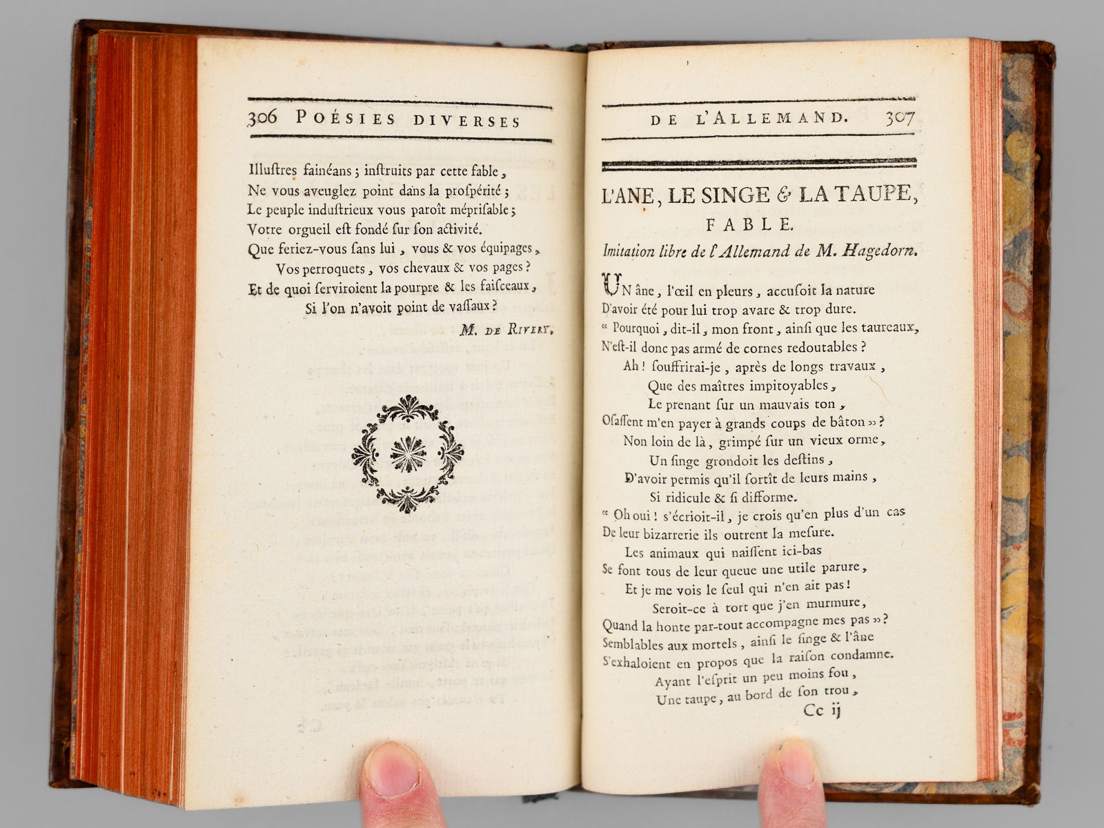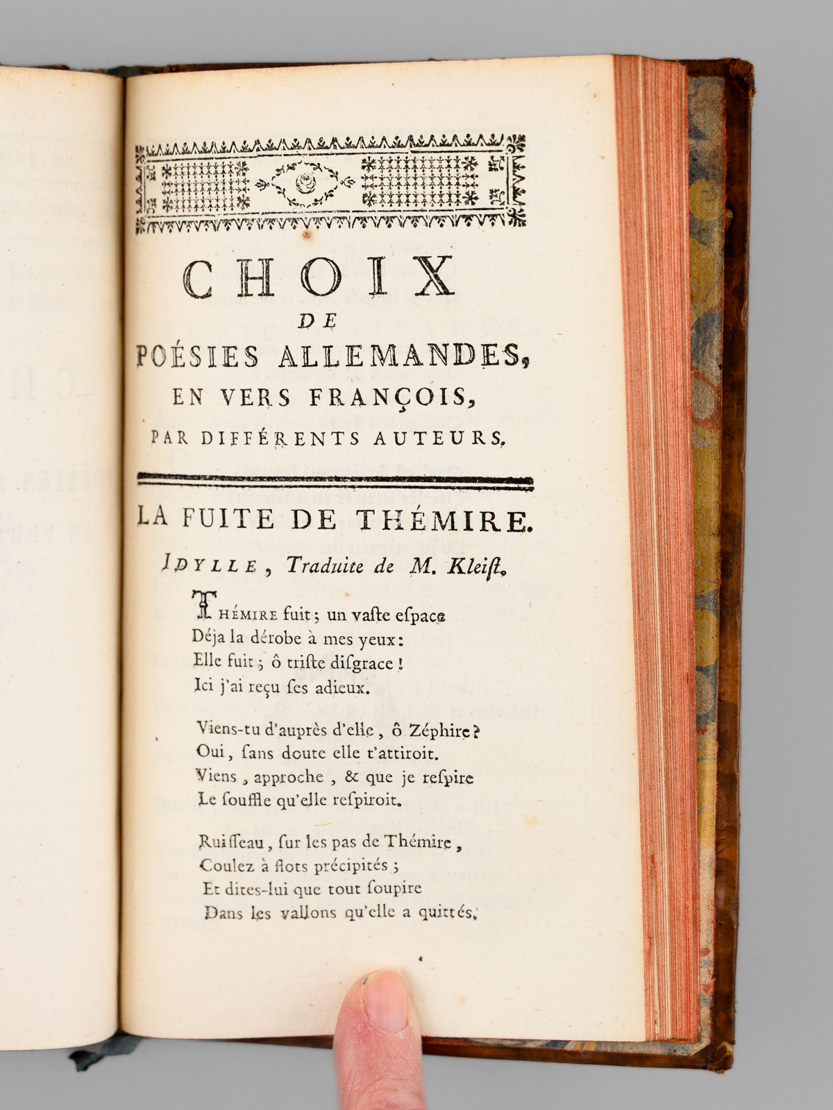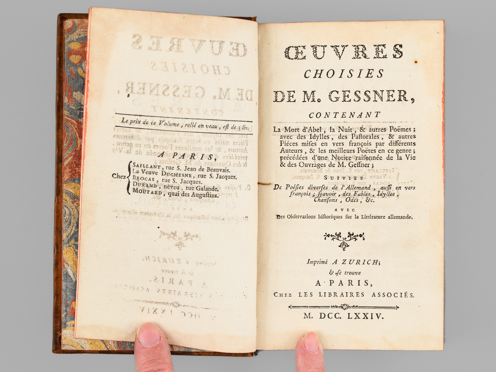 Suivies de Poésies diverses de l'Allemand, aussi en vers françois ; sçavoir des Fables, Idylles, Chansons, Odes, &c. avec des Observations historiques sur la Littérature Allemande, 1 vol. in-12 reliure de l'époque plein veau marbré, dos à 5 nerfs dorés orné, Chez les Libraires Associés, Imprimé à Zurich & se trouve à Paris, 1774, lxxxiv-342 pp. et 1 f. n. ch. (Catalogue) Commentaire : Bon état (petits mq. en coiffes, coins lég. frottés, très bon état par ailleurs)