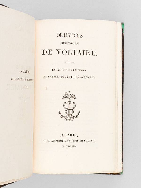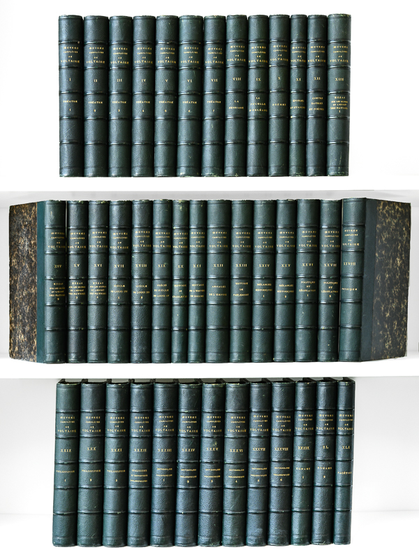 41 vol. in-8 reliure demi-chagrin noir, dos à 5 nerfs orné, Renouard, Paris, 1819-1821 : Rappel des titres : Oeuvres complètes (Tomes 1 à 41 sur 66) Tomes 1 à 7 : Théâtre ; 8 : La Henriade (1819, 434 p.) ; 9 : La Pucelle d'Orléans ; 10 : Poèmes ; 11 : Epîtres et stances ; 12 : Contes en vers. Satires et poésies mêlées ; 13-16 : Essai sur les moeurs et l'Esprit des Nations ; 17-18 : Le siècle de Louis XIV ; 19 : Précis du siècle de Louis XV ; 20 : Histoire de Charles IX ; 21 : Histoire de l'empire de Russie ; 22 : Annales de l'Empire ; 23 : Histoire du Parlement de Paris ; 24-25 : Mélanges historiques ; 26-27 : Politique et législation ; 28 : Physique ; 29 - 31 : Philosophie ; 32 : Dialogues et Entretiens philosophiques ; 33-38 : Dictionnaire philosophique ; 39-40 : Romans ; 41 : Facéties Commentaire : Joli ensemble, certes incomplet, mais réunissant les 41 premiers tomes de cette belle édition Renouard, agréablement illustrée. Manquent à la série complète les 'Mélanges littéraires', les commentaires sur Corneille, la Correspondance, la Vie de Voltaire par Condorcet et les tables. Etat très satisfaisant (41 tomes sur 66, qq. coins frottés, belle fraîcheur intérieure et ensemble très propre et très décoratif par ailleurs). Prix en l'état. Bengesco, IV, 2149