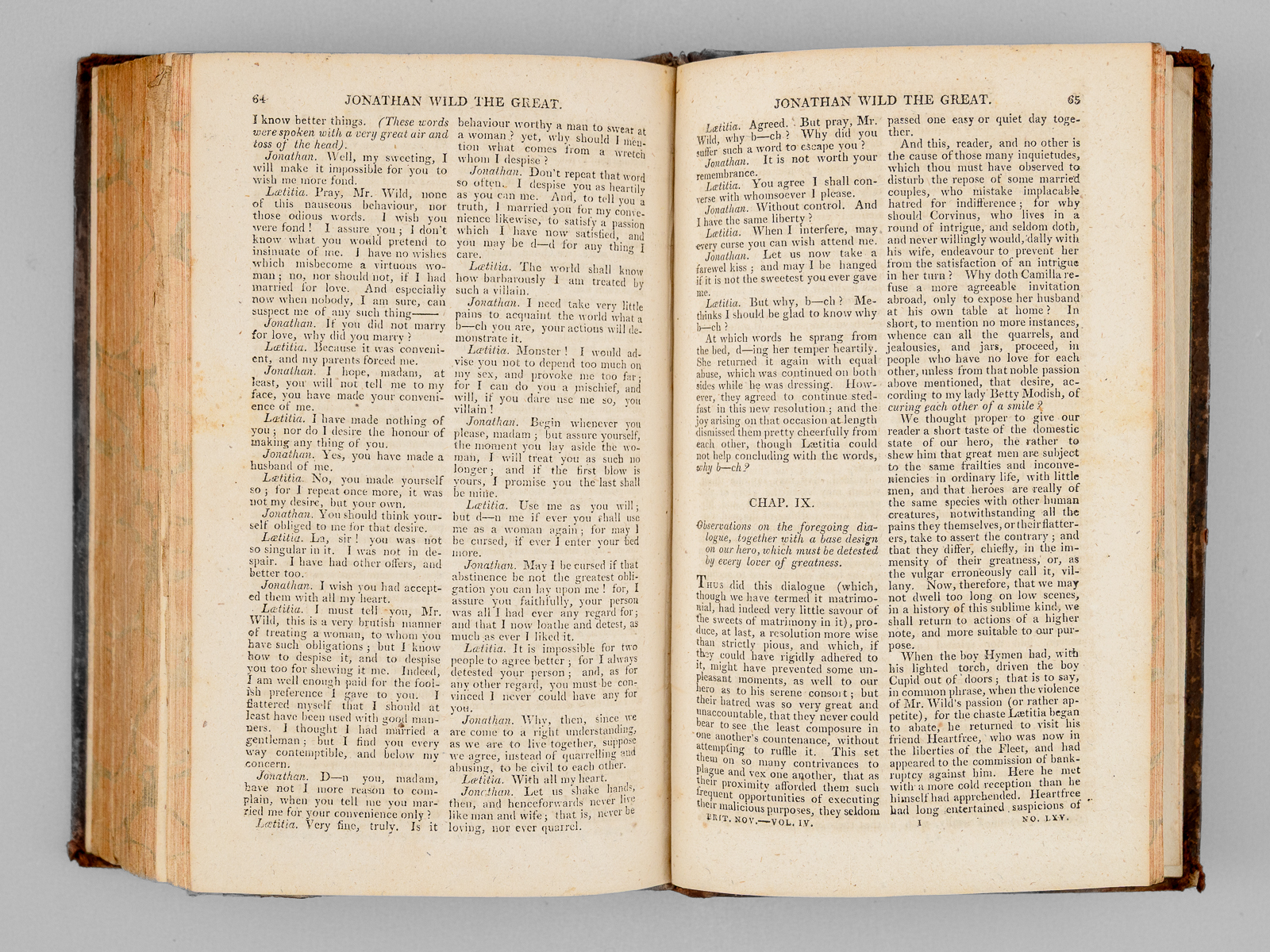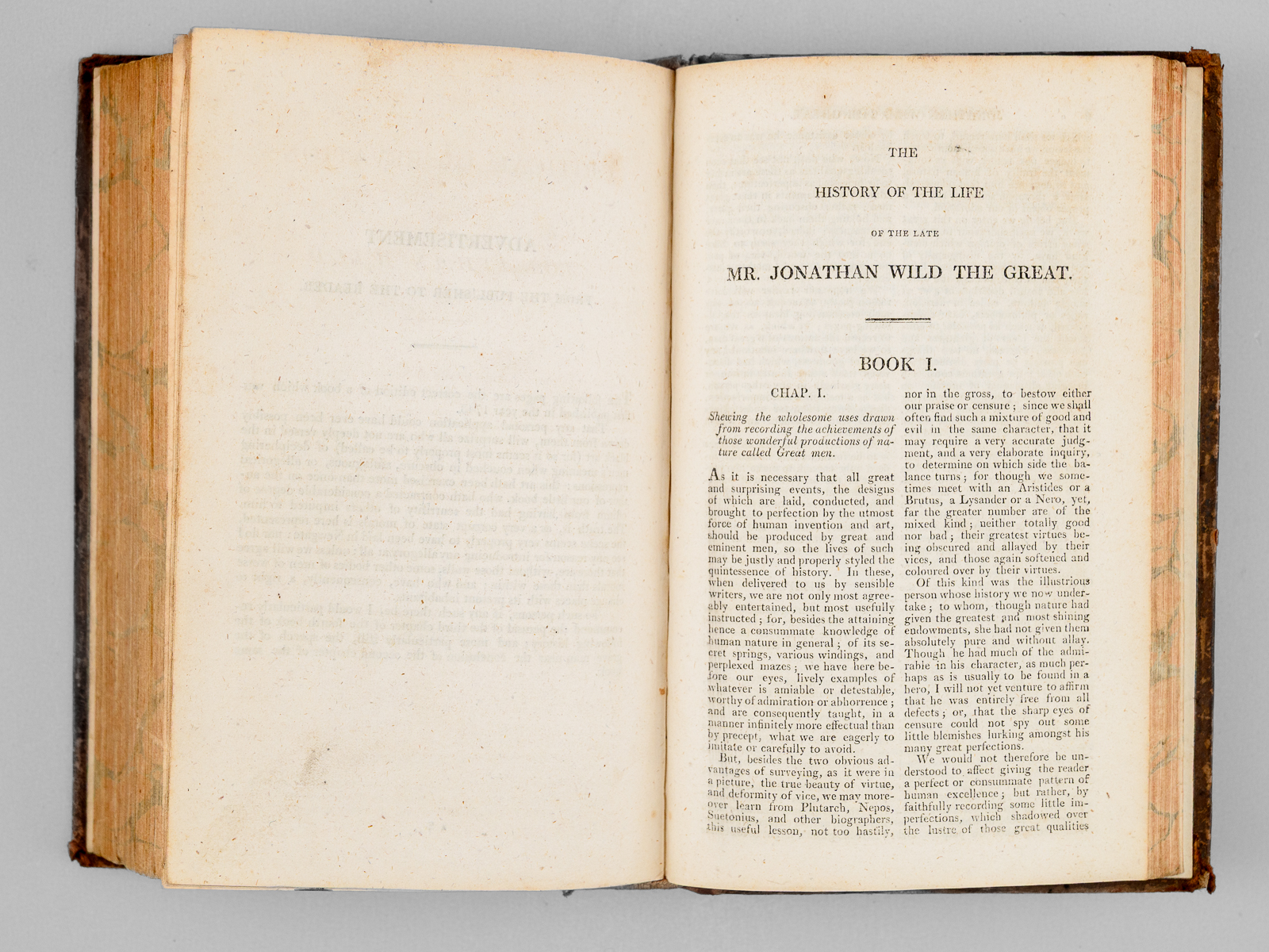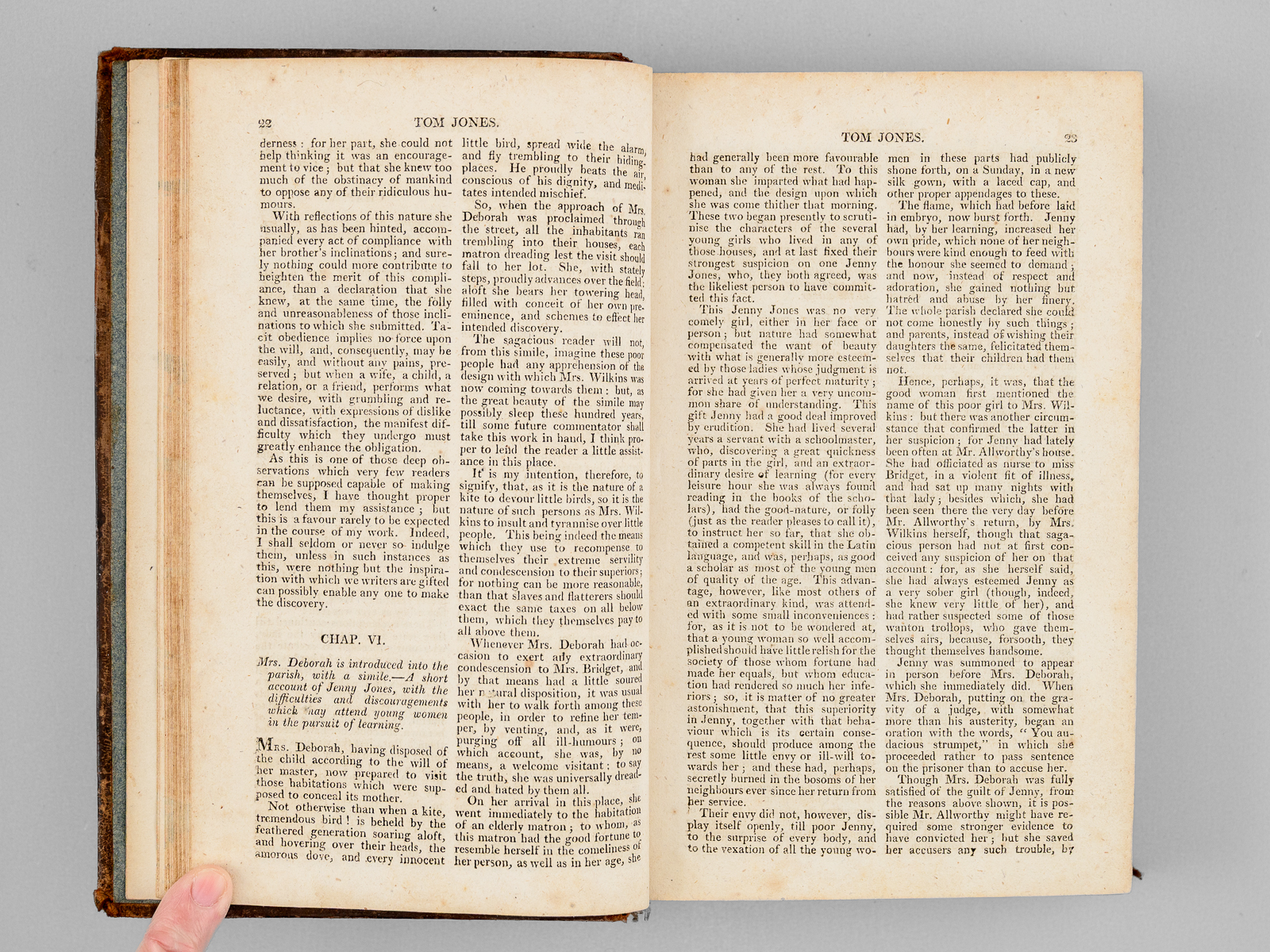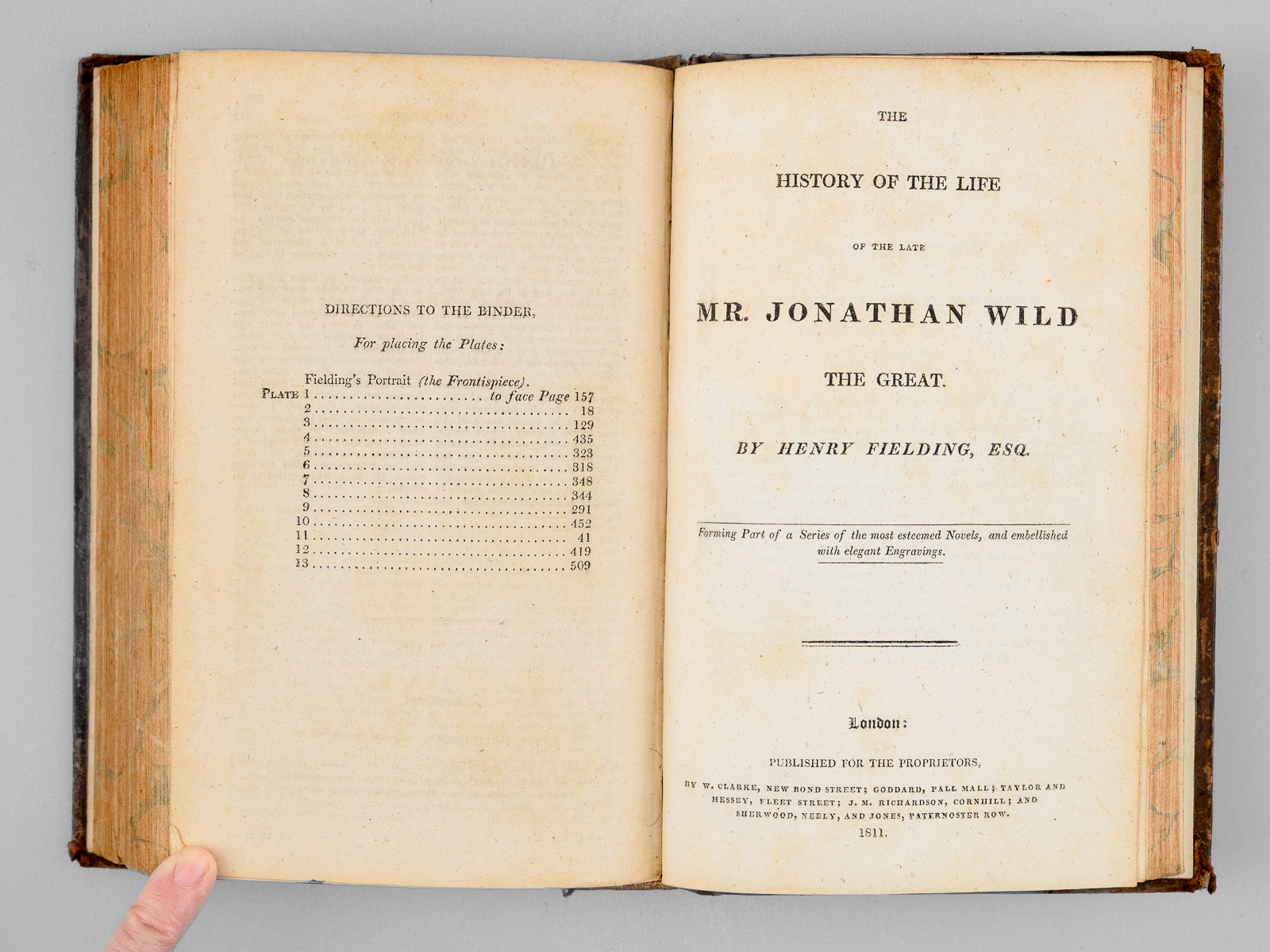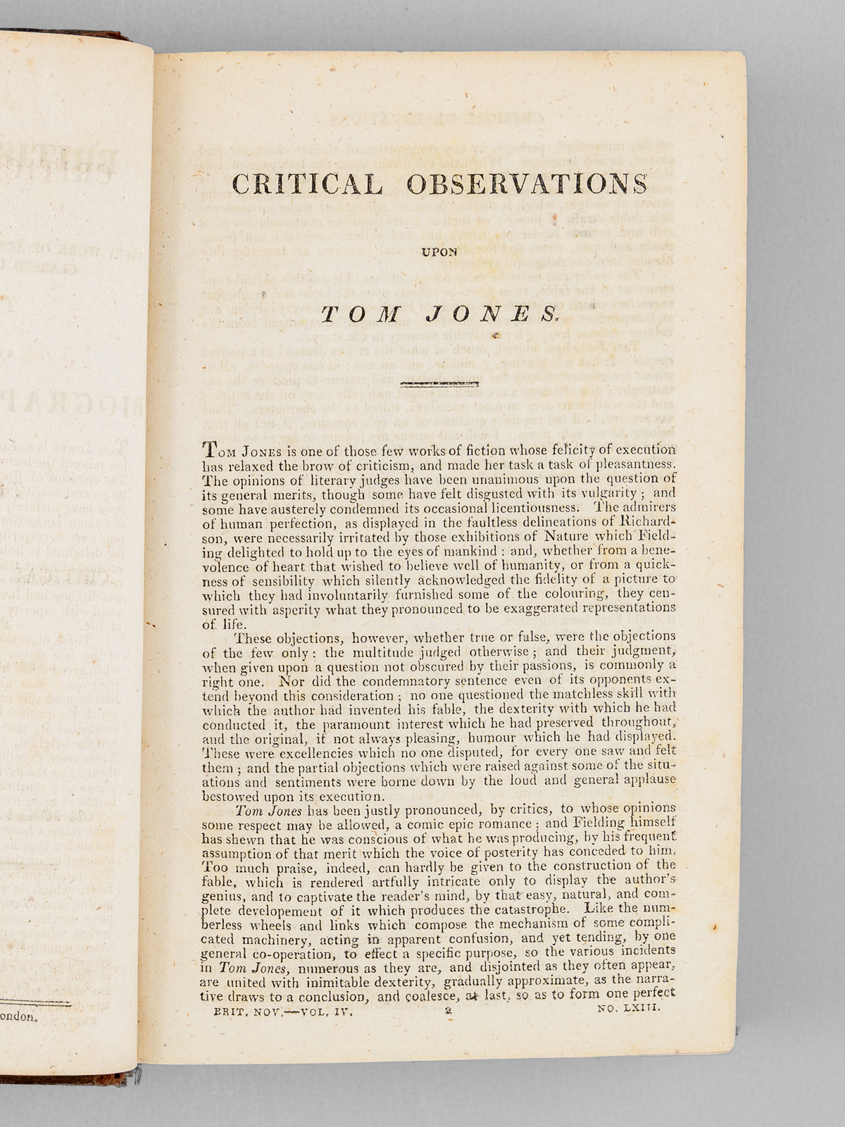 1 vol. 8vo. full-leather bound, frontispice + 13 plates, Published for the Proprietors, London, 1811. X-513 + 106 pp. Full title : The British novelists ; Comprising every work of acknowledged merit which is usually classed under the denomination of novels. Accompanied with biographical sketches of the authors, and a critical preface to each work. Volume IV. Containing Tom Jones and Jonathan Wild the Great, Commentaire : VG vopy. In this copy, the critical observations (4 pages long) reg. Jonathan Wild the Great have never been bound.