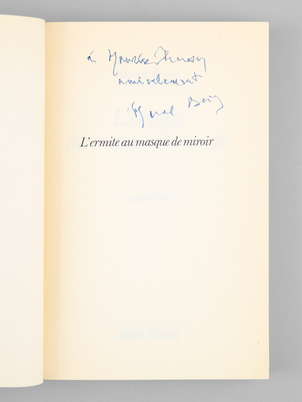 6 vol. in-8 br., Albin Michel, Paris, Le journal du visiteur - Villa des Hasard - Le château de la princesse Ilse - Algues - La fête de la Tour des Ames - L'Ermite au masque de miroir : 1980, 1984, 1981, 1976, 1974, 1982 Commentaire : 5 des 6 romans sont dédicacés, le second est accompagné d'une carte de visite avec petite mention autographe de l'auteur. Bon ensemble (rouss. sur couv.), de la bibliothèque du grand écrivain Maurice Druon, Secrétaire Perpétuel de l'Académie Française de 1985 à 1999. Prix du lot non séparable.