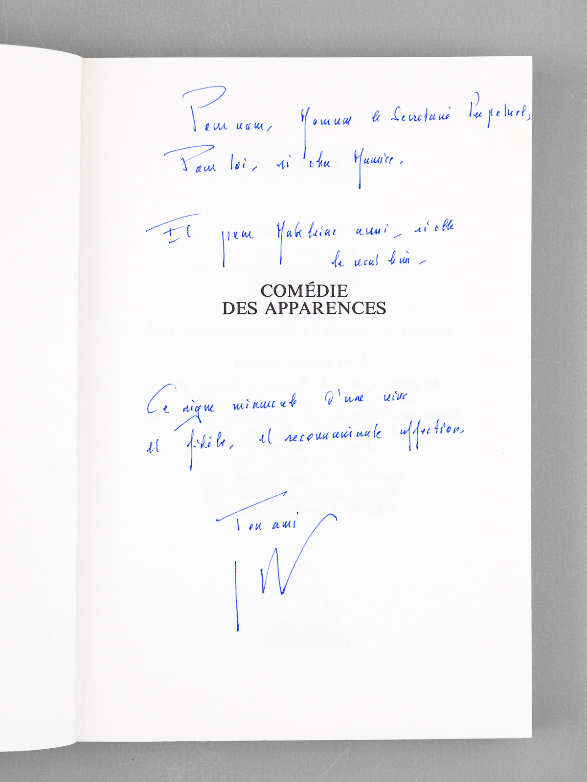 [ Lot de 6 ouvrages dédicacés par l'auteur à Maurice Druon ] Et des amours desquelles nous parlons... - Ce rendez-vous avec la gloire - Rien ne va plus... Nouvelles - Battements de coeur - Comédie des Apparences - Lettre &agrav