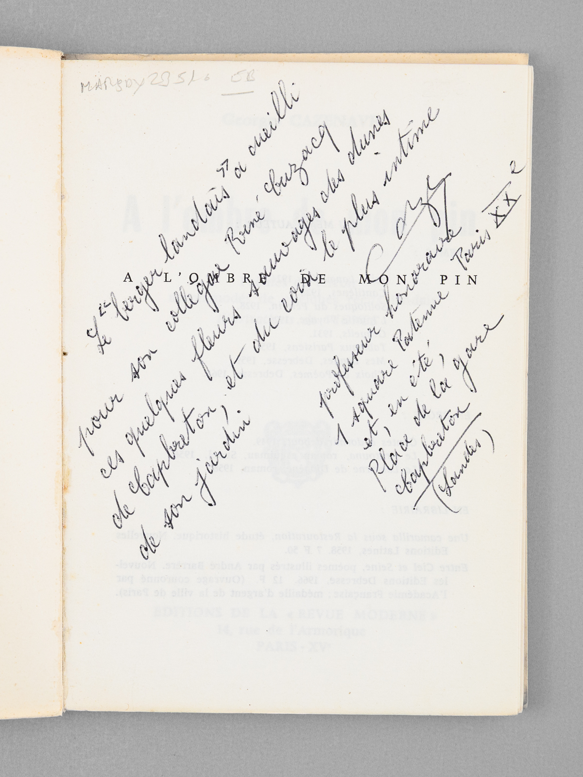 Commentaire : Né à Hanoï en 1905 dans « une des plus anciennes familles de Capbreton », Georges Cazenave est l'auteur d'une oeuvre poétique plusieurs fois récompensée. Bel envoi de l'auteur : 'Le berger landais a cueilli pour son collègue René Cuzacq ces quelques fleurs sauvages des dunes de Capbreton, et du coin le plus intime de son jardin'. Comme à son habitude, René Cuzacq a annoté son exemplaire au stylo. Bon état (qq. annotations)