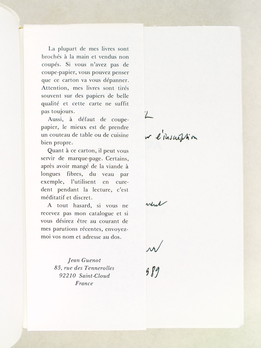 Un des quelques exemplaires sur vélin de chiffon numérotés de 11 à 330 numérotés 0000 et 'rigoureusement hors commerce et destinés à la famille ou aux amis de JG.', 1 vol. in-8 br., Chez Jean Guénot, France, 1989, 380 pp. Commentaire : Edition originale numérotée, enrichie d'un précieux envoi de l'auteur 'à Robert Escarpit, en le remerciant pour l'inscription épigraphique d'Adieu Papa, bien cordialement'. Bon état (trace de l'encollage visible au dos, petit frott. au second plat) pour cet exemplaire dédicacé à Robert Escarpit, et bien complet du marque-page d'origine.
