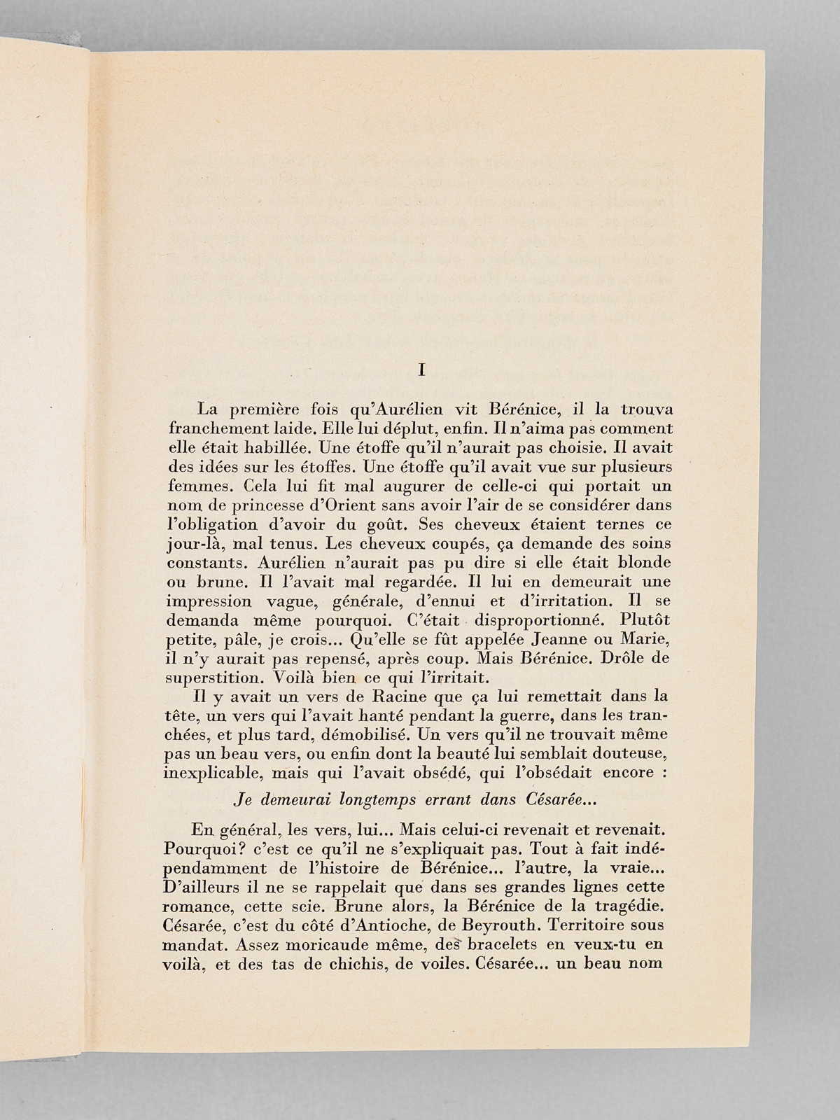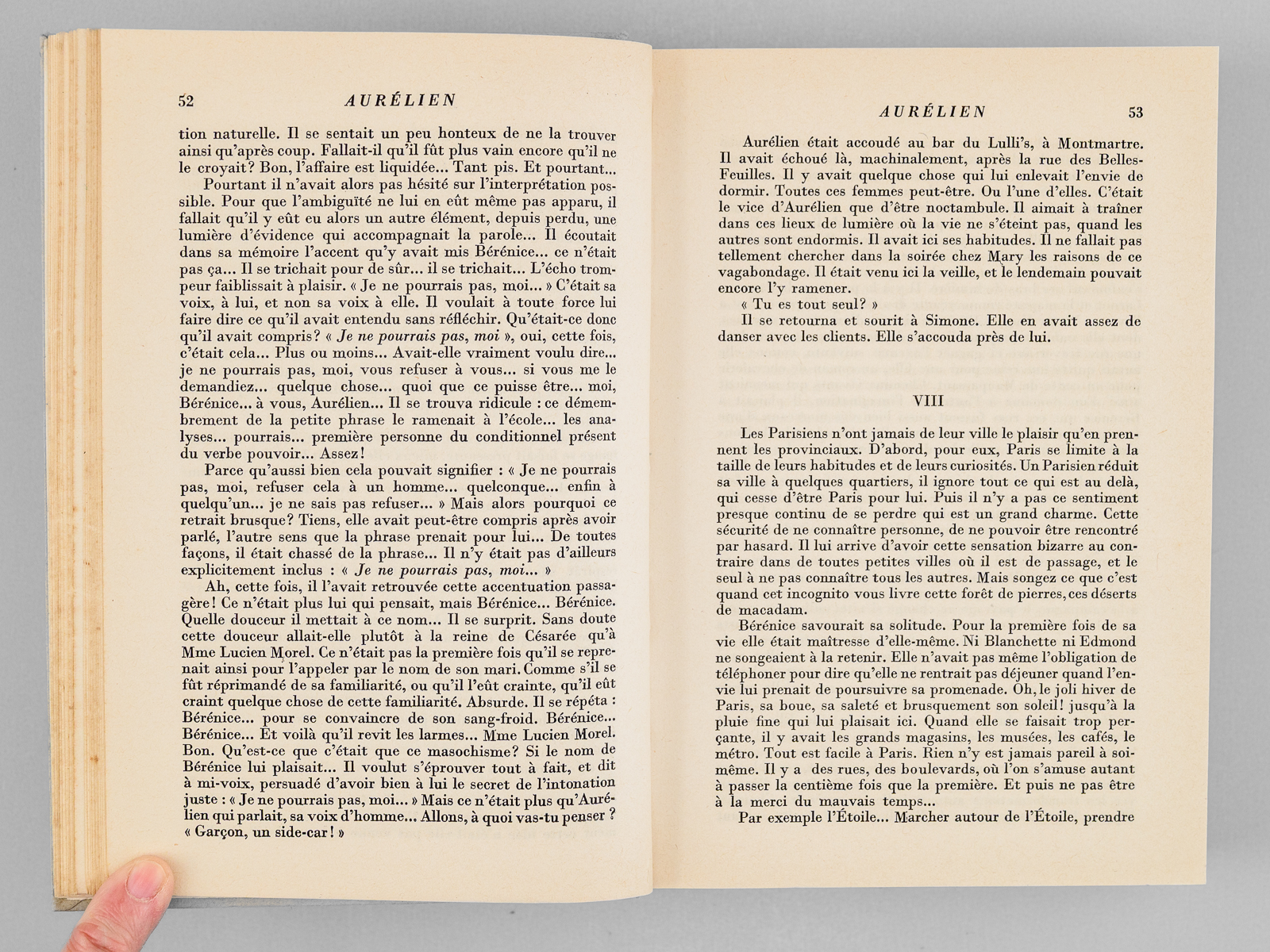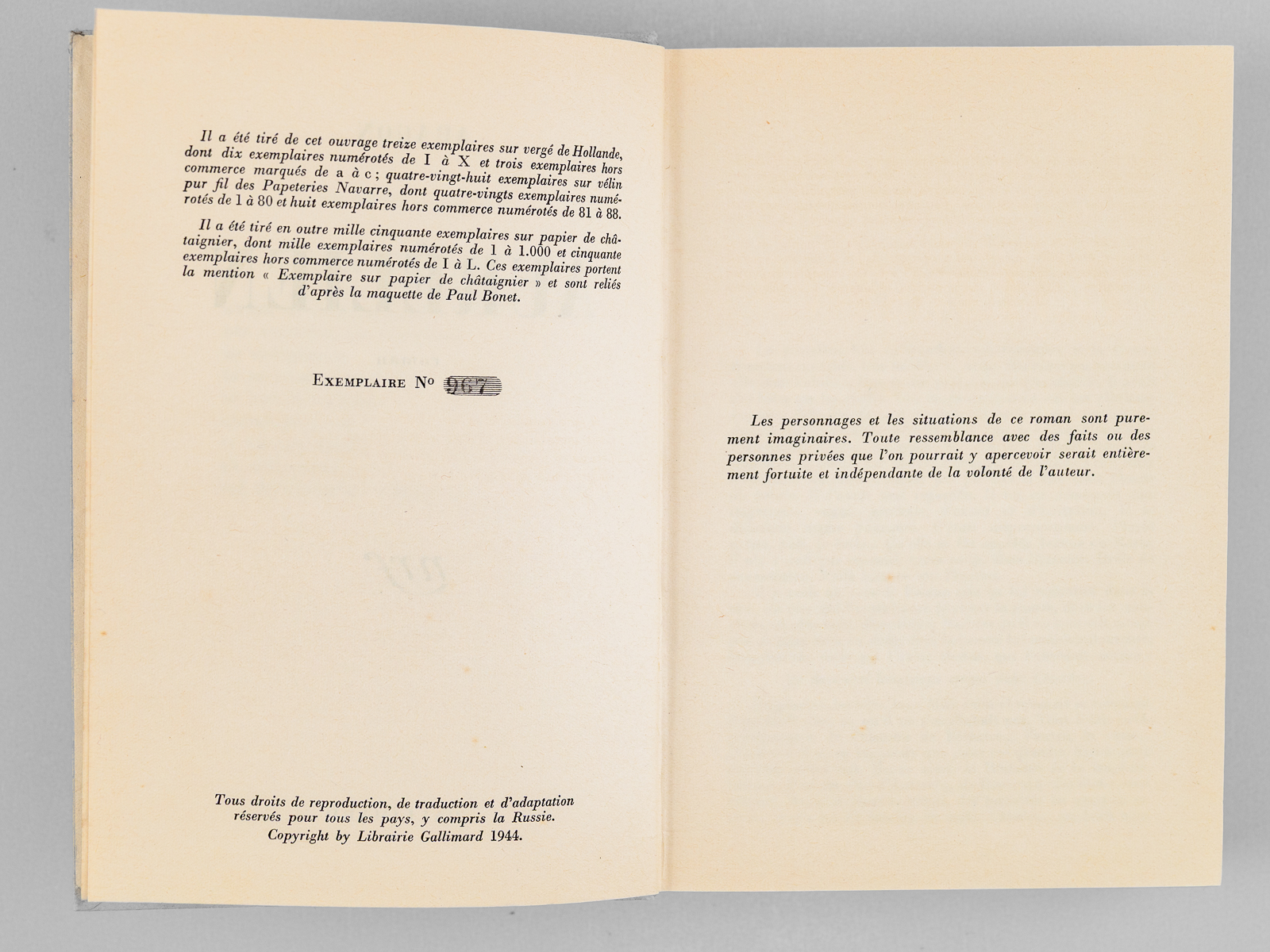 Un des 1050 exemplaires sur papier de châtaignier (n° 967), 1 vol. in-8 cartonnage éditeur d'après la maquette de Paul Bonet, NRF, Gallimard, Paris, s.d. [ 1944 ], 519 pp. Commentaire : La mention 'exemplaire sur châtaignier' est absente comme à l'habitude, ainsi que le signale Jean-Etienne Huret. Etat très satisfaisant (anciennes traces d'adhésif en garde, bon état par ailleurs). Huret, 23