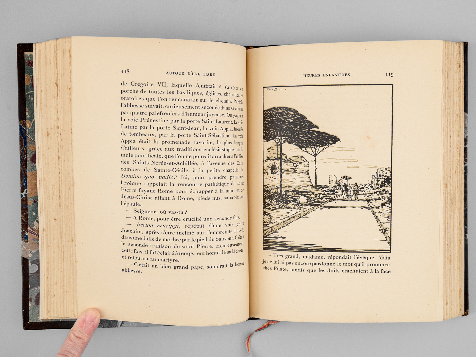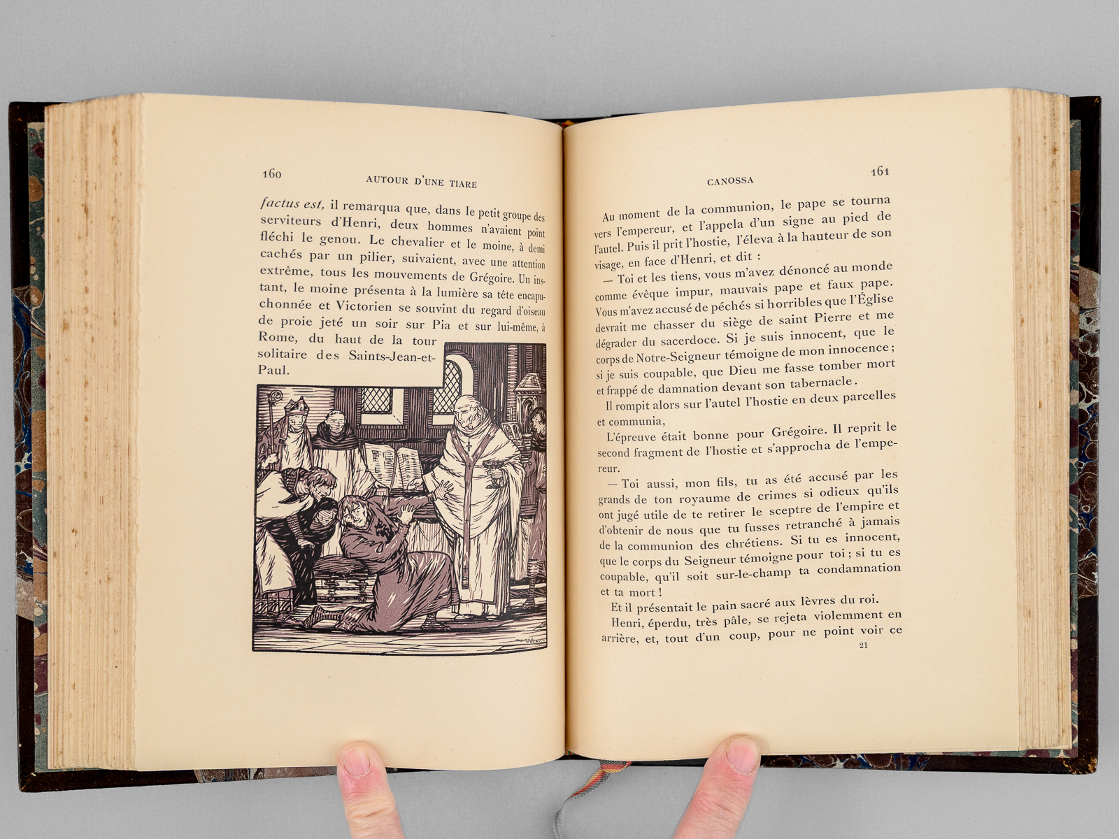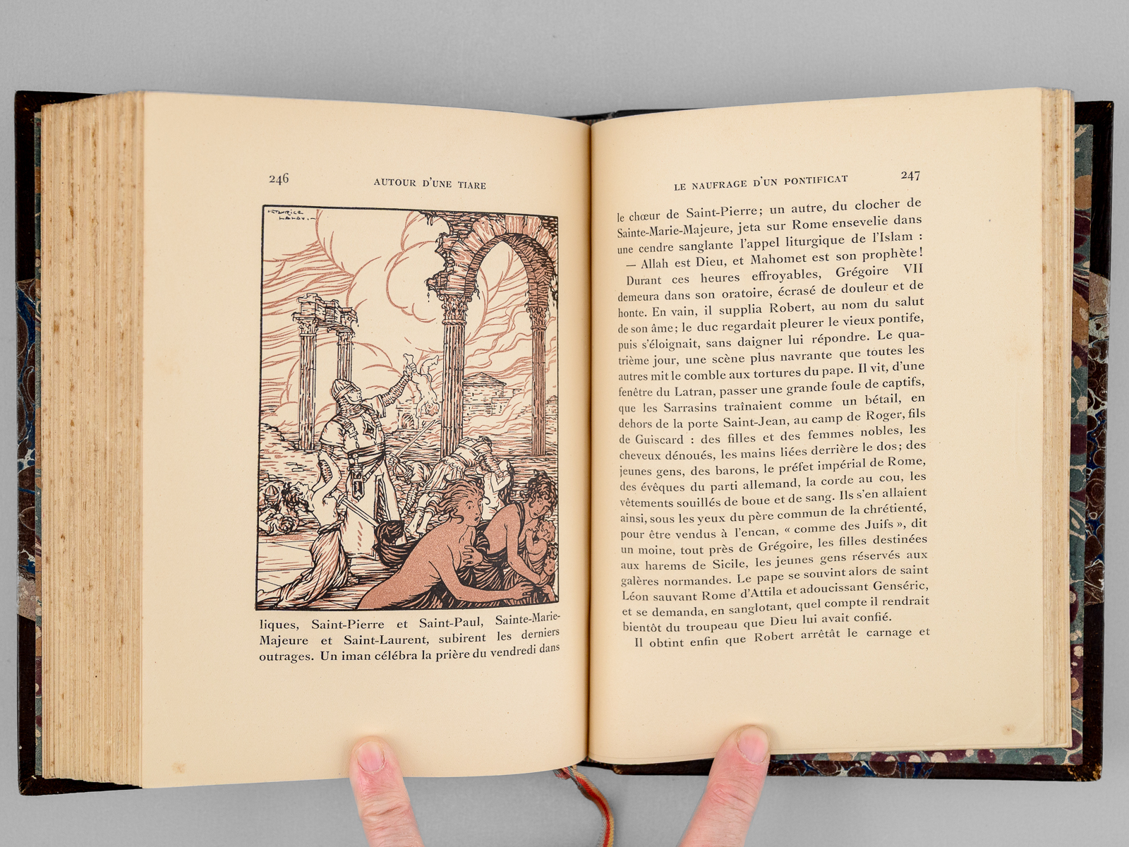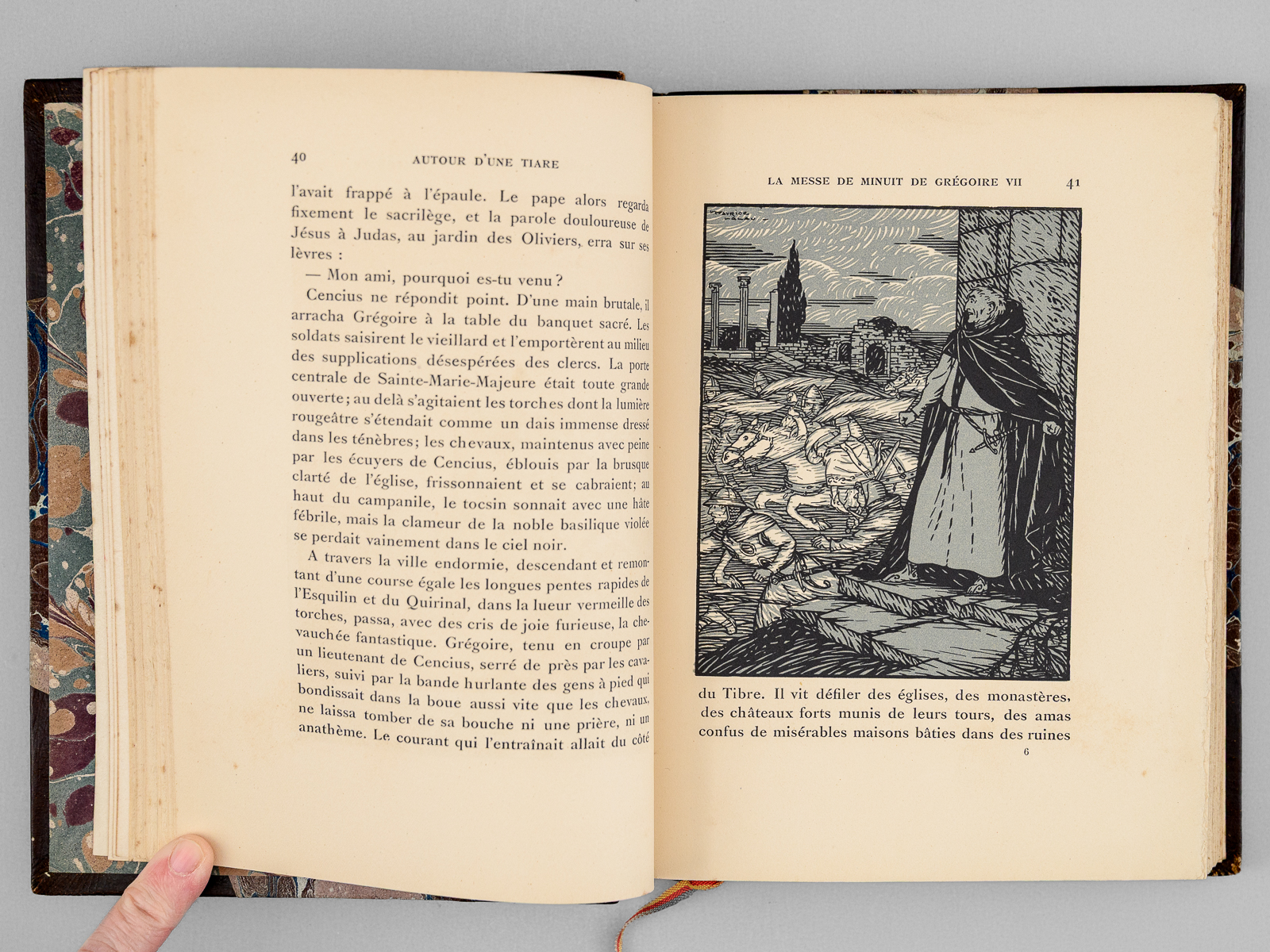 Commentaire : Bon exemplaire très bien relié de ce célèbre roman historique de l'historien de la Renaissance et du Moyen Âge Emile Gebhart, dans lequel il retrace le conflit du pape Grégoire VII et de l'Empereur Henri IV, et évoque la pénitence de Canossa, jusqu'à la mort du pape en exil à Salerne. Les illustrations de Maurice Lalau sont splendides.