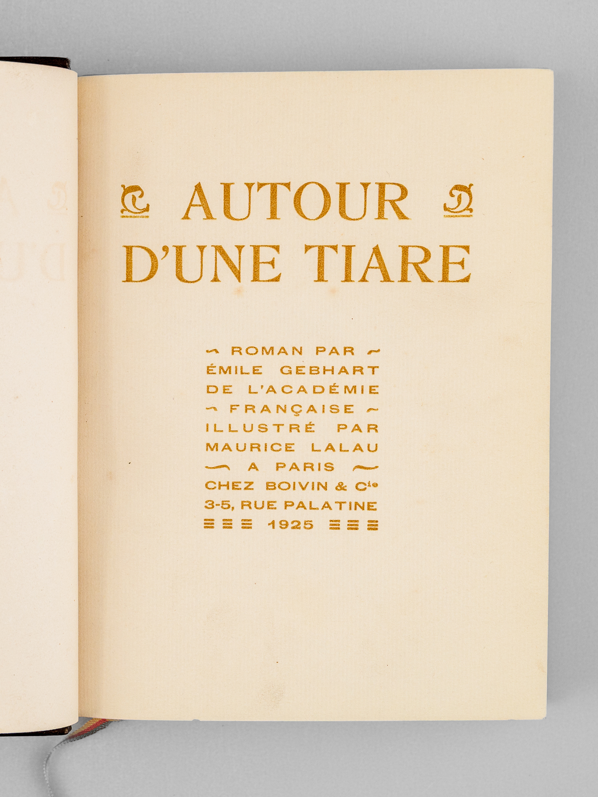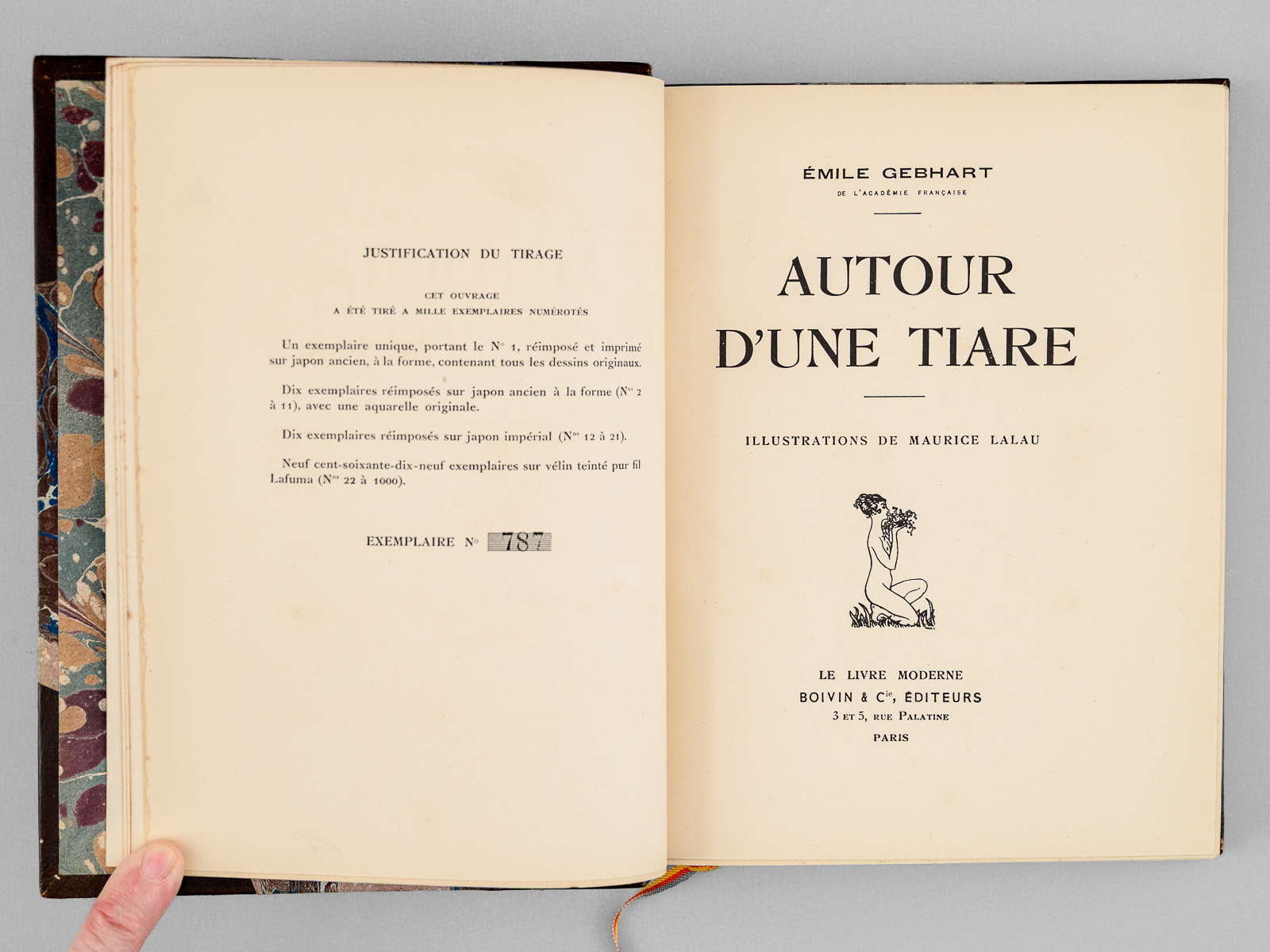 Illustrations de Maurice Lalau, Exemplaire n°787 sur vélin teinté, 1 vol. petit in-8 reliure demi-maroquin à grain long brun à coins, dos à 4 nerfs richement ornés, tête dorée, couvertures et dos conservés, Le Livre Moderne, Boivin & Cie, Éditeurs, Paris, s.d. [ 1925 ], 282 pp.