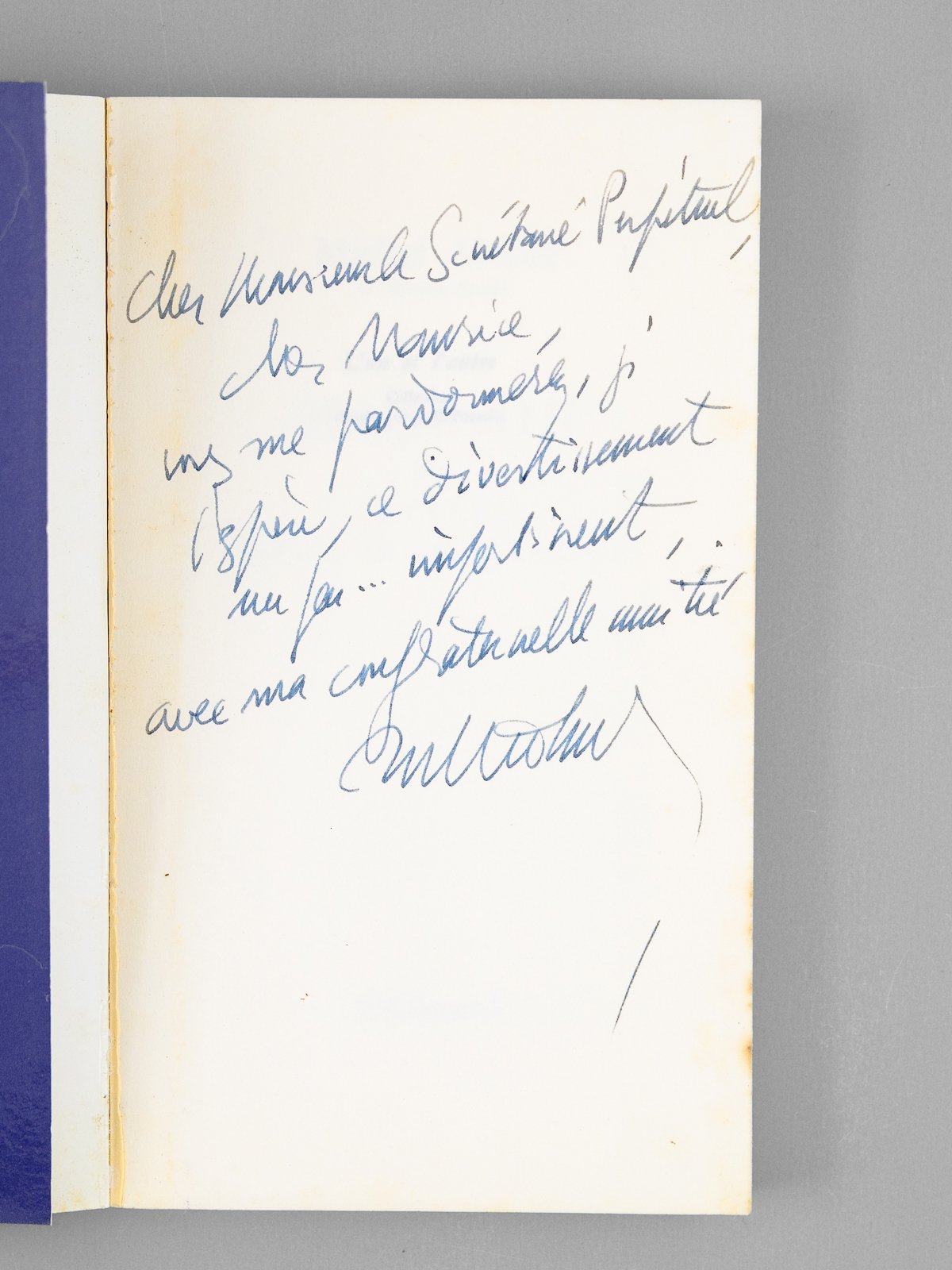 Envoi ms. de l'auteur, 1 vol. petit in-8 br. sous jaquette illustrée, Gallimard, Paris, 1989, 145 pp. Commentaire : L'exemplaire est enrichi d'un bel envoi à Maurice Druon : 'Cher Monsieur le Secrétaire Perpétuel, cher Maurice, vous me pardonnerez, j'espère, ce divertissement un peu... impertinent, avec ma confraternelle amitié'. Romancier, écrivain et historien de la littérature, Michel Mohrt (1914-2011) fut élu en 1985 membre de l'Académie française au Fauteuil 33, le fauteuil de Voltaire, où il succède à Marcel Brion. Bon état (légères rouss. sur tranche en tête). Comme à son habitude, Maurice Druon a plié l'angle de deux feuillets qui avaient retenu son attention.