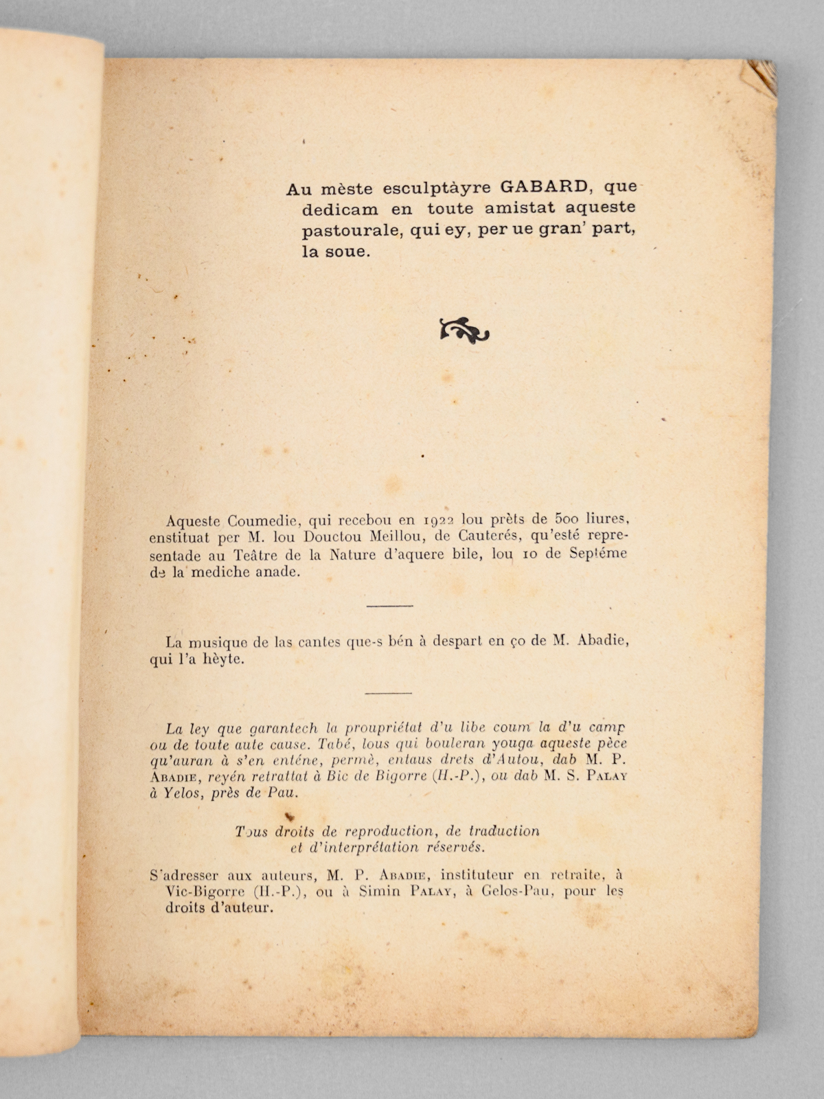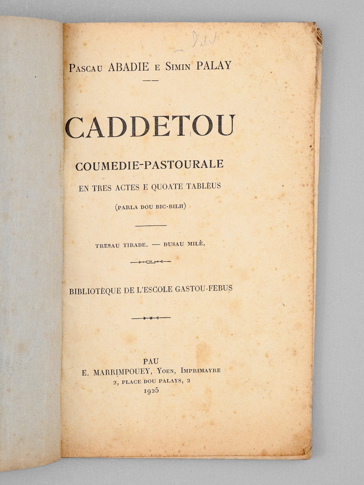 Tresau tirade. Dusau milè, 1 brochure in-12, Bibliotèque de l'Escole Gastou-Febus ; E. Marrimpouey, Yoen, Imprimayre, Pau, 1925, 77 pp Commentaire : Pascal Abadie était instituteur en retraite, à Vic-en-Bigorre. Etat très satisfaisant (maladroite restauration ayant contrecollé la marge intérieure du feuillet de titre à la couverture). L'ouvrage est dédié au maître sculpteur Gabard (cette oeuvre qui est en grande part la sienne...). Pic, Bibliographie de Simin Palay, 82