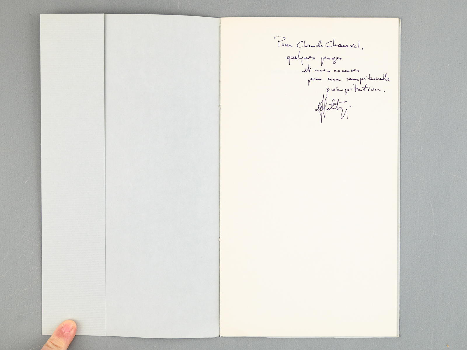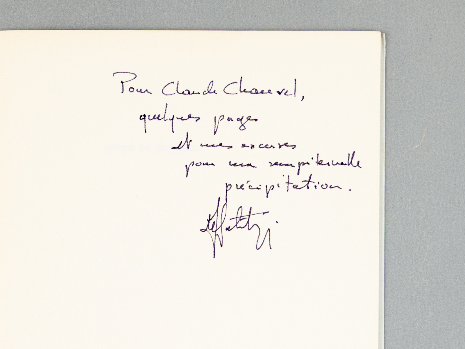 Un des 300 exemplaires sur vergé de Hollande (après 80 Arches numérotés), 1 vol. in-8 étroit, William Blake & Co. Edit., 1988, 8 pp. Commentaire : Bel envoi de l'auteur. Bon état.