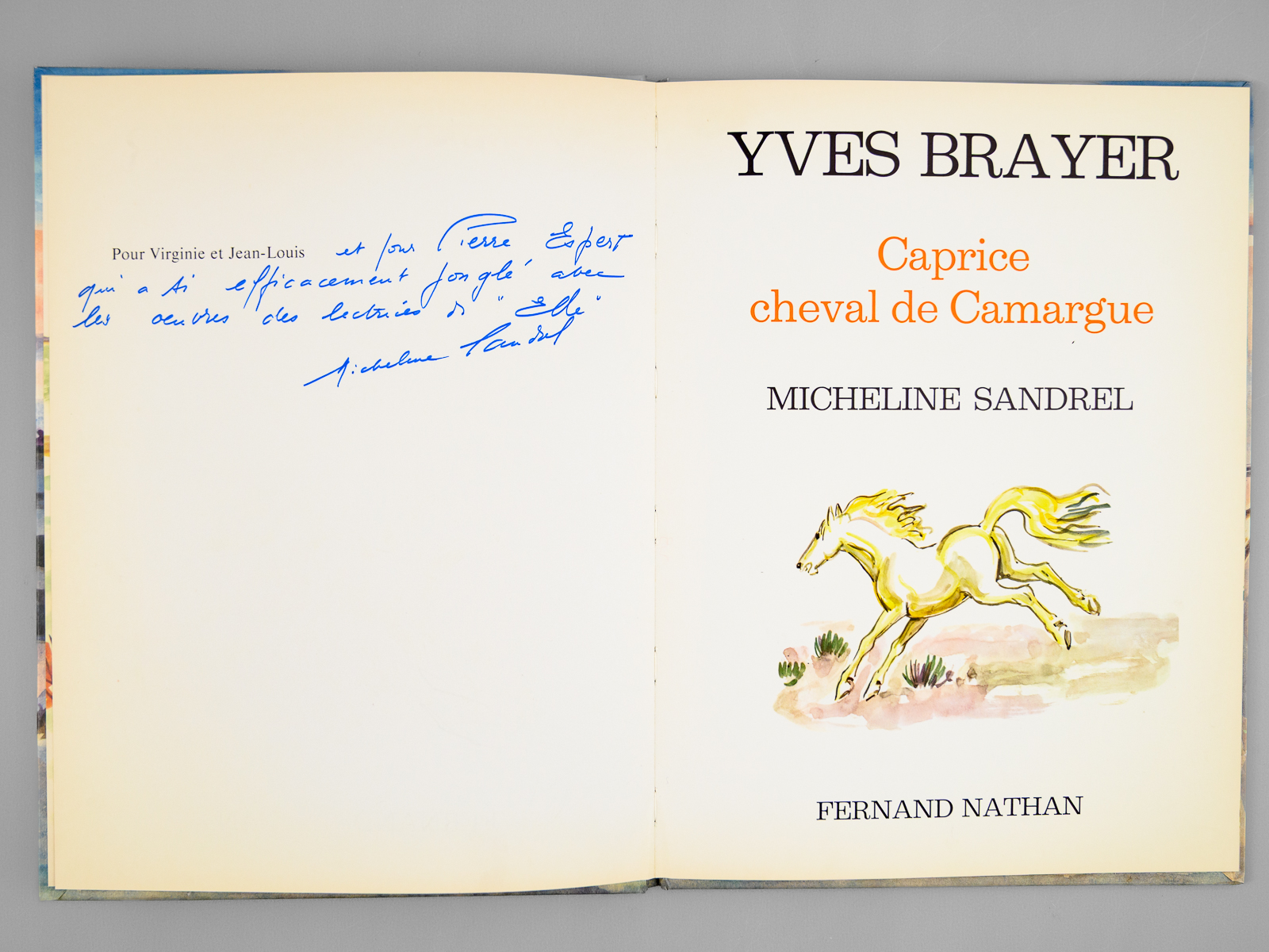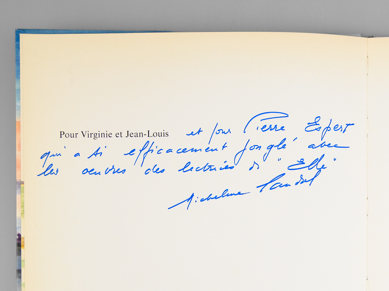 1 vol. in-4 cartonnage éditeur illustré, Fernand Nathan, Paris, s.d. [1975], 14 ff. Commentaire : Bel envoi de Micheline Sandrel 'pour Pierre Espert qui a si efficacement jonglé avec les oeuvres des lectrices de 'Elle''.
