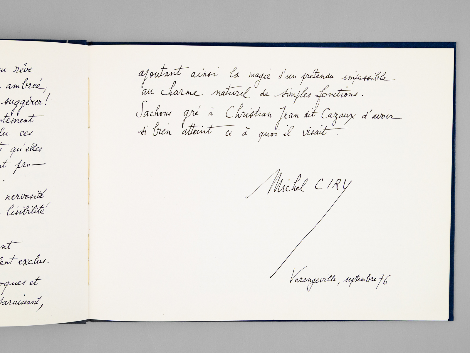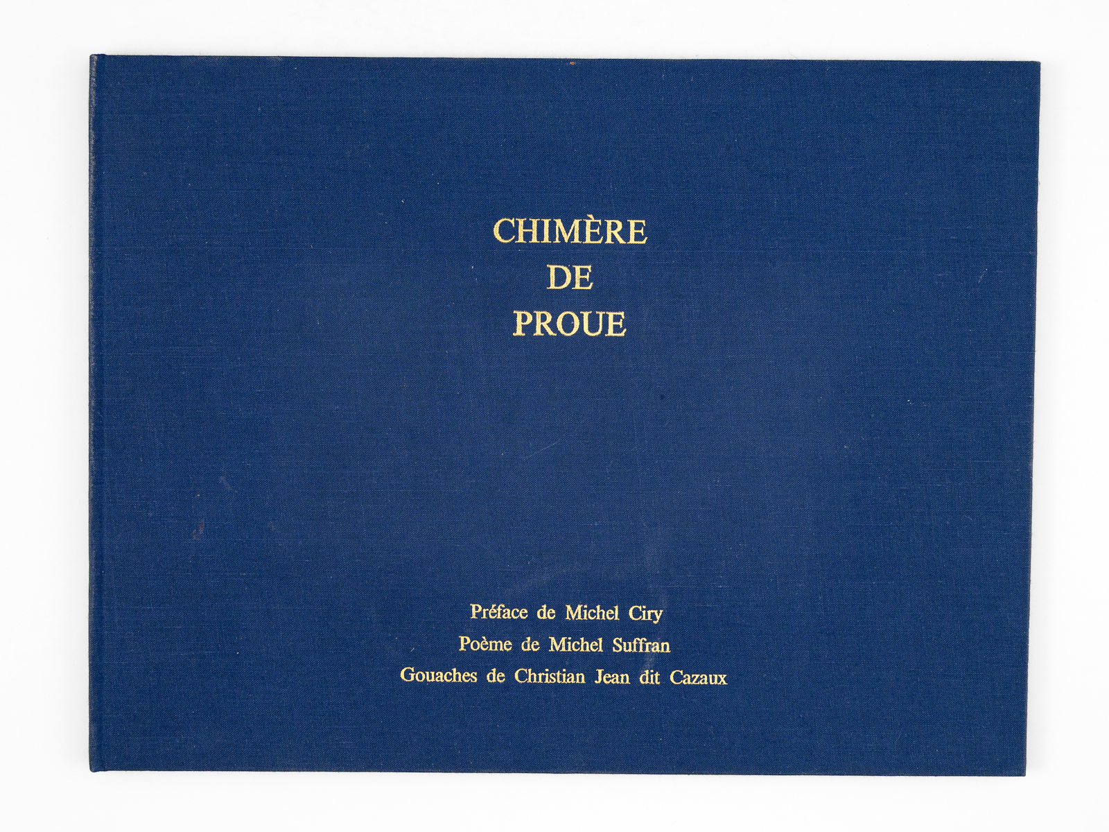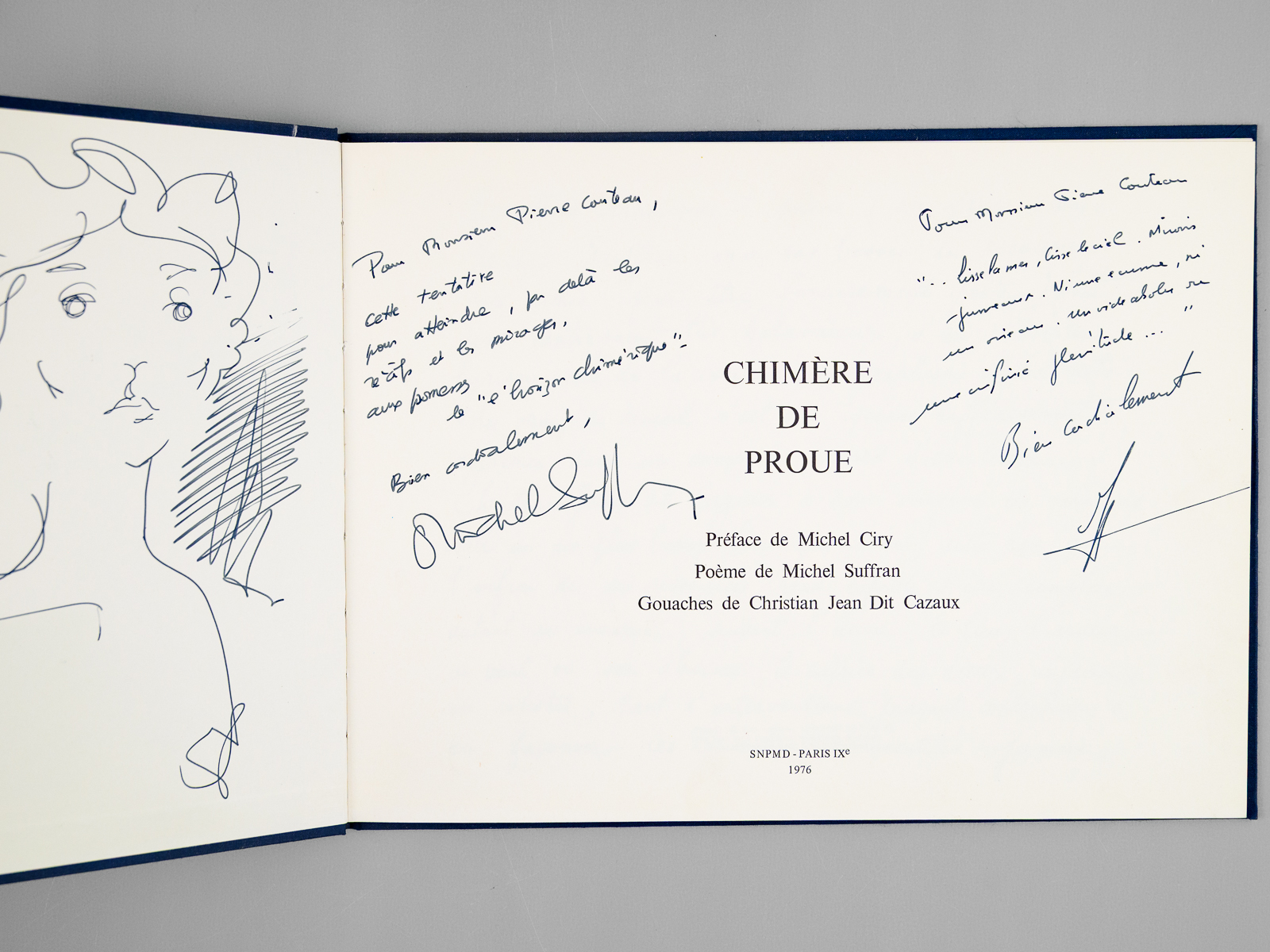 Préface de Michel Ciry, Poème de Michel Suffran, Gouaches de Christian Jean dit Cazaux, 1 vol. in-4 format à l'italienne reliure pleine toile bleue, SNMPD, Paris, 1976 Commentaire : Bon exemplaire enrichi d'un double envoi de l'auteur et de l'illustrateur, et d'un beau dessin de Michel Suffran (qq. notes et soulignements au crayon).