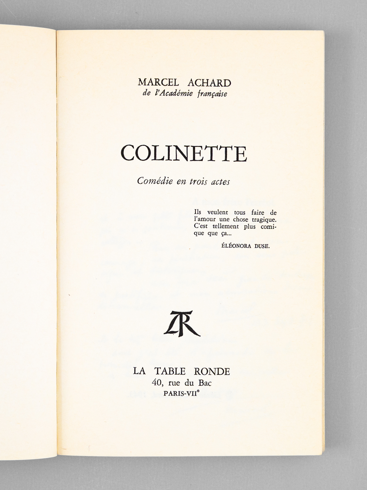 Colinette. Comédie en trois actes [ Livre dédicacé par l'auteur à Maurice Druon ]