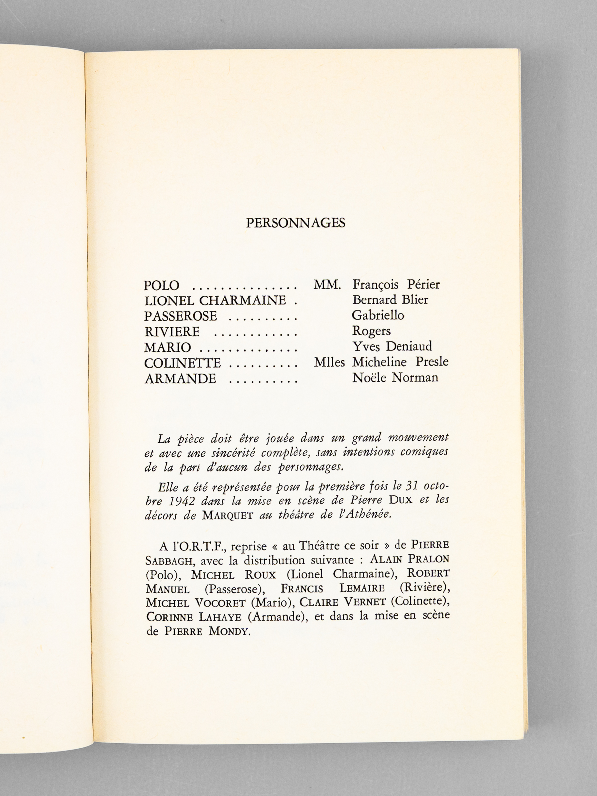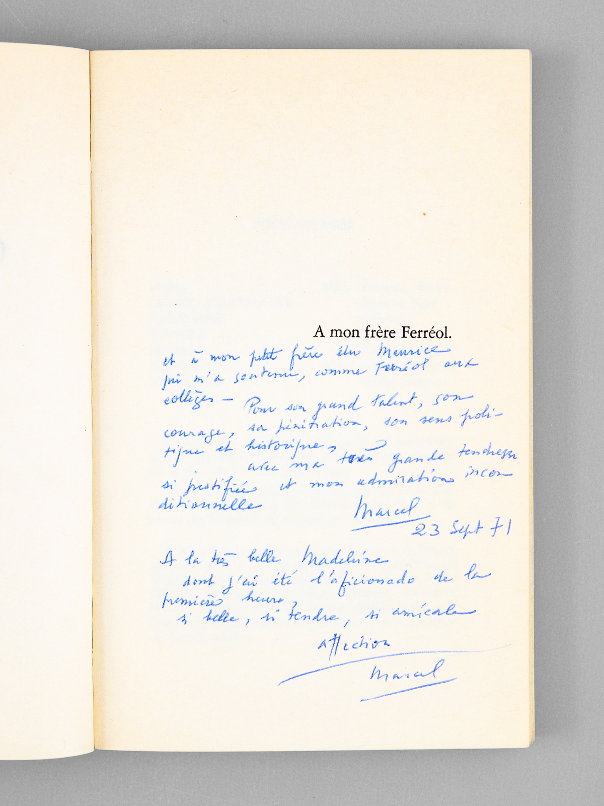 1 vol. in-12 br., La Table Ronde, Paris, 1971, 171 pp. Commentaire : Superbe envoi de Marcel Achard ''A mon frère Ferréol' et à mon petit frère élu Maurice qui m'a soutenu, comme Ferréol aux collèges. Pour son grand talent, son courage, sa pénétration, son sens politique et historique, avec ma très grande tendresse si justifie et mon admiration inconditionnelle. A la très belle Madeleine dont j'ai été l'aficionado de la première heure, si belle, si tendre, si amicale. Affection'. De la bibliothèque du grand écrivain Maurice Druon, Secrétaire Perpétuel de l'Académie Française de 1985 à 1999 et confrère de l'académicien Marcel Achard.